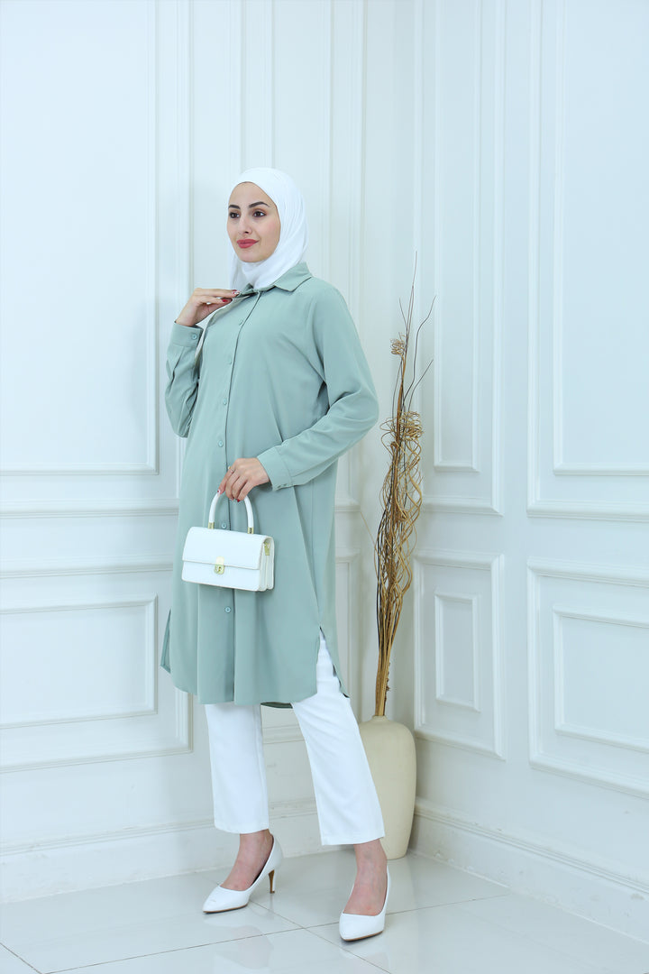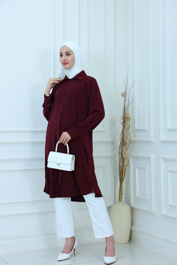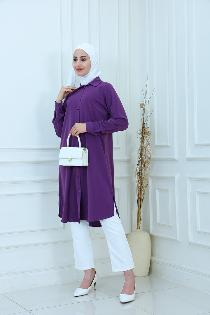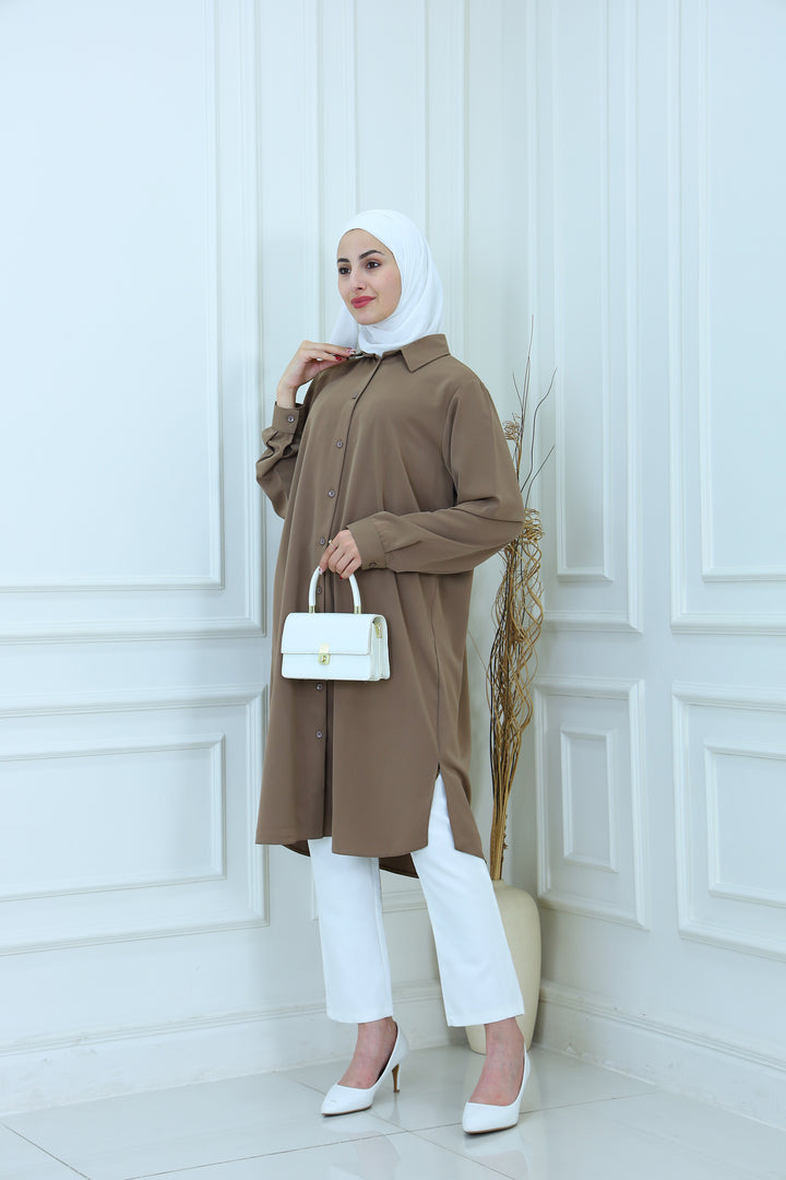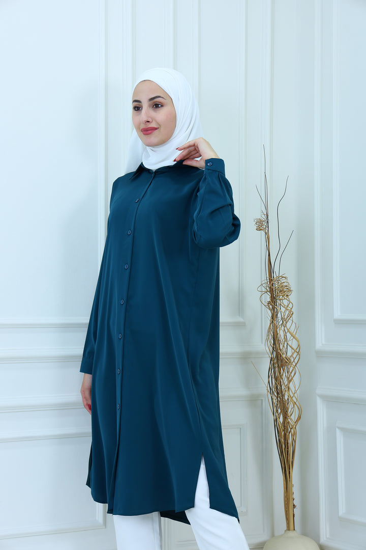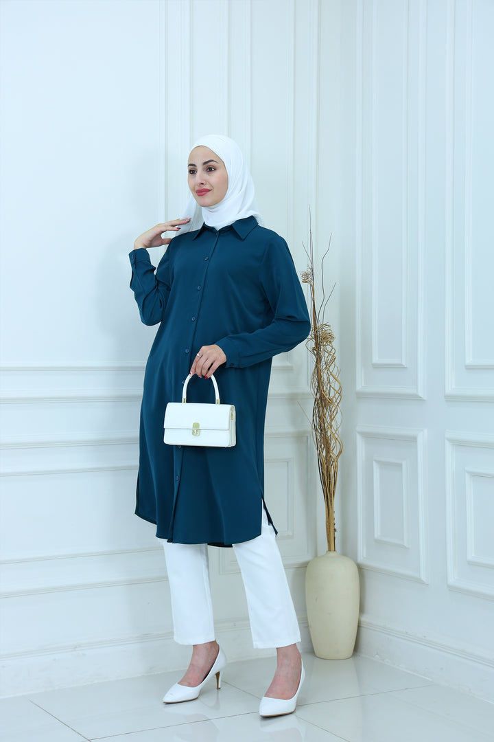 Elevate your everyday style with our Elegant Modest Longline Shirt. Designed for comfort and elegance, this loose-fit, long-sleeve shirt features a clean front placket, subtle side slits, and a graceful silhouette that's perfect for both casual and formal occasions. Made from breathable, lightweight fabric, it's ideal for layering or standalone wear