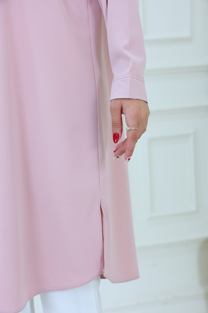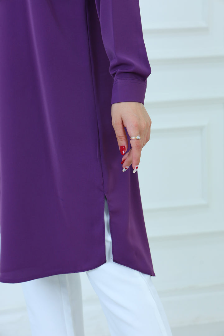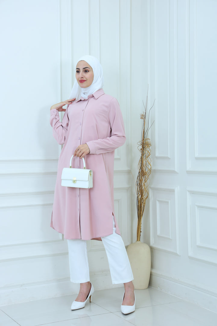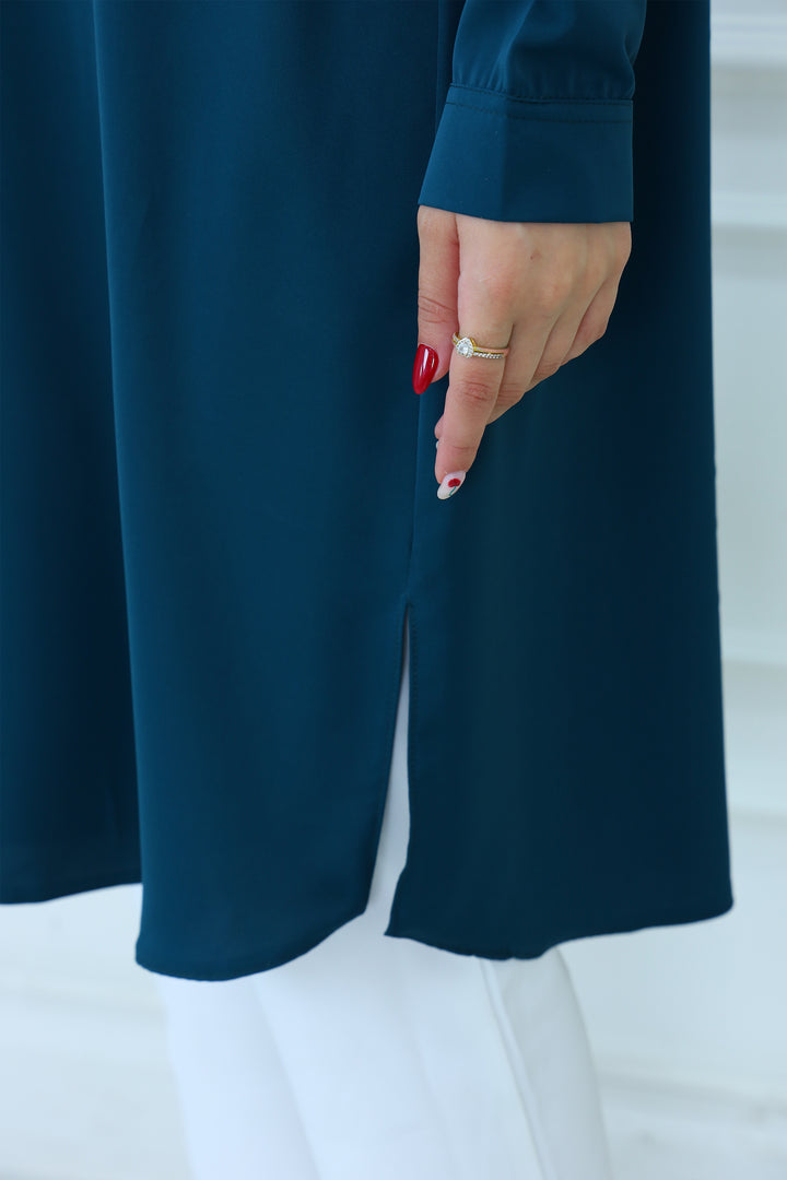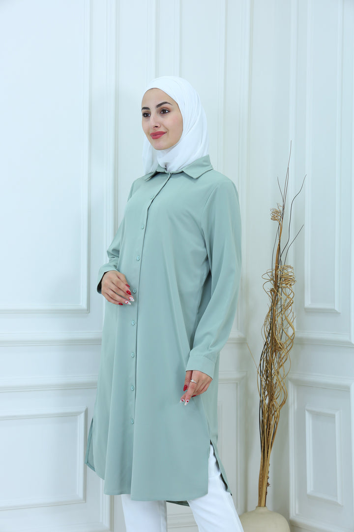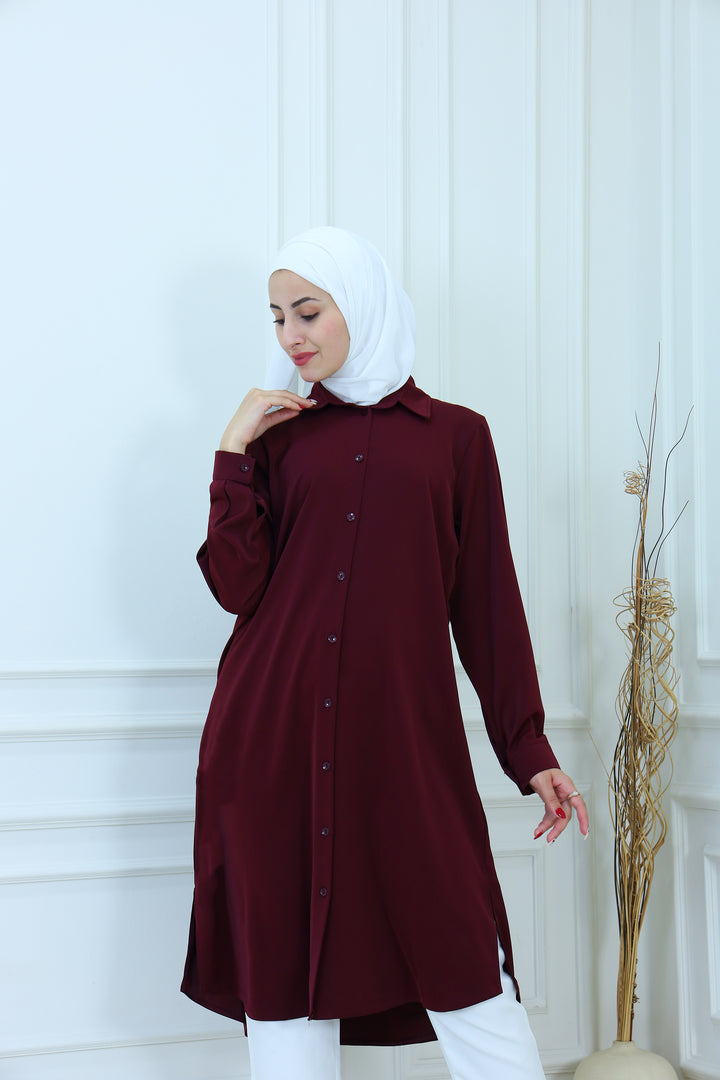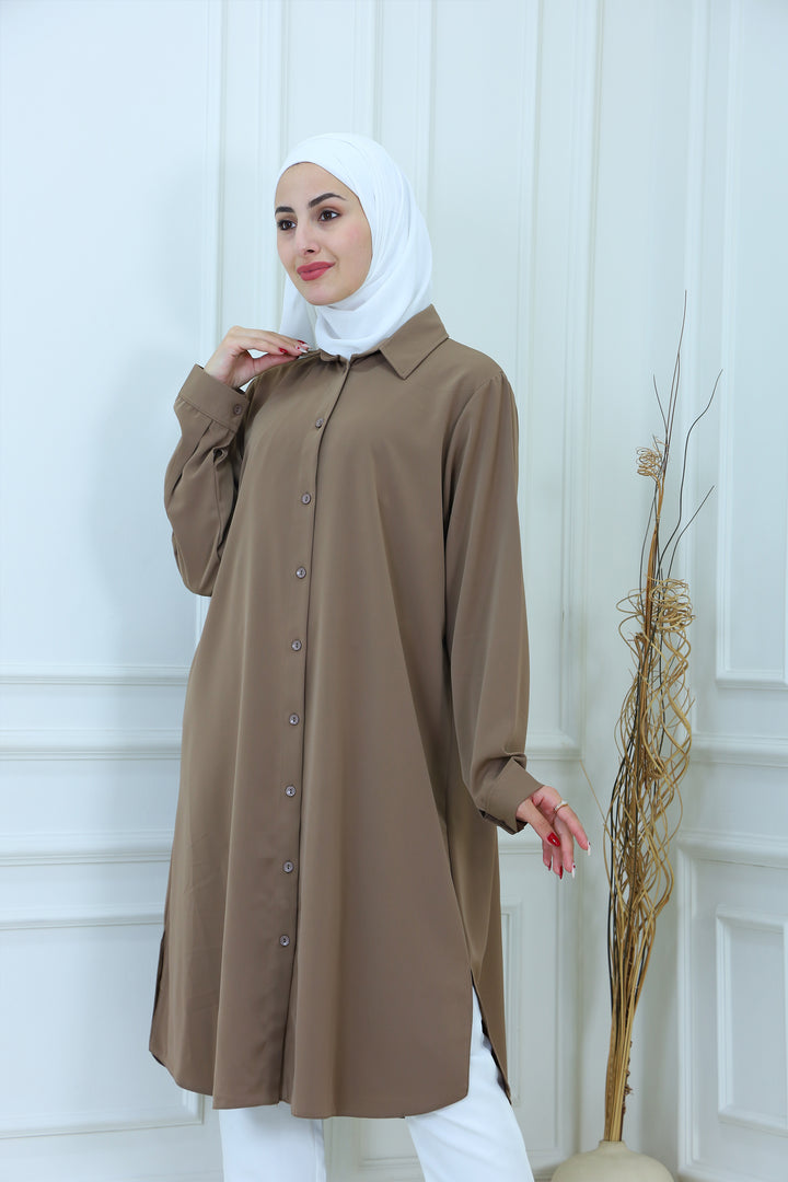 Elevate your everyday style with our Elegant Modest Longline Shirt. Designed for comfort and elegance, this loose-fit, long-sleeve shirt features a clean front placket, subtle side slits, and a graceful silhouette that's perfect for both casual and formal occasions. Made from breathable, lightweight fabric, it's ideal for layering or standalone wear