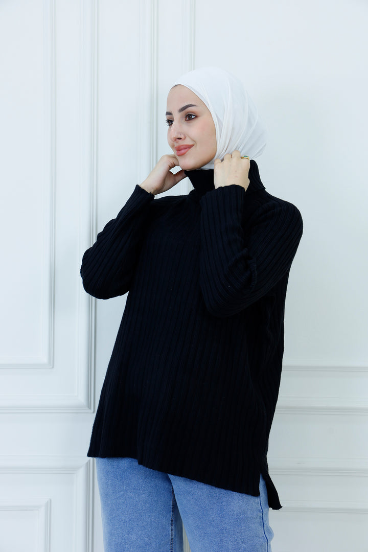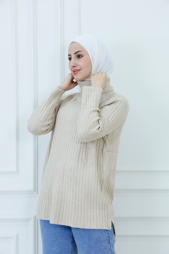 Stay cozy and chic in our Essential Ribbed Knit Turtleneck Sweater. This longline pullover features a classic ribbed texture and a warm, comfortable turtleneck for ultimate cold-weather style. The relaxed, modest fit is perfect for pairing with jeans or leggings, making it an ideal, versatile piece for your fall and winter layering.