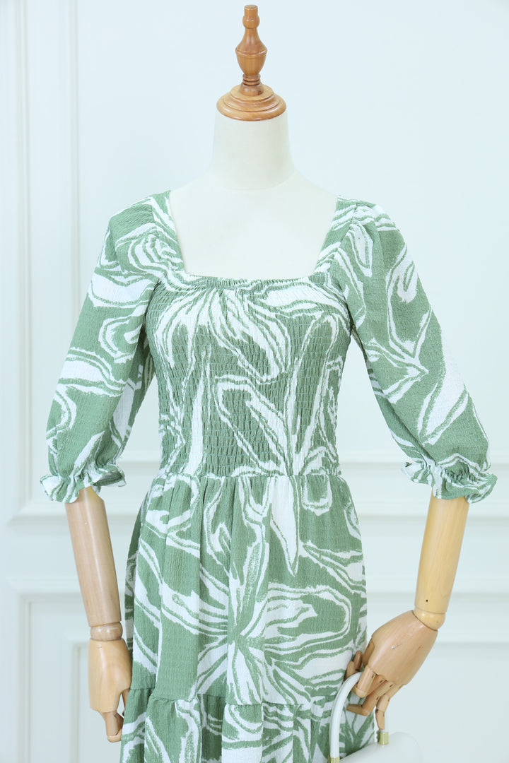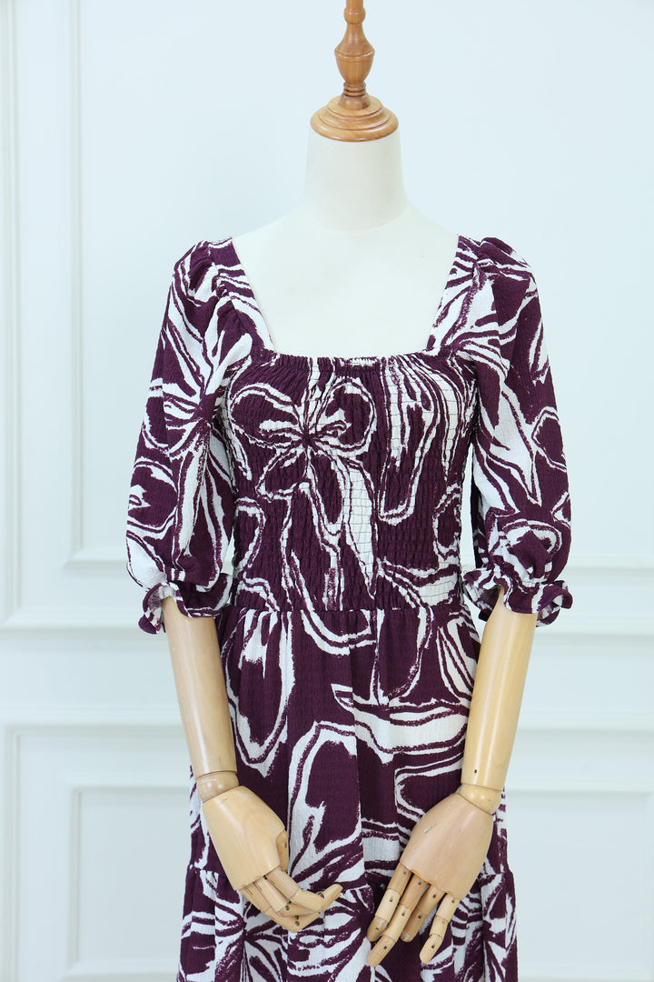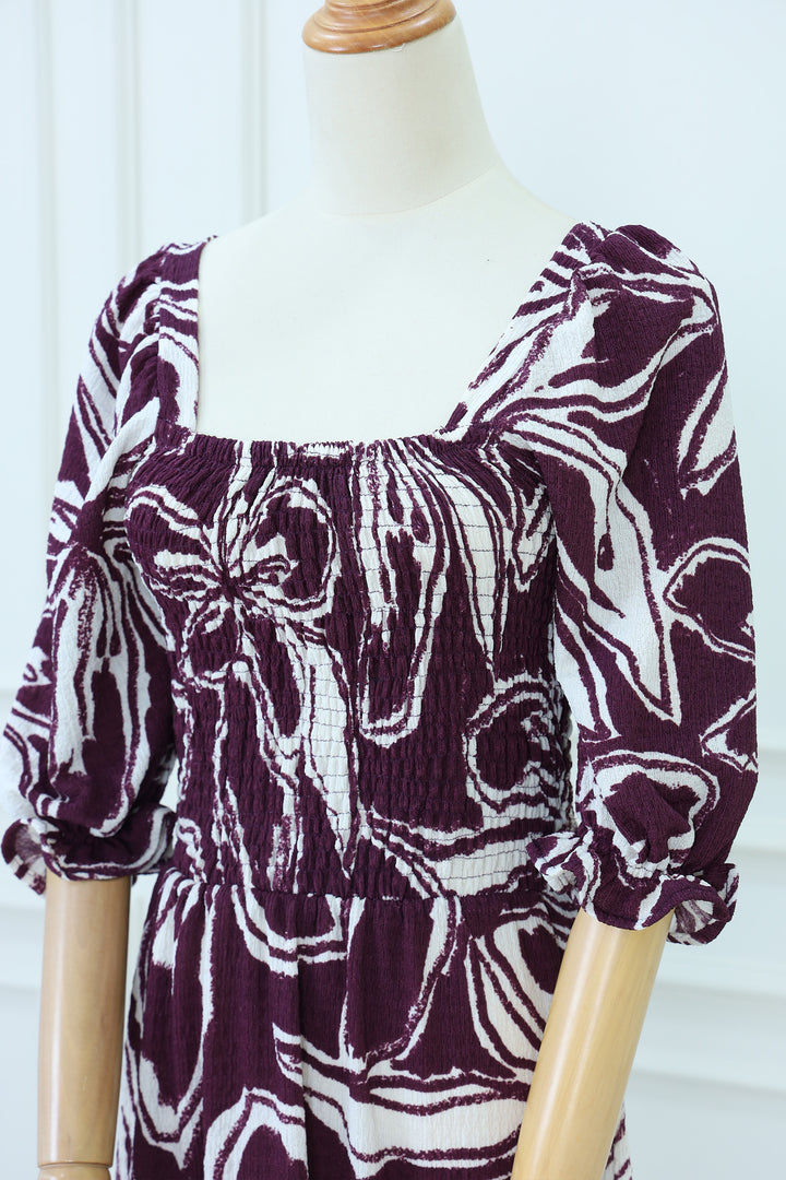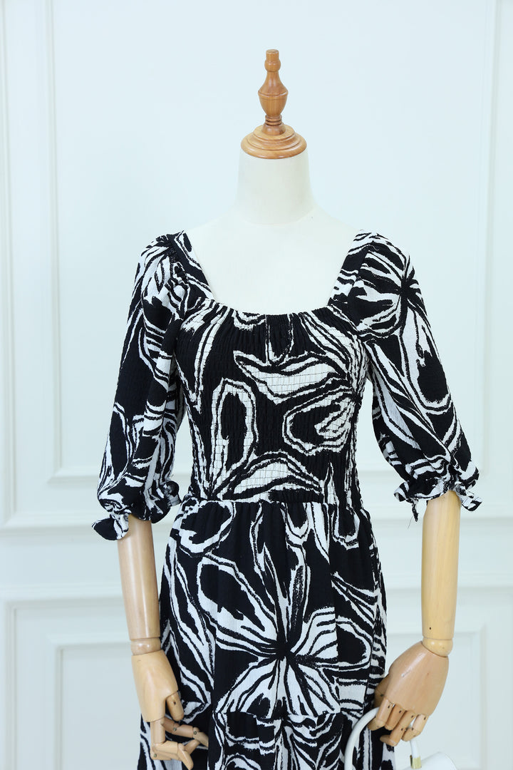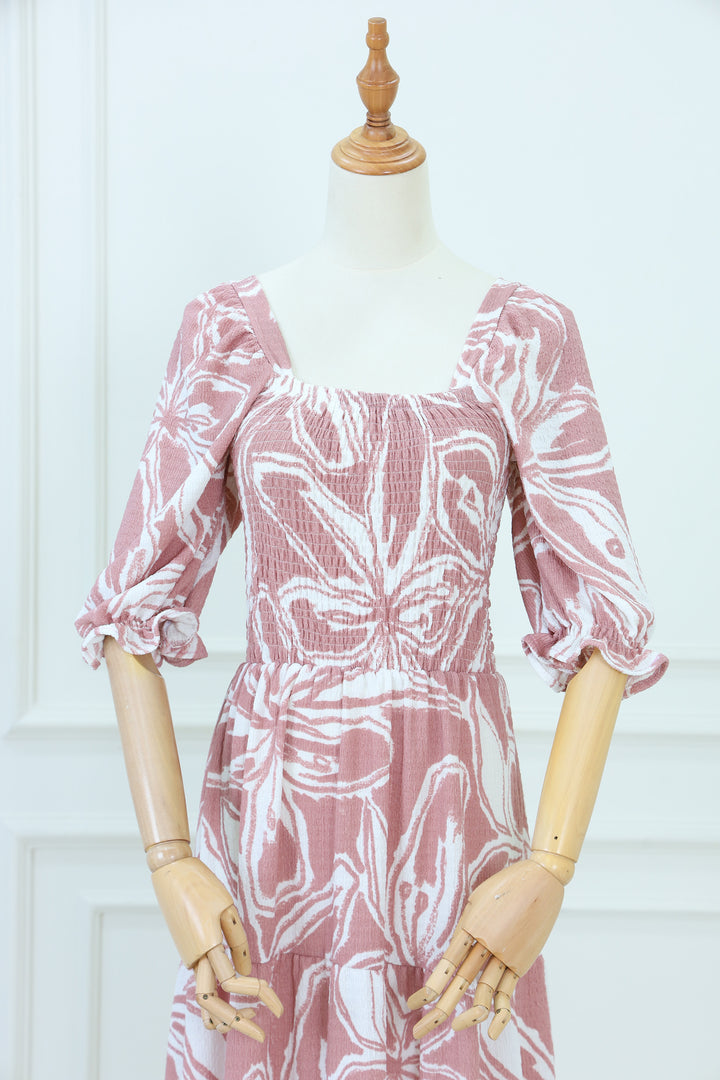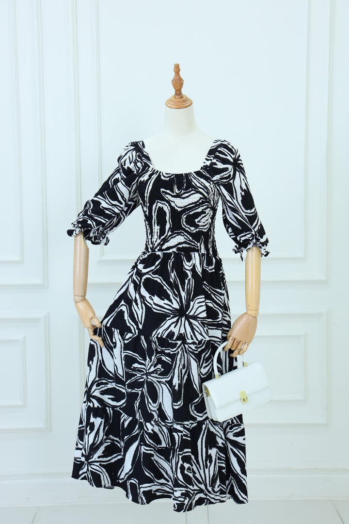 Details: Embrace effortless elegance with this midi dress featuring a bold floral pattern and square neckline. Designed with elastic puff sleeves and a flattering tiered skirt, it offers both comfort and style for casual outings or vacation wear. A versatile must-have for relaxed, chic wardrobes