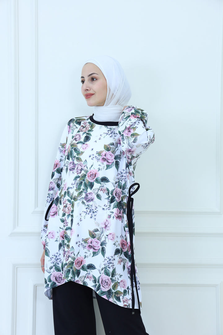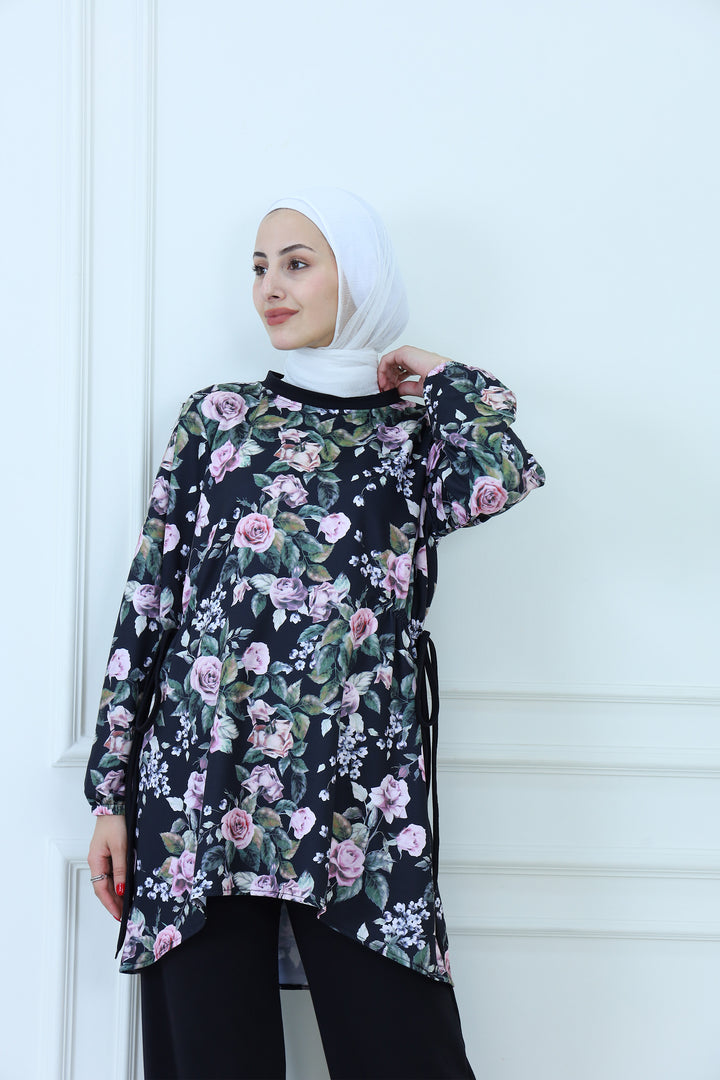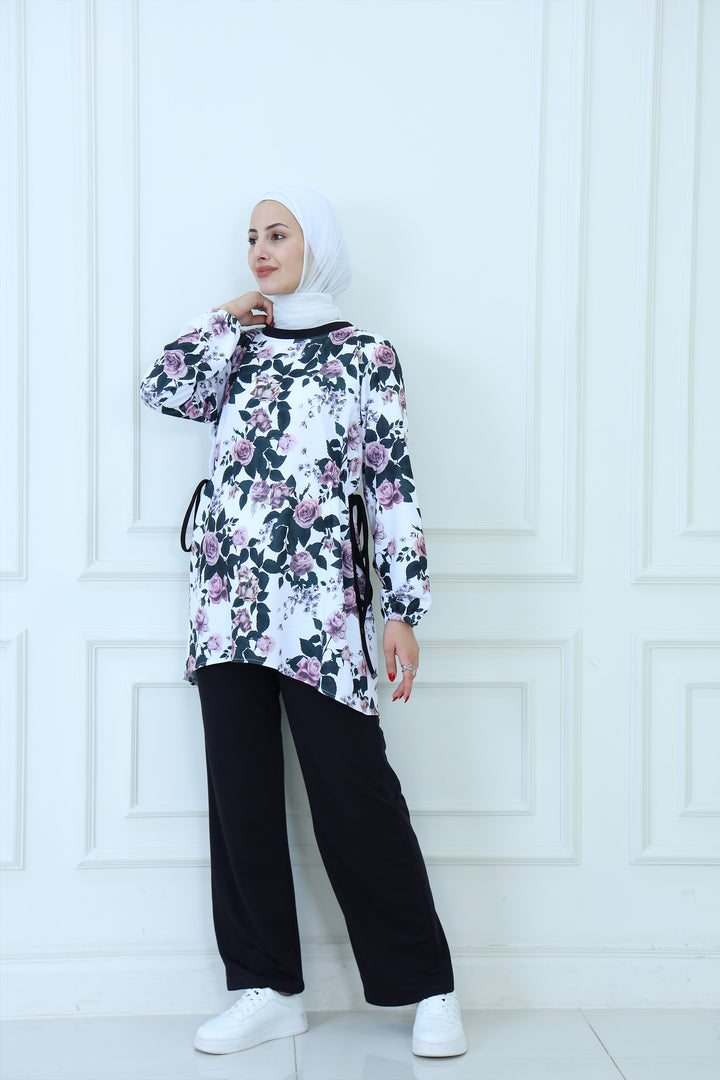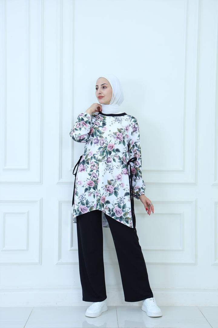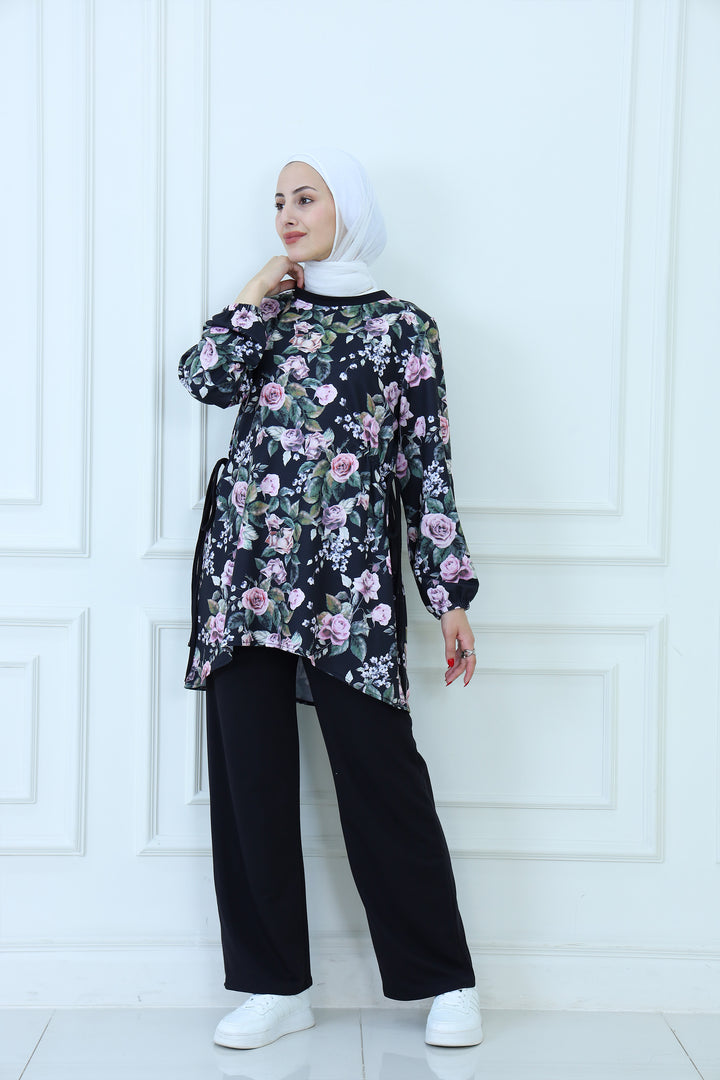 Details: Step out in style with this floral printed modest suit set, featuring a long floral tunic with side tie details and matching wide-leg black pants. Designed for comfort and elegance, this two-piece outfit is perfect for casual wear, office looks, or chic modest fashion styling. A versatile women’s floral suit that blends trend and practicality for everyday or semi-formal occasions