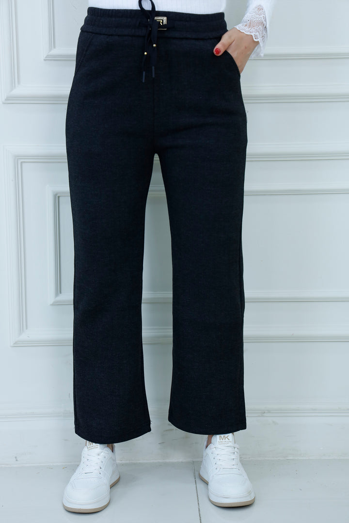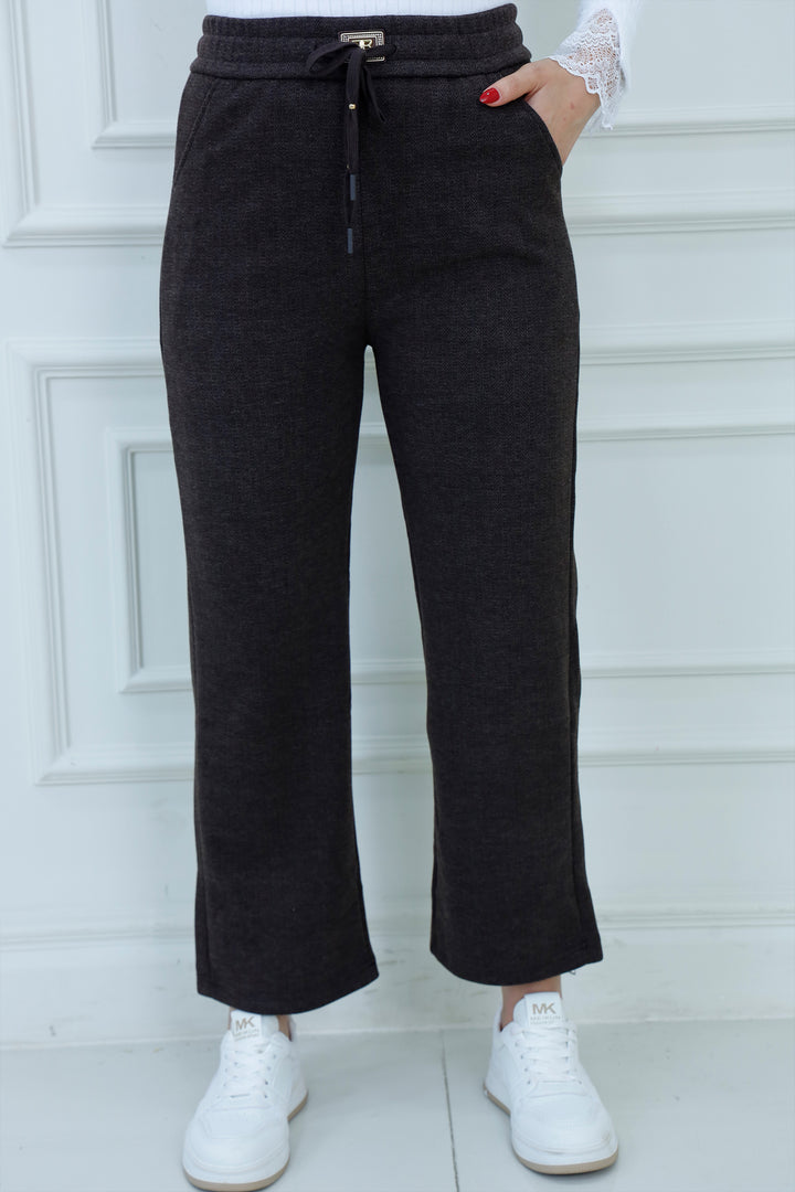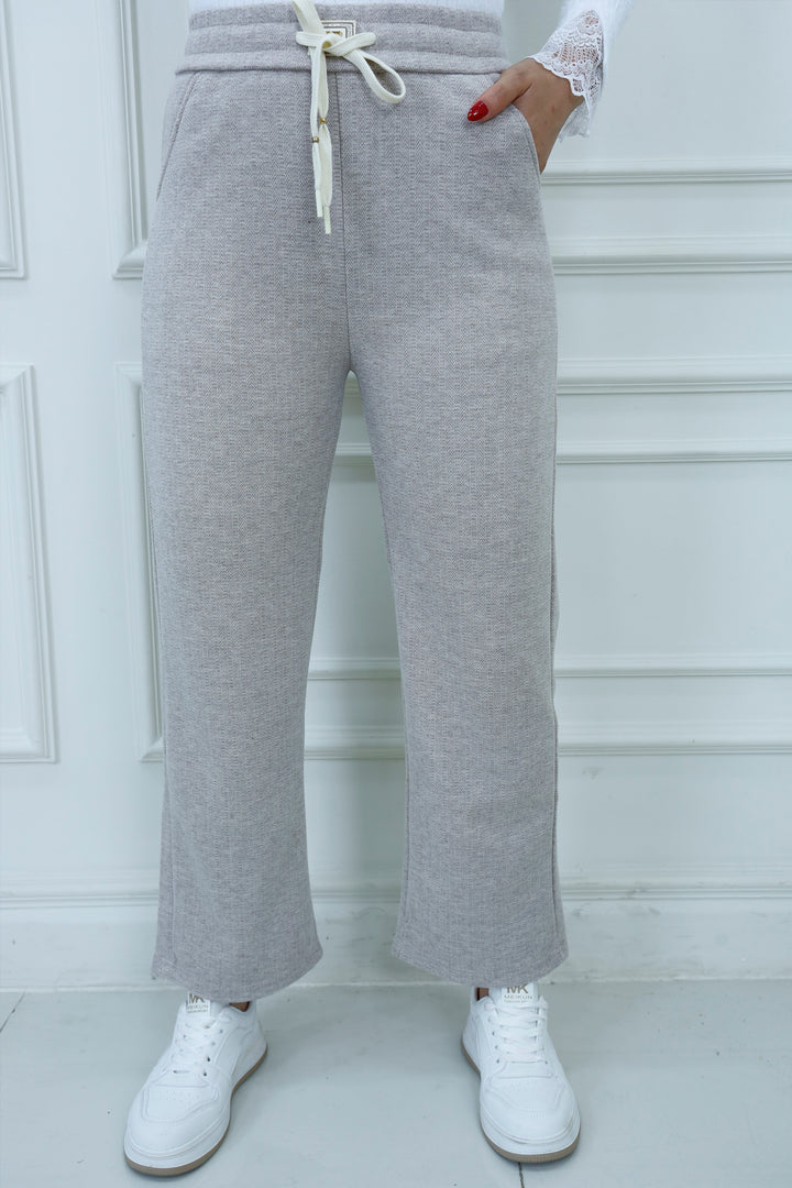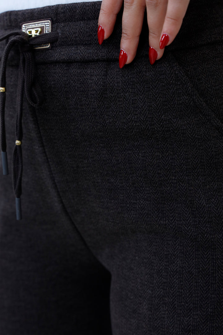 Refined comfort meets everyday style in our Herringbone Drawstring Pants. Crafted from a soft, textured fabric with a subtle herringbone weave, these pants offer a tailored look with the ease of loungewear. The elastic waistband features gold-tipped drawstrings and a decorative clasp detail for a polished finish. Ideal for casual outings, relaxed workdays, or pairing with modest tops and sneakers.