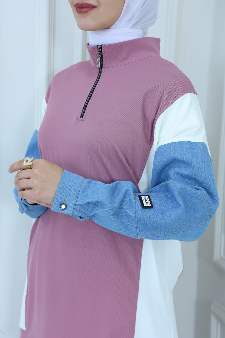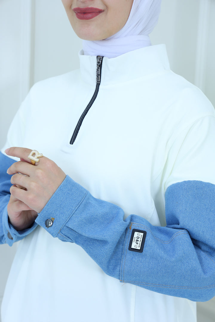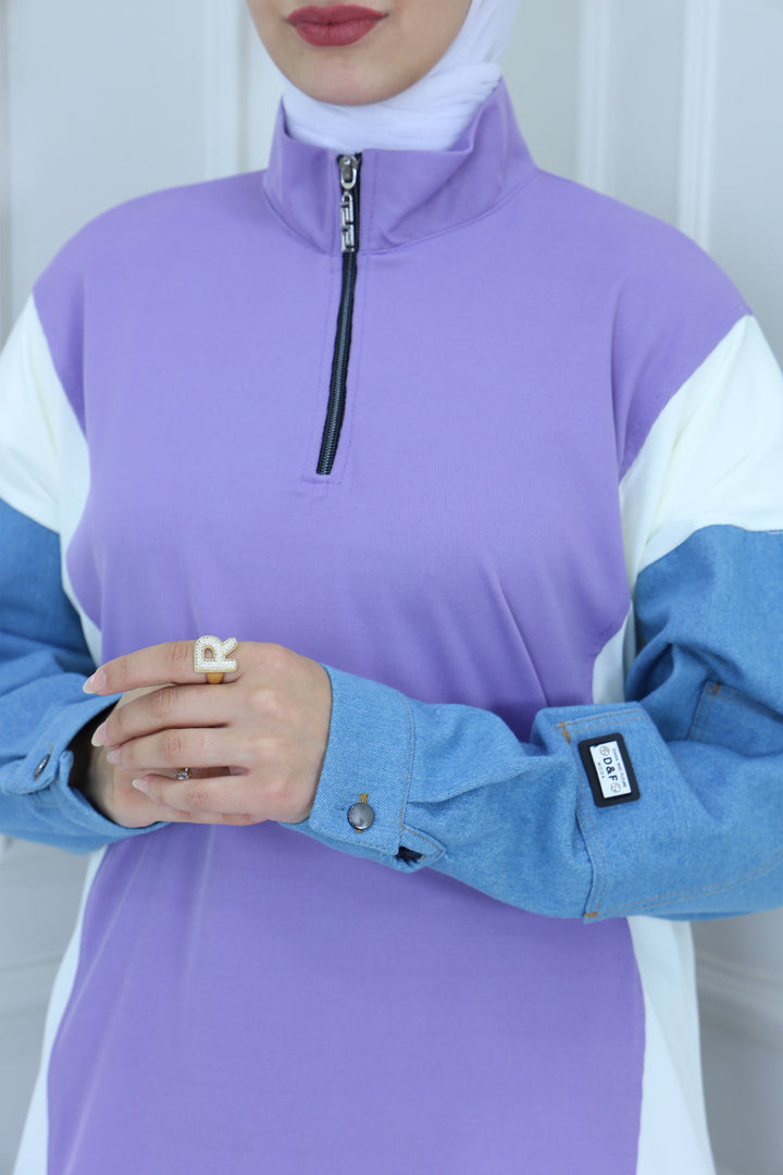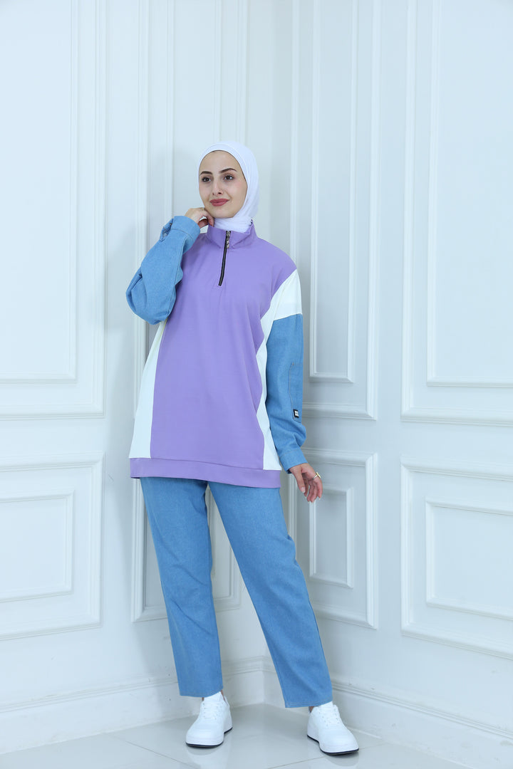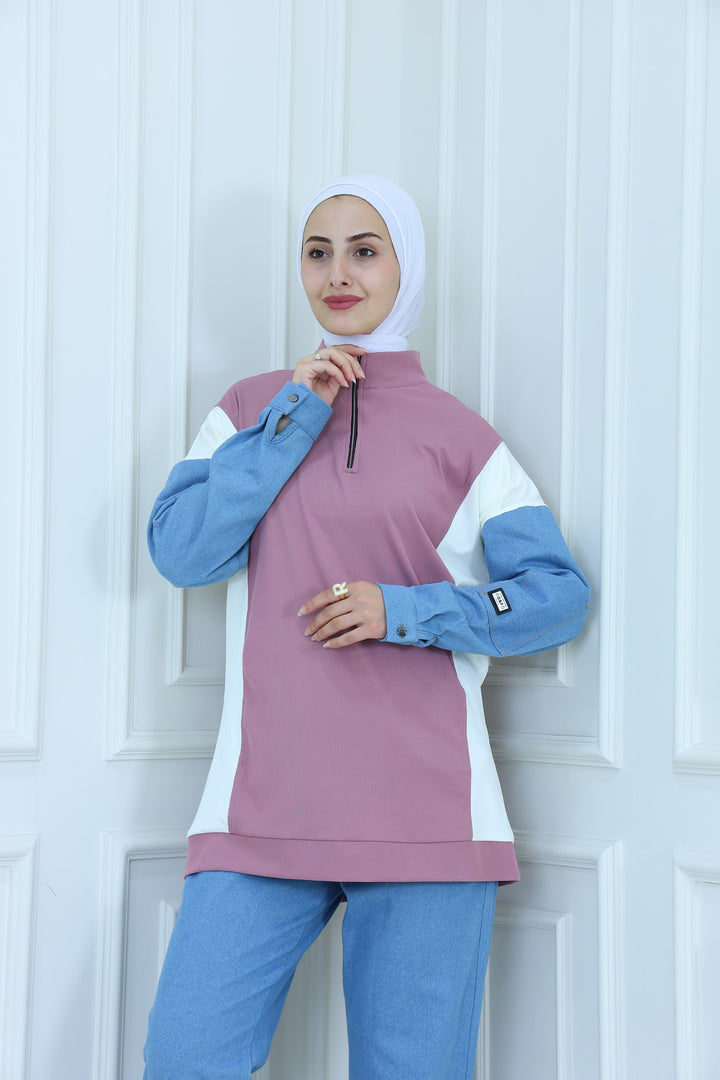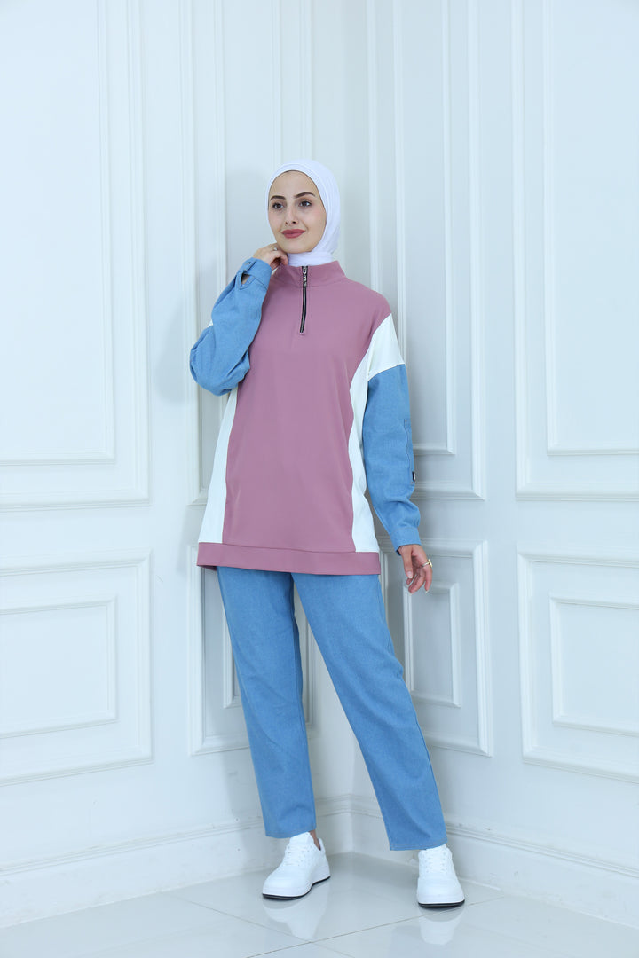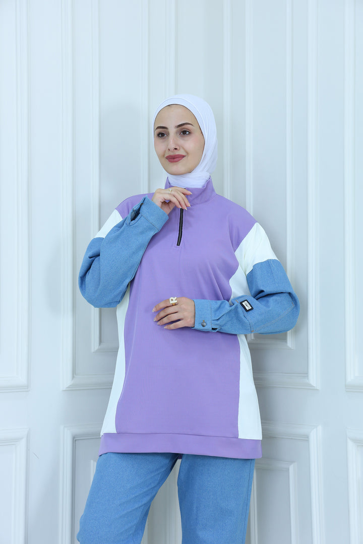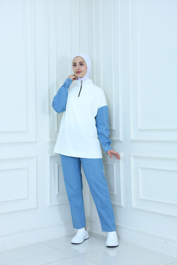 Details: Two-piece modest tracksuit featuring a jeans-look sleeves , paired with straight-fit jeans-style pants. A casual and stylish set combining comfort with a touch of jeans flair—perfect for everyday wear, errands, or relaxed outings