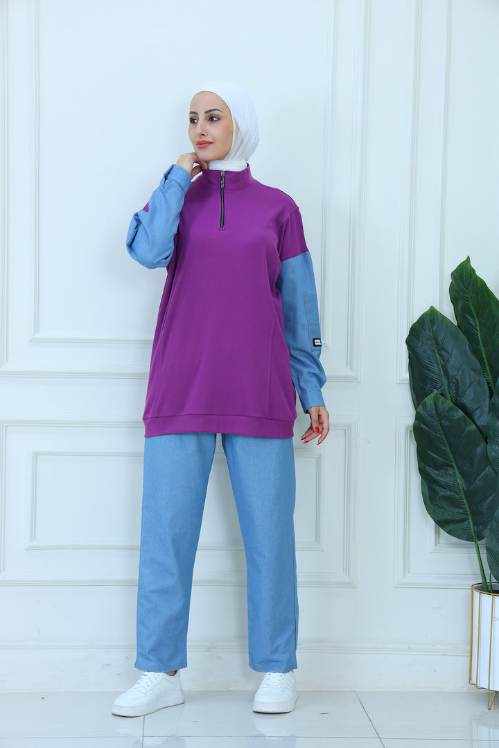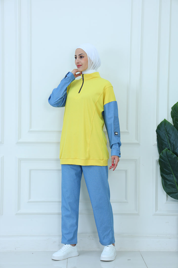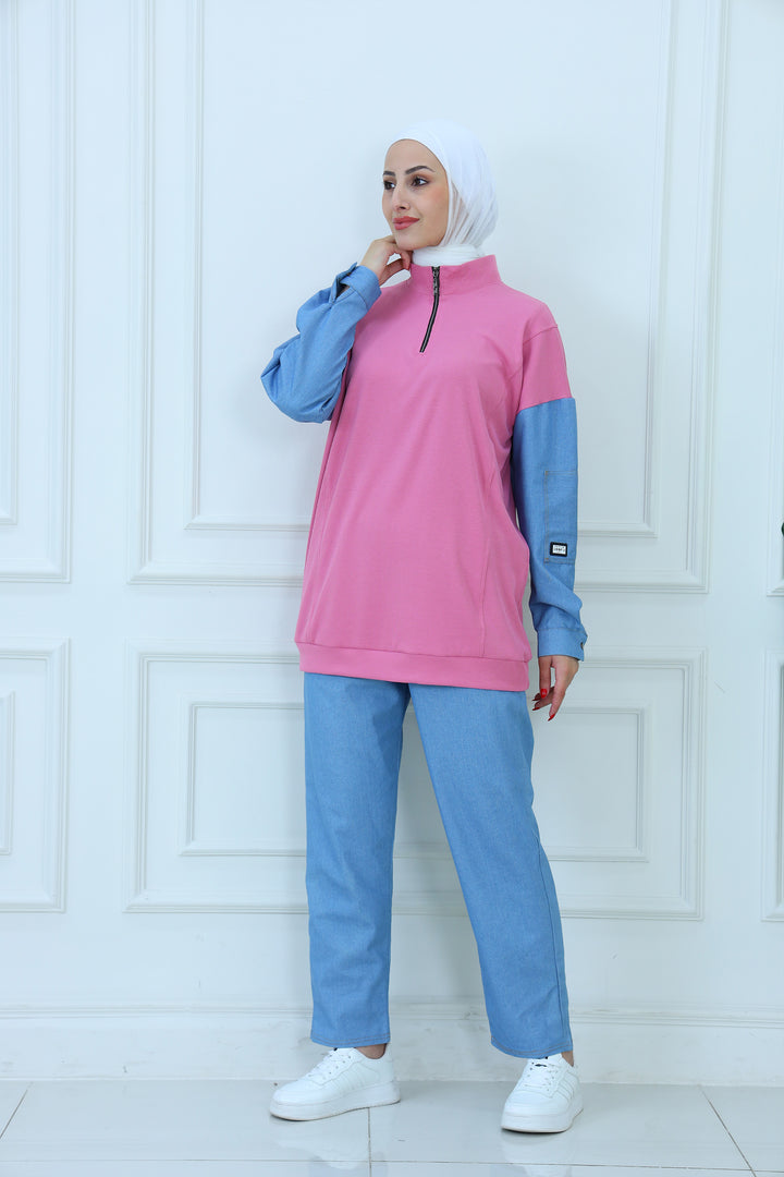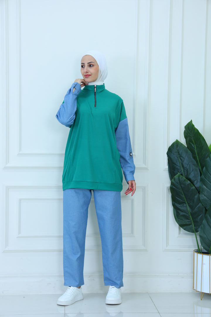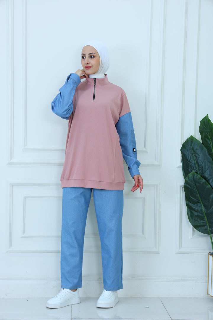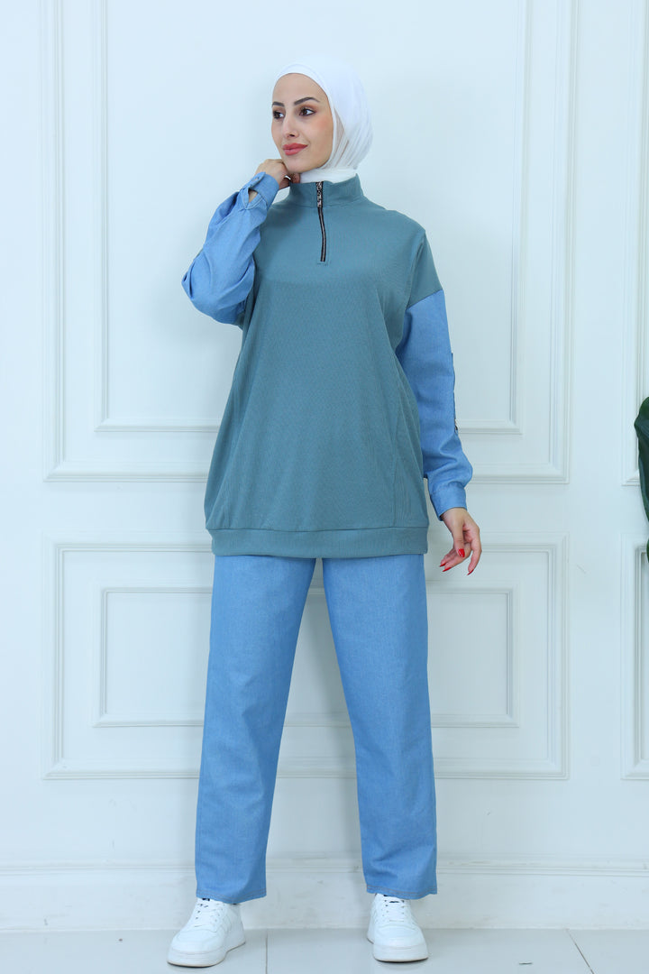 Details: Two-piece modest tracksuit featuring a jeans-look sleeves , paired with straight-fit jeans-style pants. A casual and stylish set combining comfort with a touch of jeans flair—perfect for everyday wear, errands, or relaxed outings