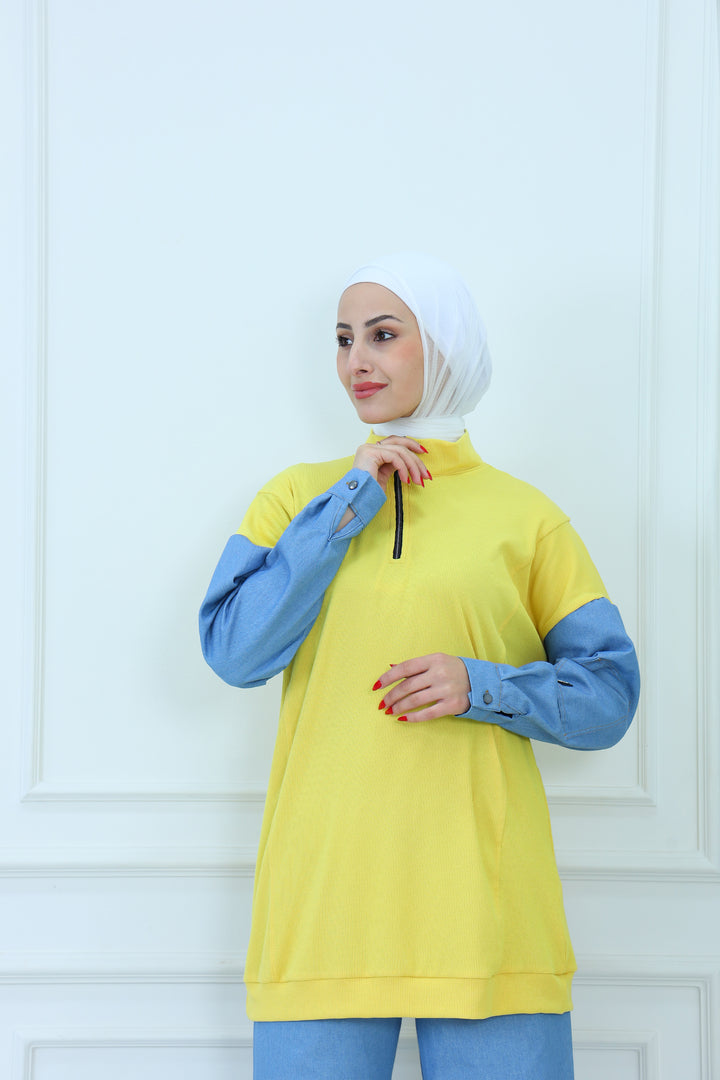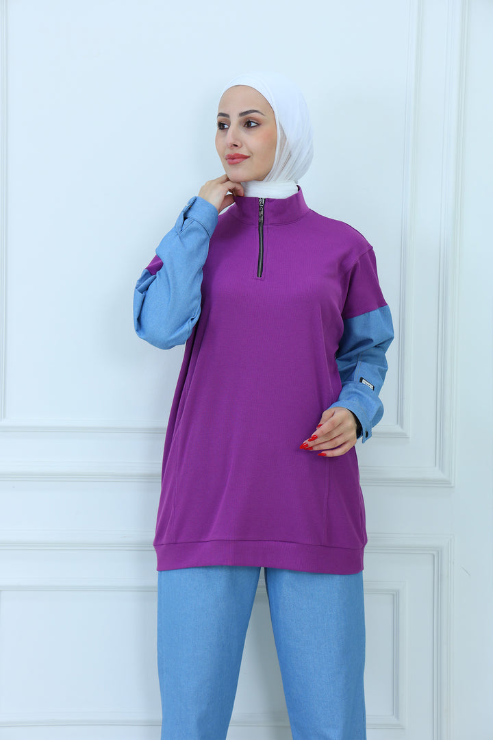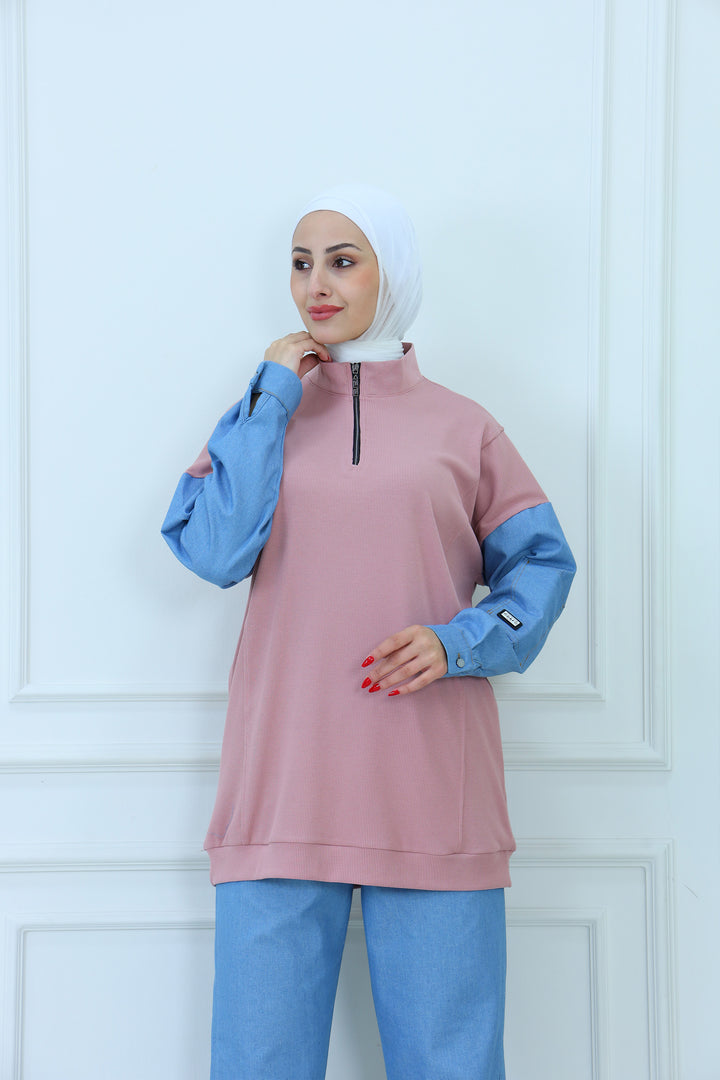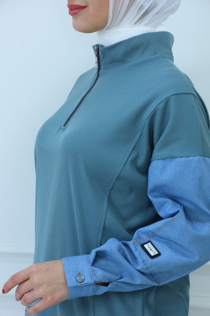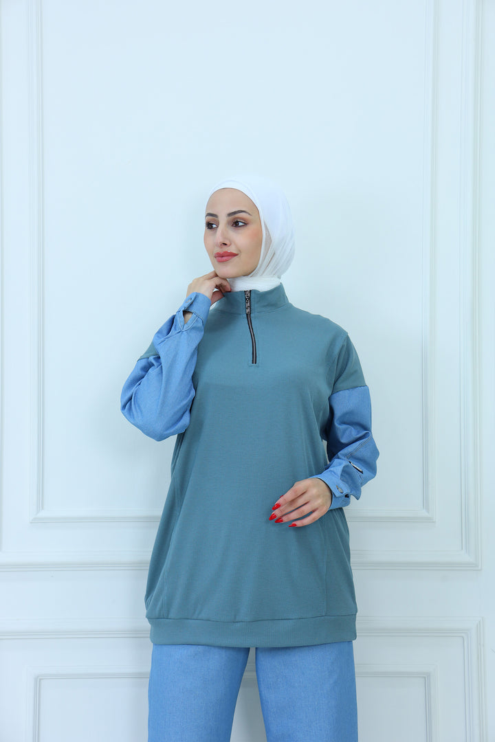 Details: Two-piece modest tracksuit featuring a jeans-look sleeves , paired with straight-fit jeans-style pants. A casual and stylish set combining comfort with a touch of jeans flair—perfect for everyday wear, errands, or relaxed outings
