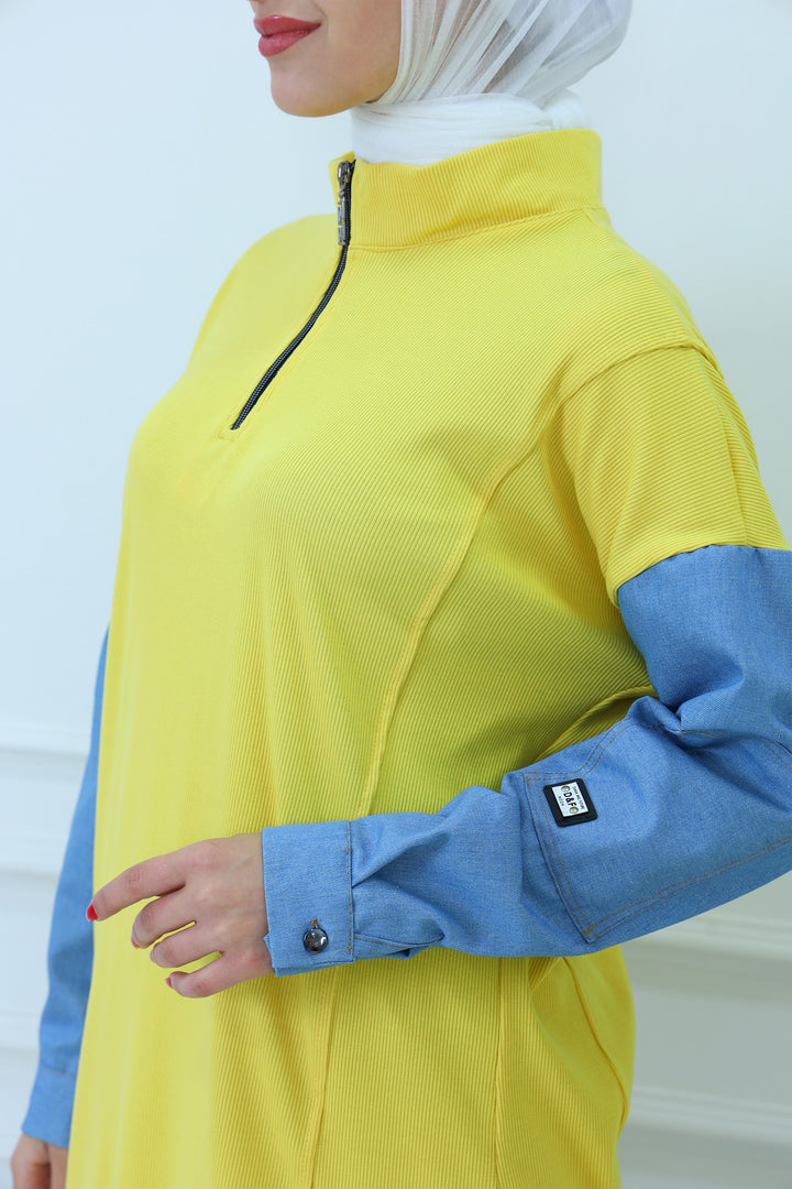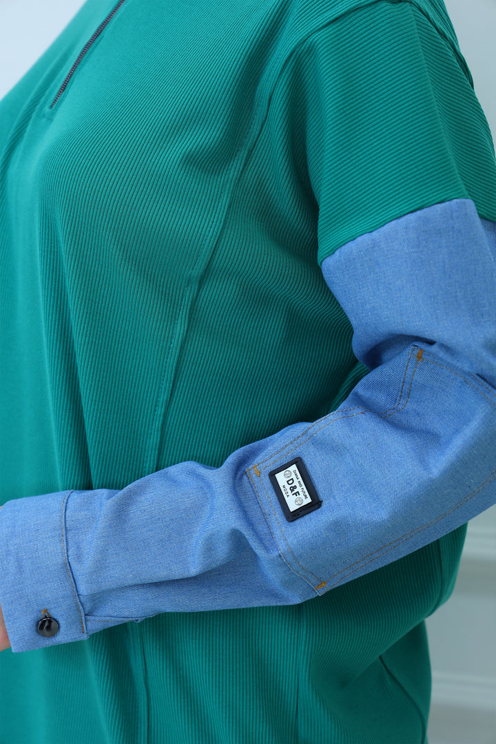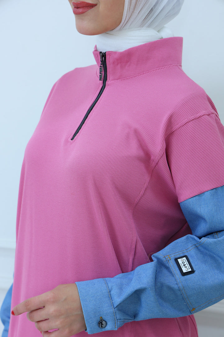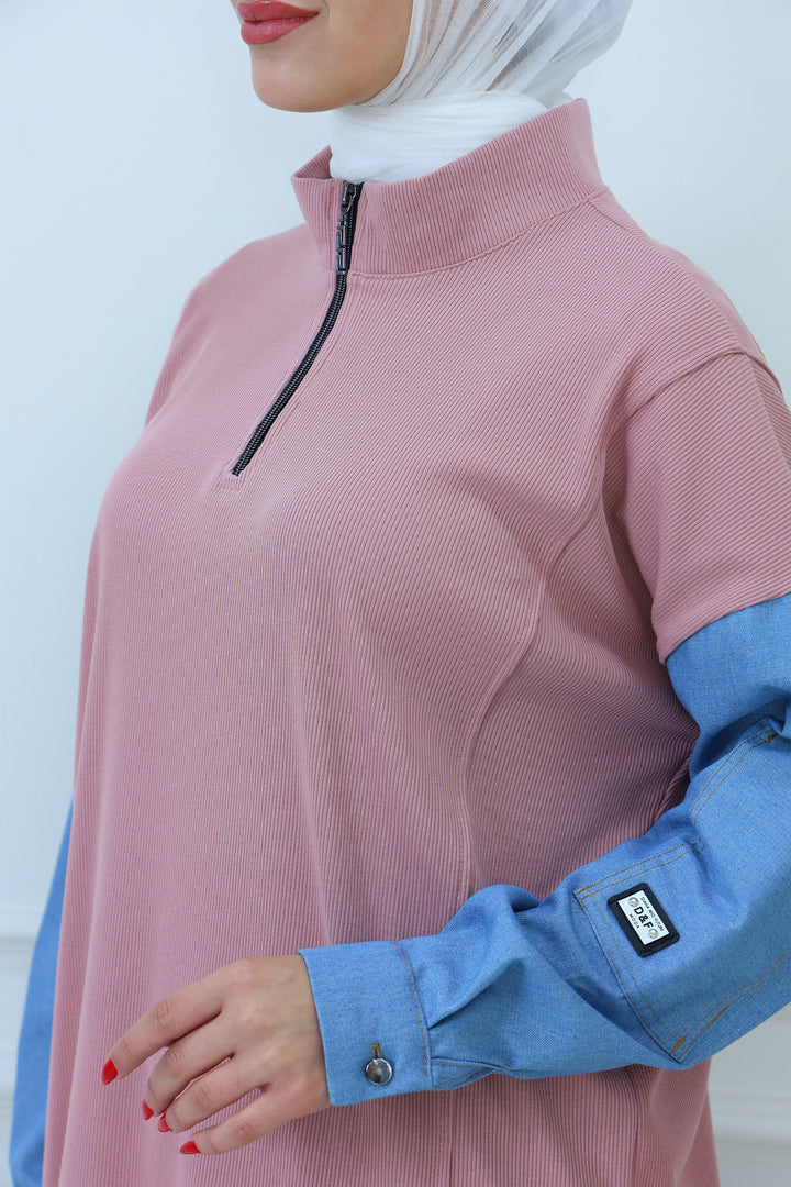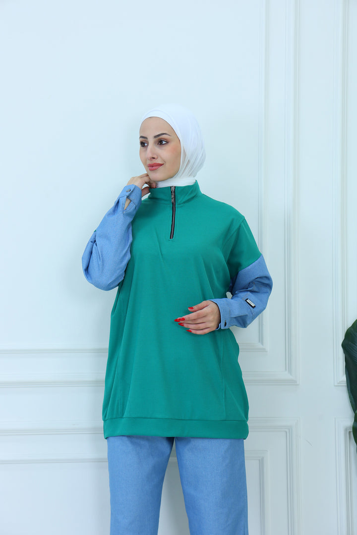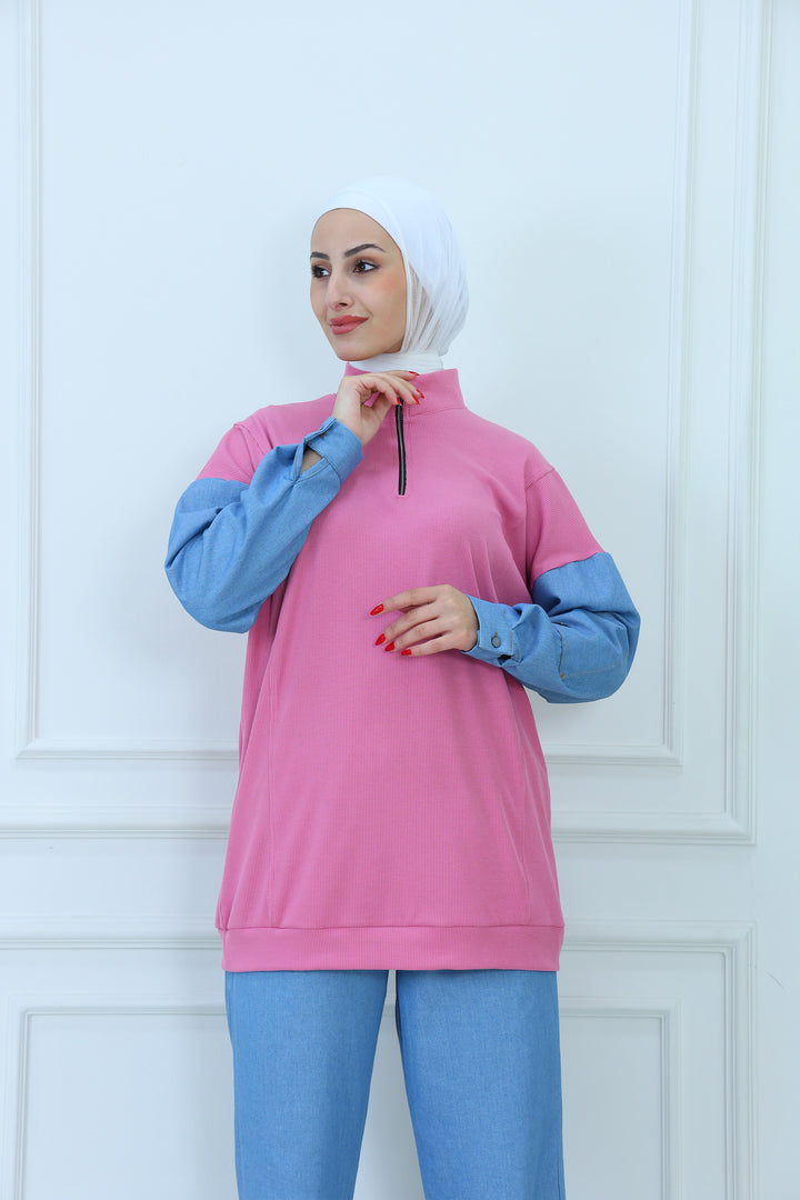 Details: Two-piece modest tracksuit featuring a jeans-look sleeves , paired with straight-fit jeans-style pants. A casual and stylish set combining comfort with a touch of jeans flair—perfect for everyday wear, errands, or relaxed outings