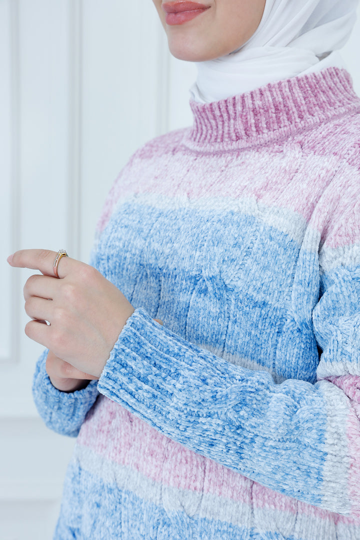 This premium knit sweater features a beautiful mix of wide, horizontal stripes in soft, eye-catching pastel shades, including pink and blue. The fabric is structured with a prominent chunky cable-knit pattern, adding a rich, dimensional texture. It is finished with a comfortable, ribbed high-neck collar for extra warmth and a polished look.