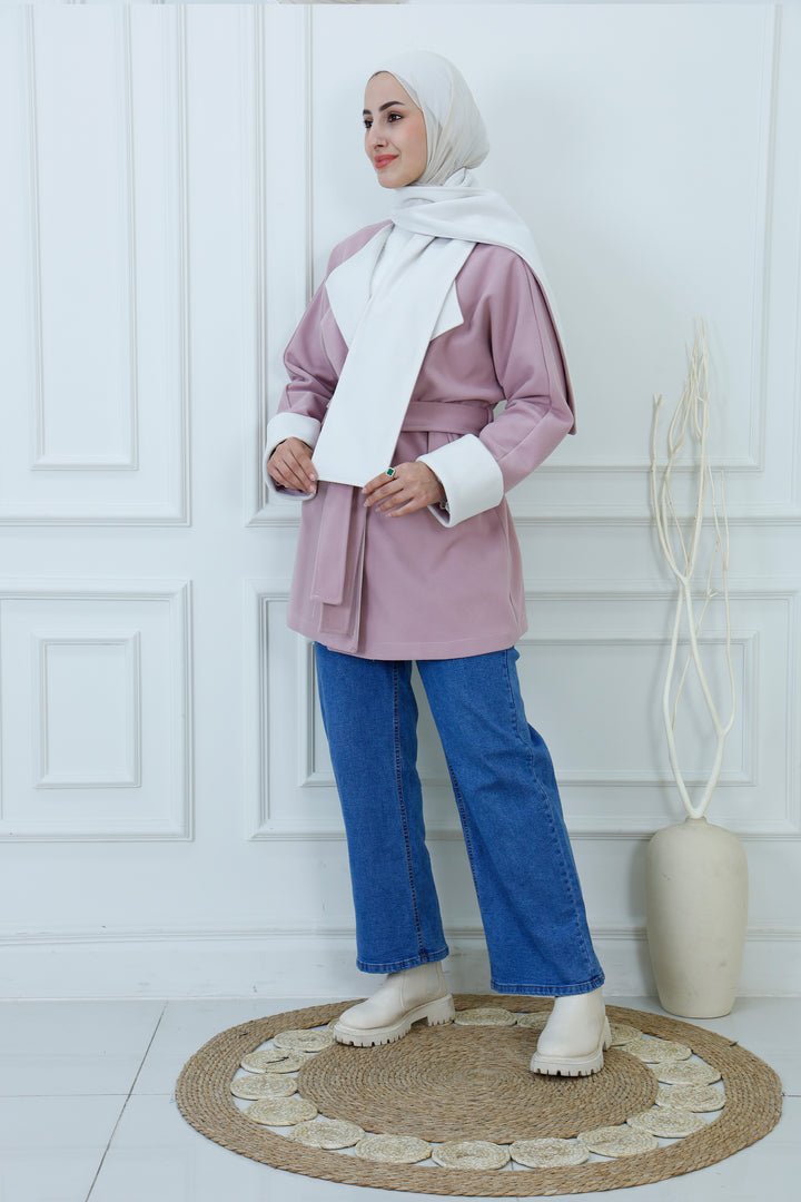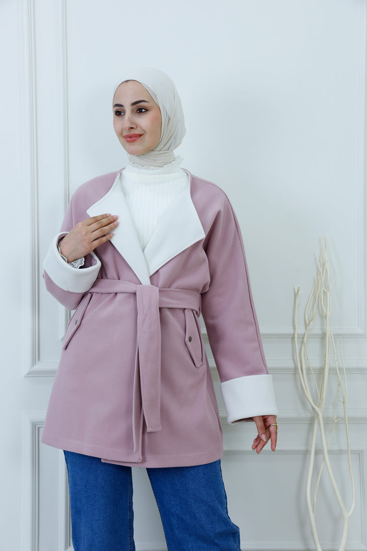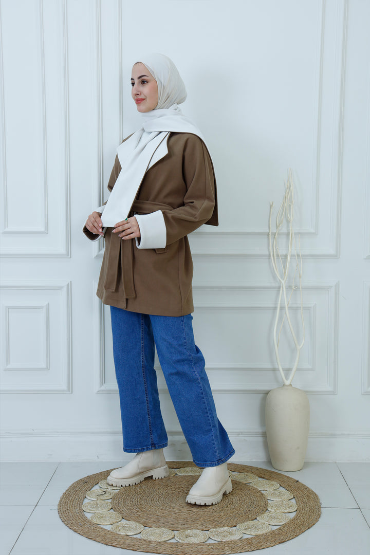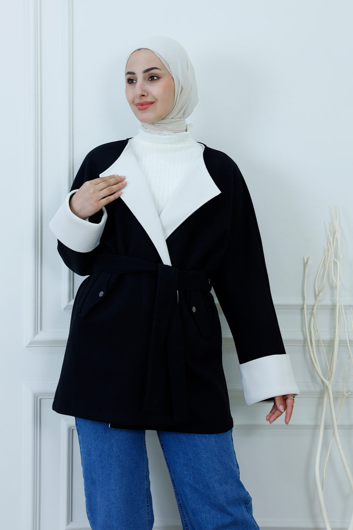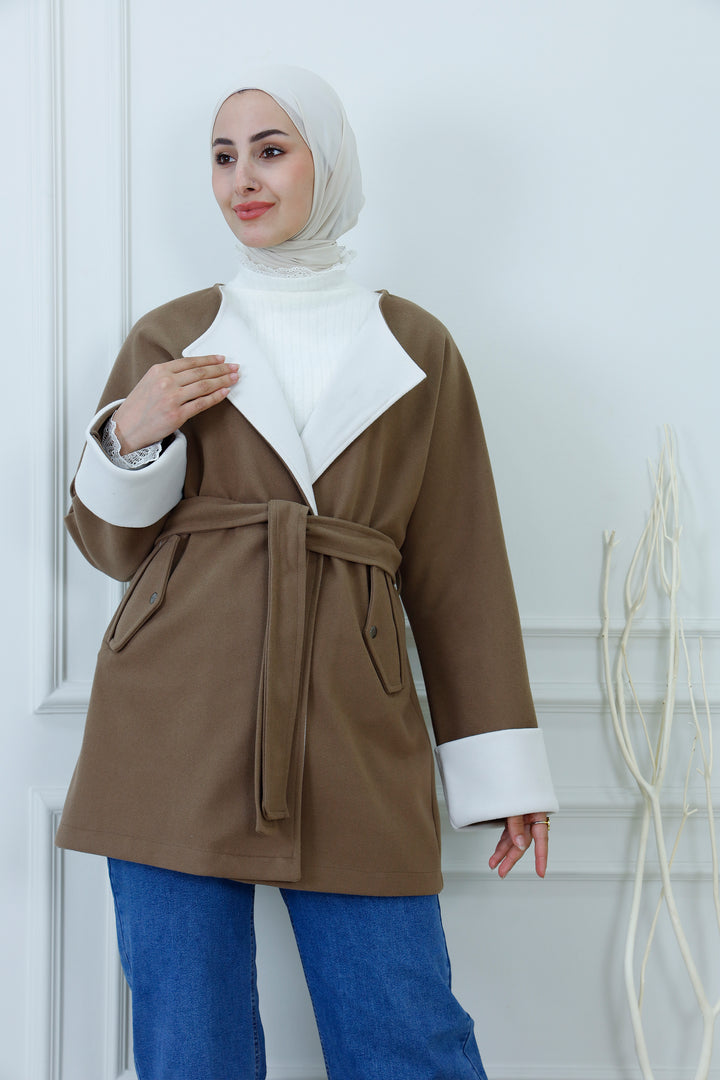 Chic Contrast Lapel Modest Coat | Belted Wrap Jacket