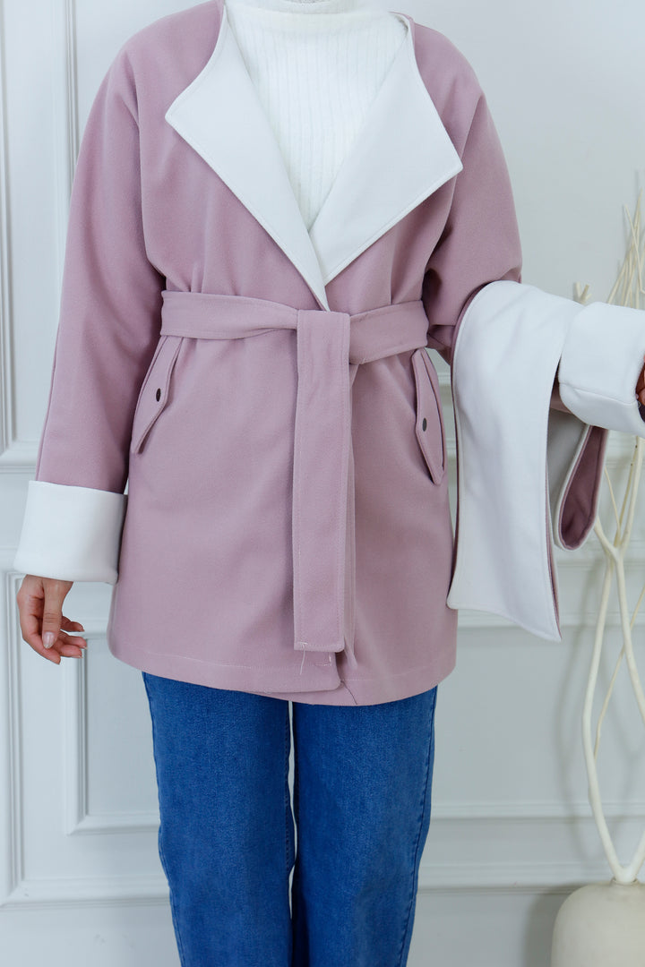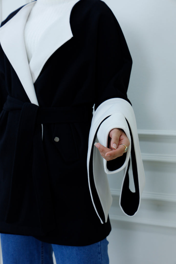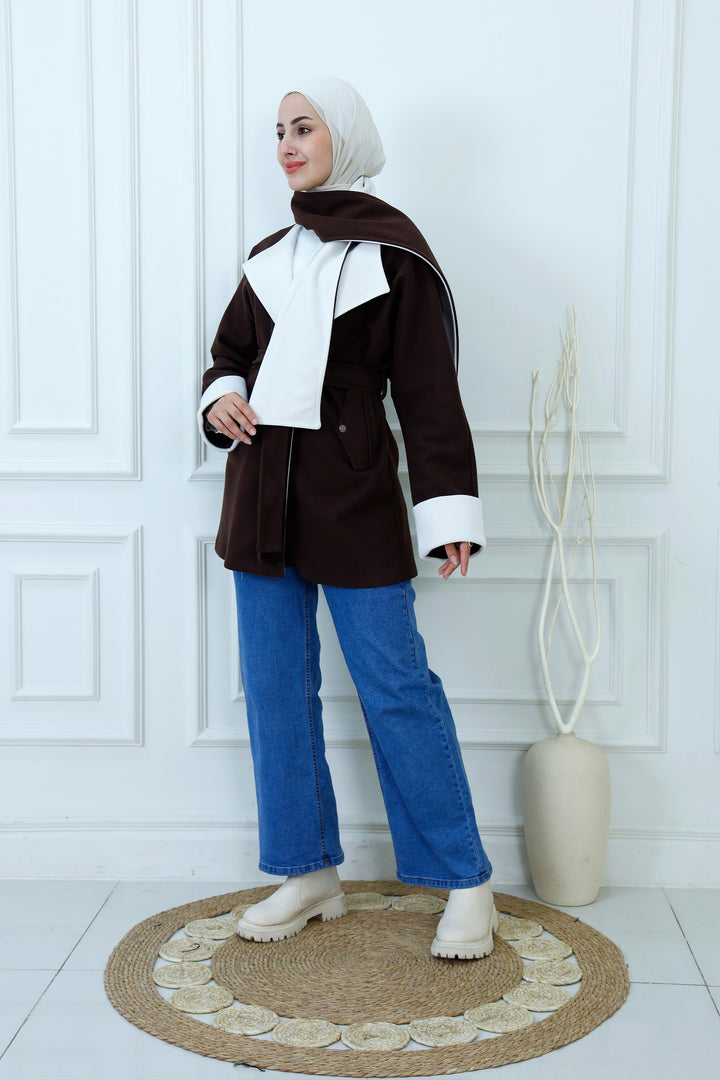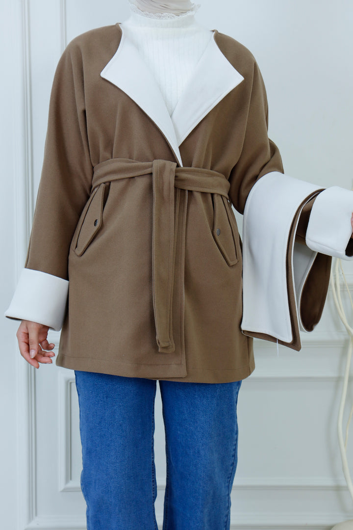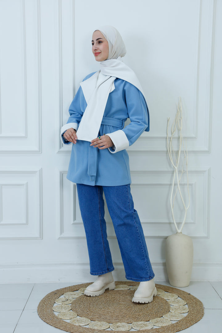 Chic Contrast Lapel Modest Coat | Belted Wrap Jacket
