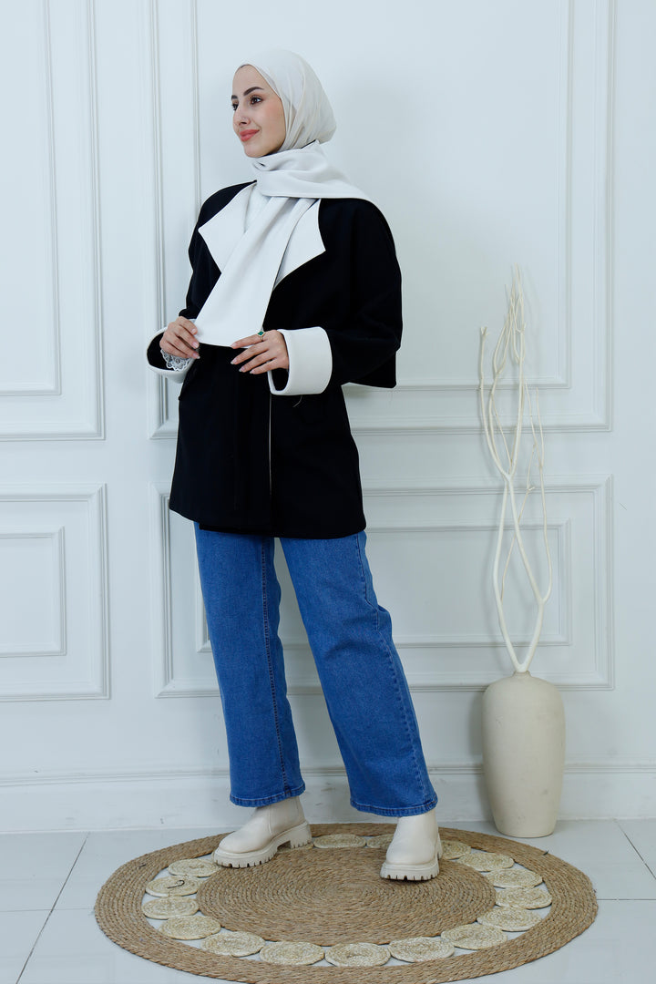 Elevate your cool-weather wardrobe with our Chic Contrast Lapel Modest Coat. This statement outerwear piece perfectly blends classic tailoring with modern style, ensuring you look polished and stay comfortable. The design features a striking two-tone aesthetic, with the main body color beautifully contrasted by a crisp secondary color on the lapels and cuffs, giving it a luxurious feel.