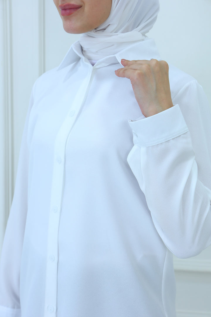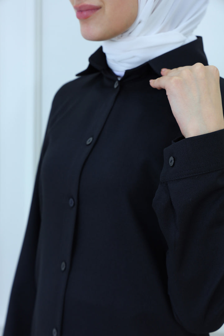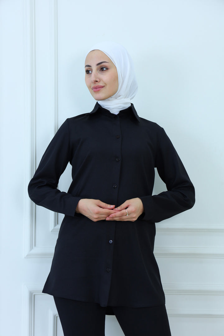 Crafted from a soft, flowing fabric, this high-quality button-down is designed for all-day comfort and a flattering, relaxed fit. The classic collar and neat front button placket ensure a sophisticated, polished appearance suitable for the office or a special event. Its versatile design and full-coverage length make it an essential modest top that pairs seamlessly with any bottom