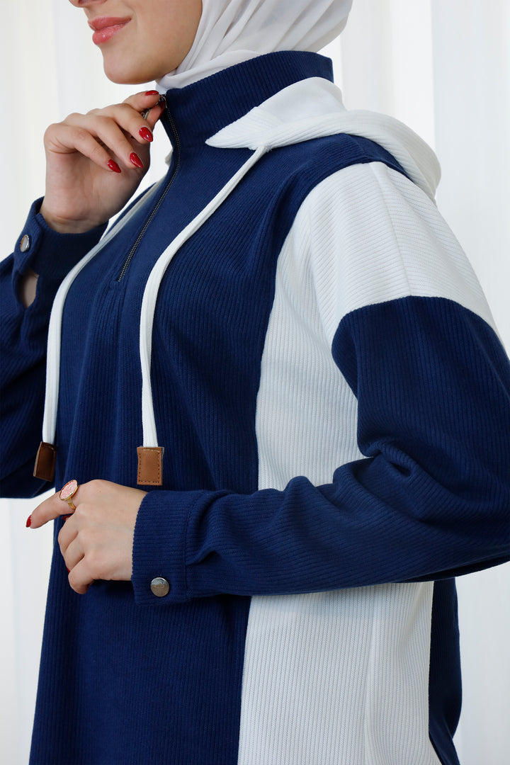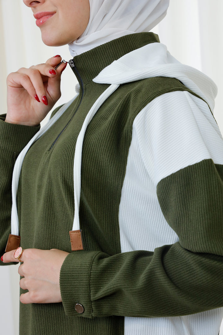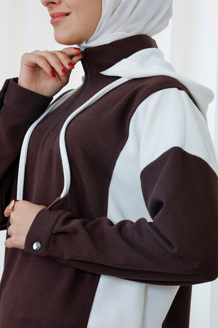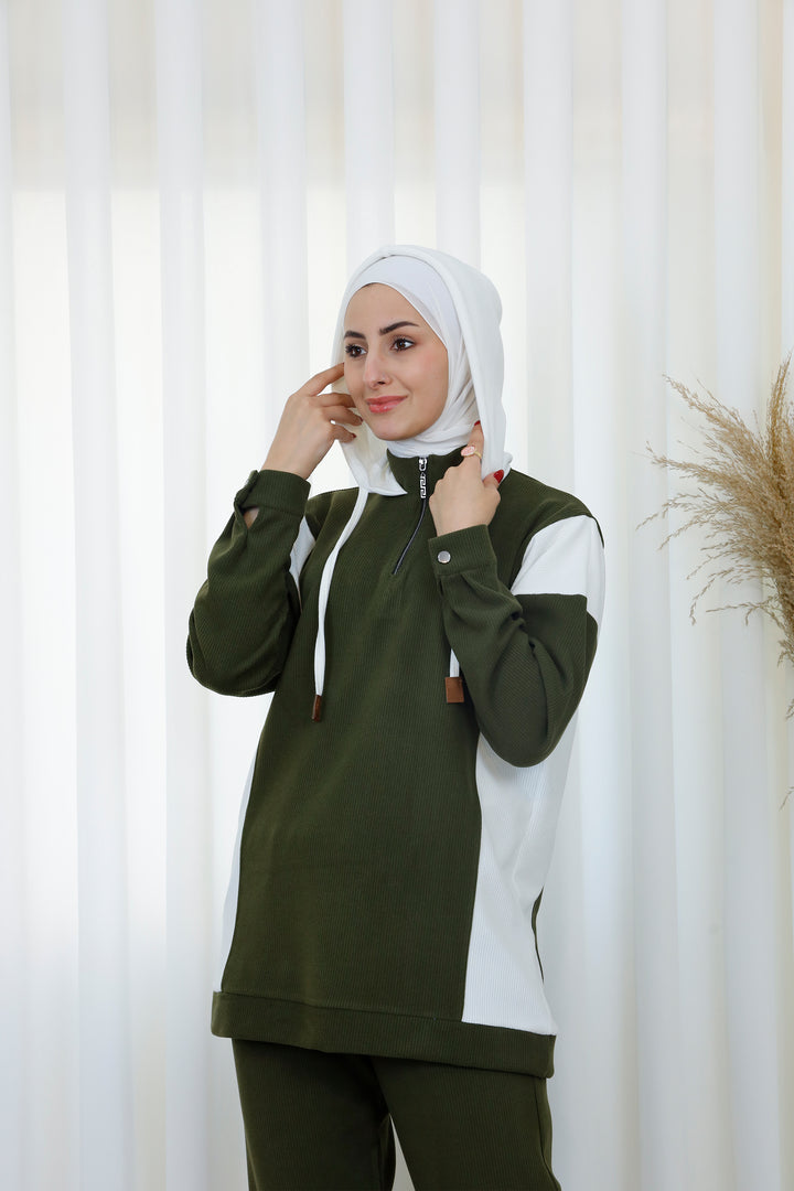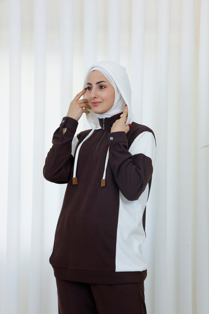 Stay comfortable and stylish with this modest two-piece sport set designed for active days and casual outings. The top features a modern half-zip design with an attached hood and adjustable drawstrings, giving you a sporty yet modest look. Side panel detailing adds a flattering shape, while the relaxed fit ensures full comfort throughout the day.