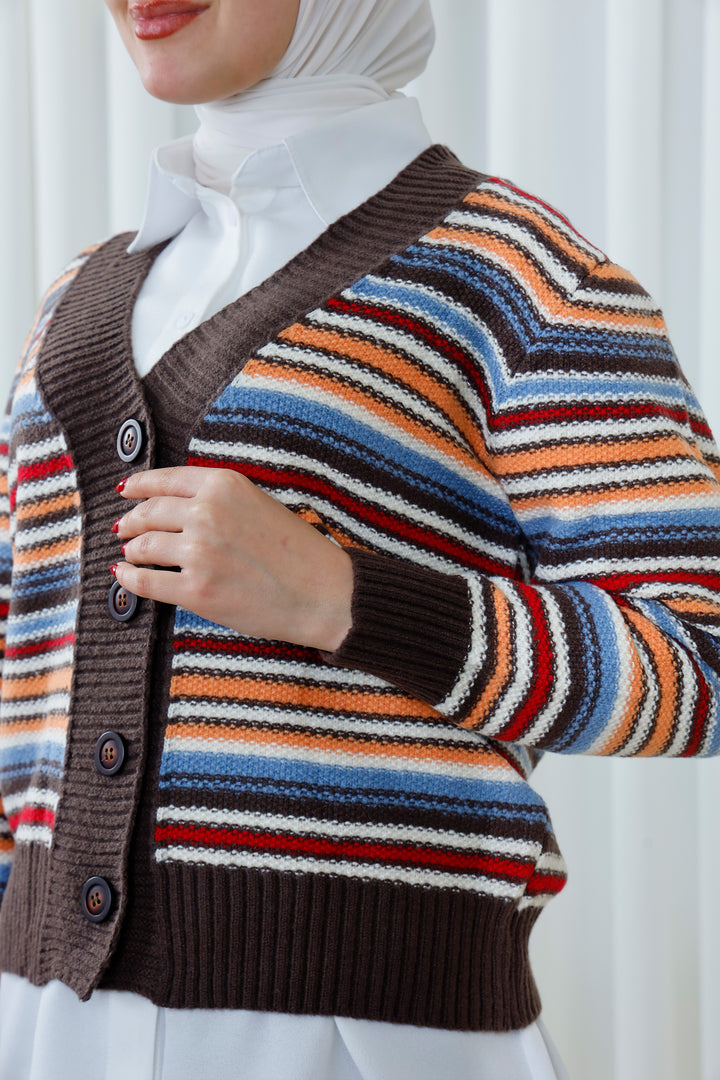 Make a bold statement with this multicolored striped cardigan, designed to bring warmth and personality to your wardrobe. Featuring horizontal stripes in rich tones and a contrast brown trim, this button-up piece blends playful color with classic structure. The relaxed fit and front pockets add comfort and practicality, while the vibrant palette makes it a standout layering piece.