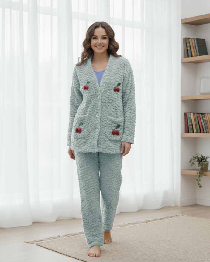 Indulge in cozy comfort with this unique two-piece loungewear set. The soft, all-over textured knit gives it an irresistibly plush, fuzzy feel that's perfect for relaxing. The button-front cardigan is highlighted by playful embroidered fruit details on the chest and pockets, adding a sweet, quirky charm. Paired with matching relaxed-fit pants, this ensemble is your new favorite for downtime.