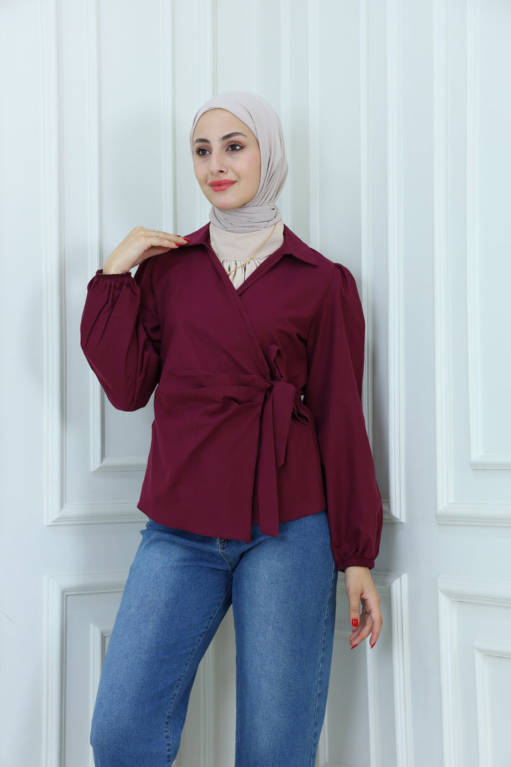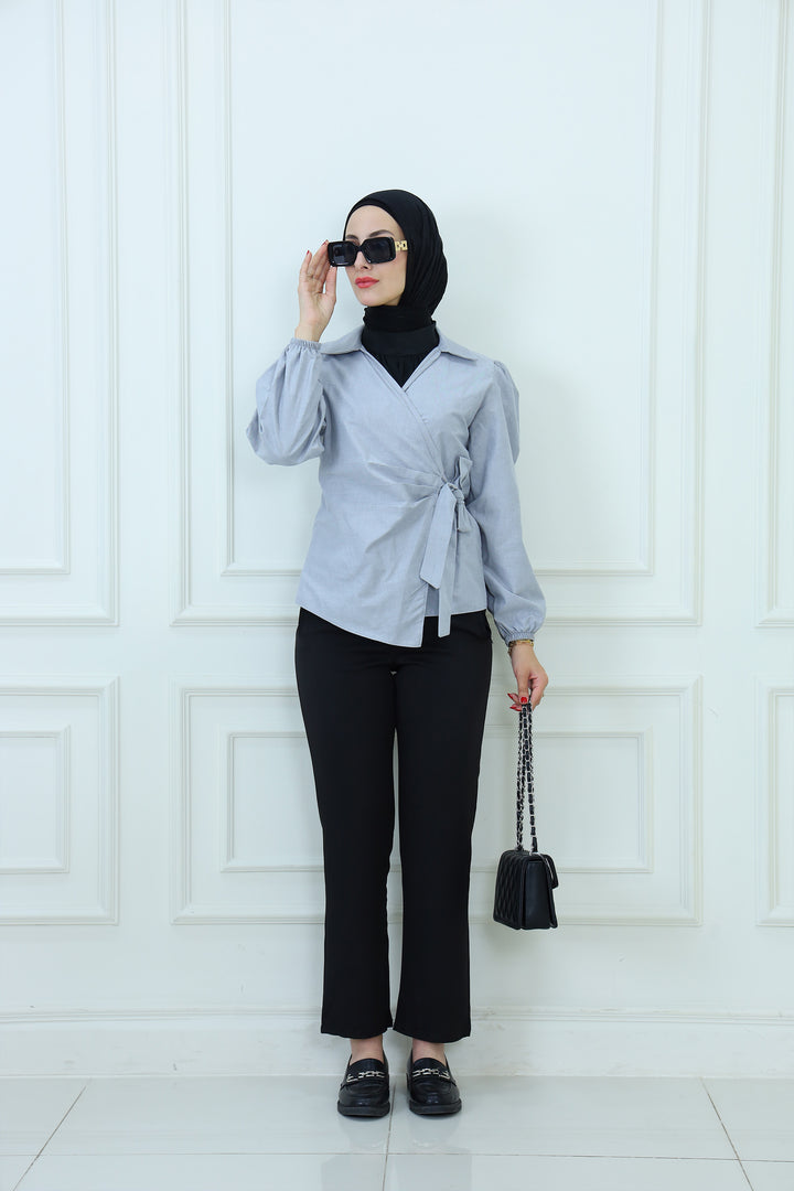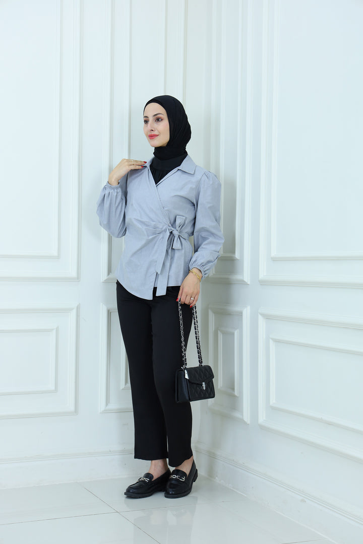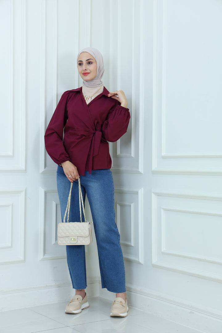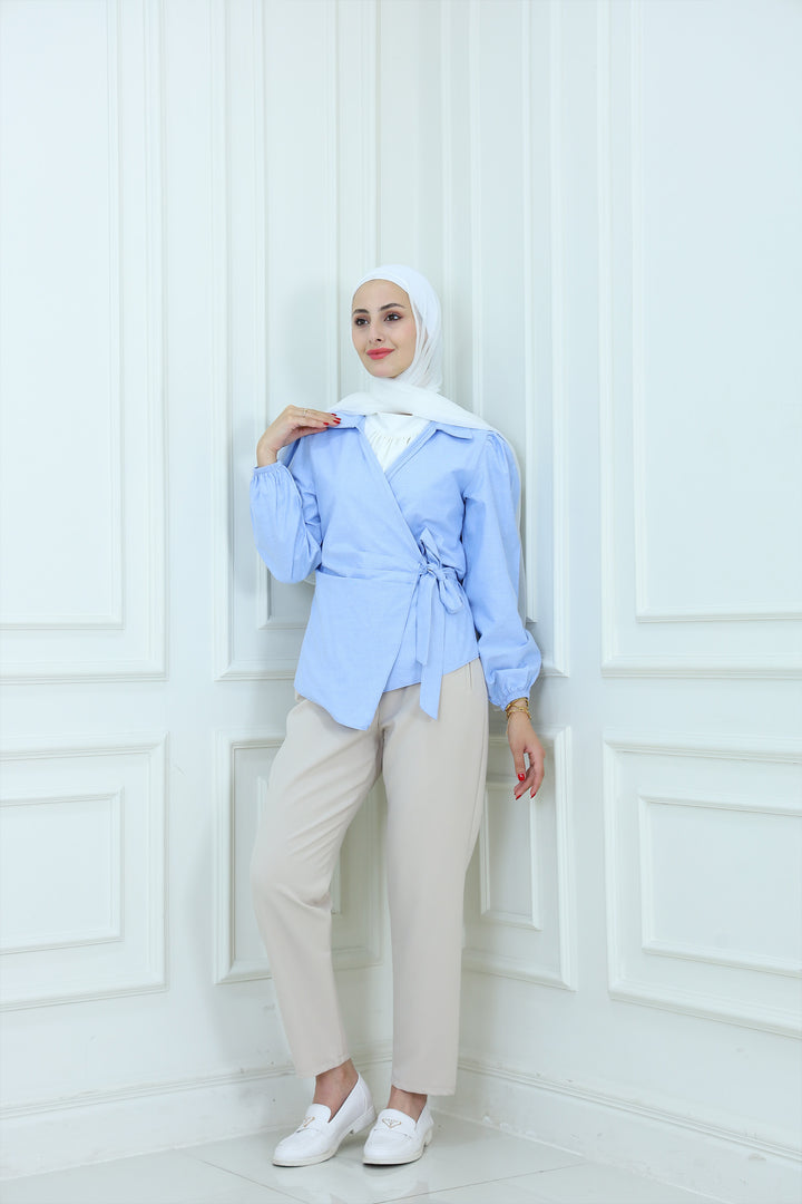 Details: Elevate your modest wardrobe with this elegant blouse featuring Waist Tie . Designed with a high neckline and flowy sleeves, it's perfect for both formal and casual looks