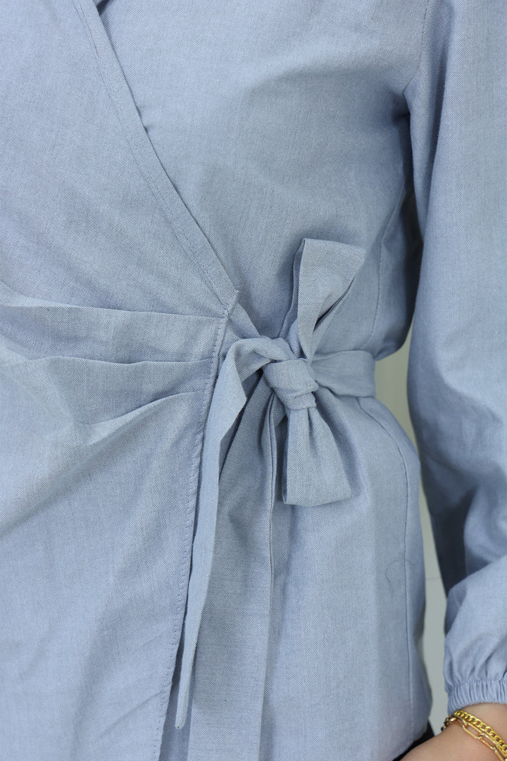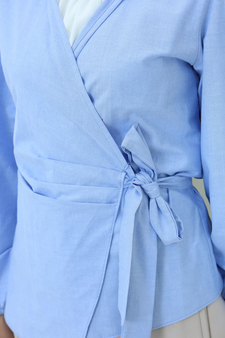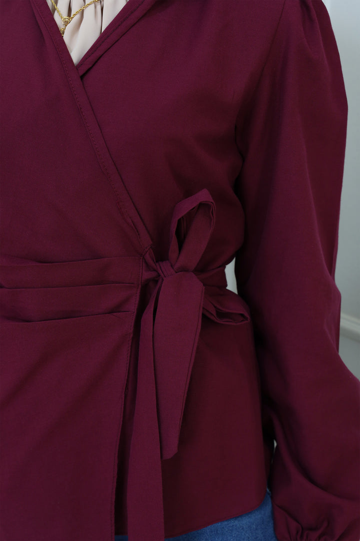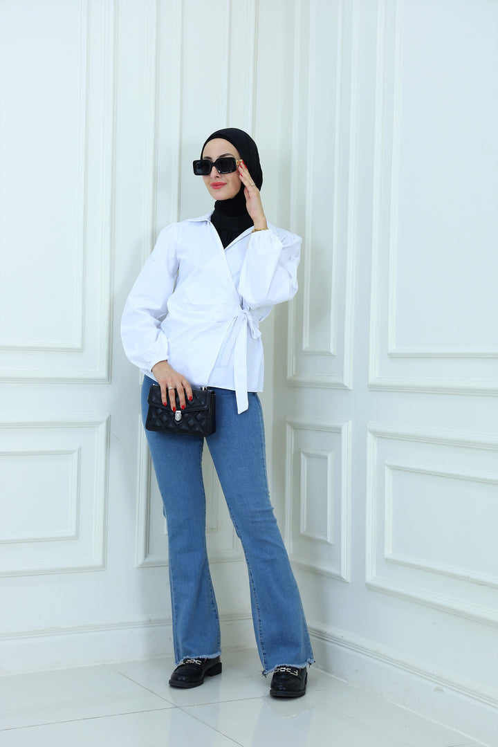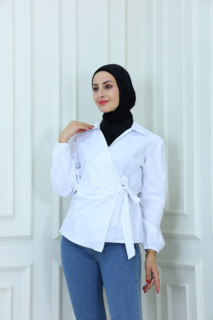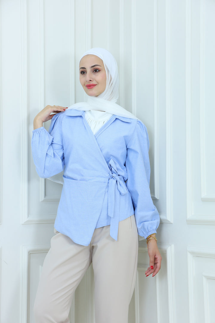 Details: Elevate your modest wardrobe with this elegant blouse featuring Waist Tie . Designed with a high neckline and flowy sleeves, it's perfect for both formal and casual looks