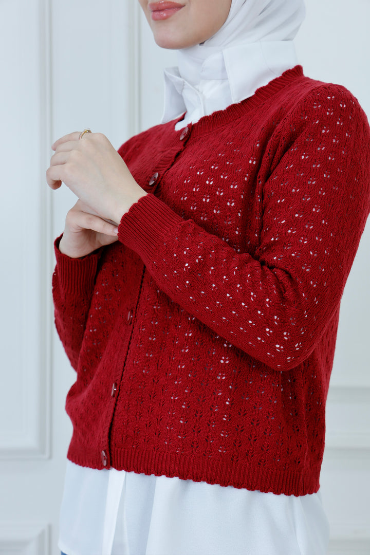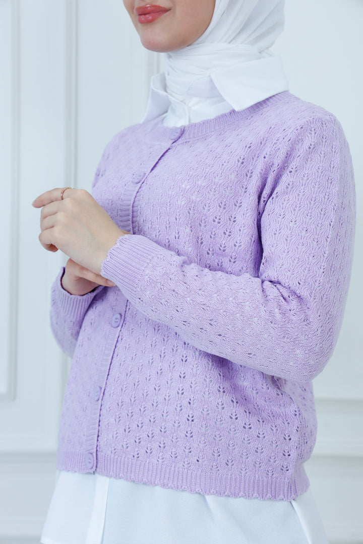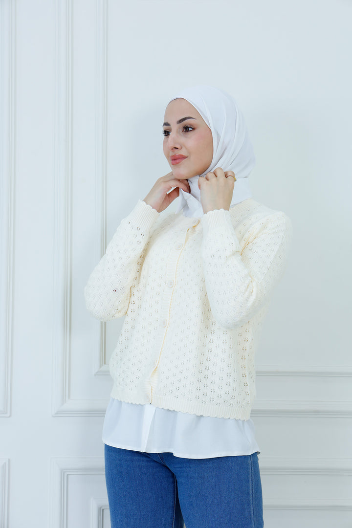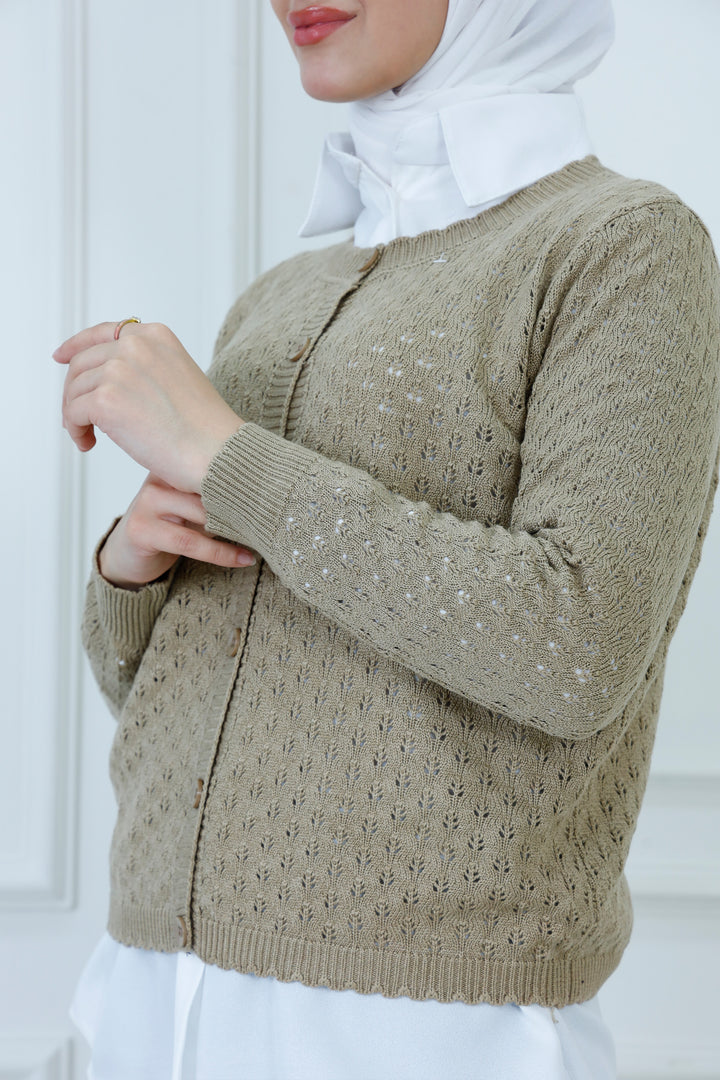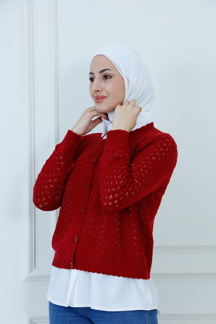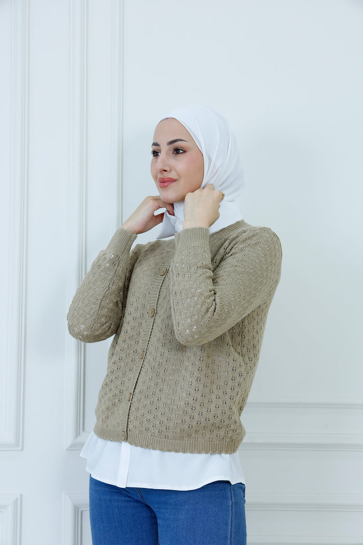 Designed with a comfortable fit and a button-front closure, this sweater is perfect for wearing open over tunics or closed as a top. Its length makes it an excellent addition to your modest fashion collection, providing the perfect light cover-up. It features a classic round neck and is ideal for adding a touch of texture and style to any outfit.