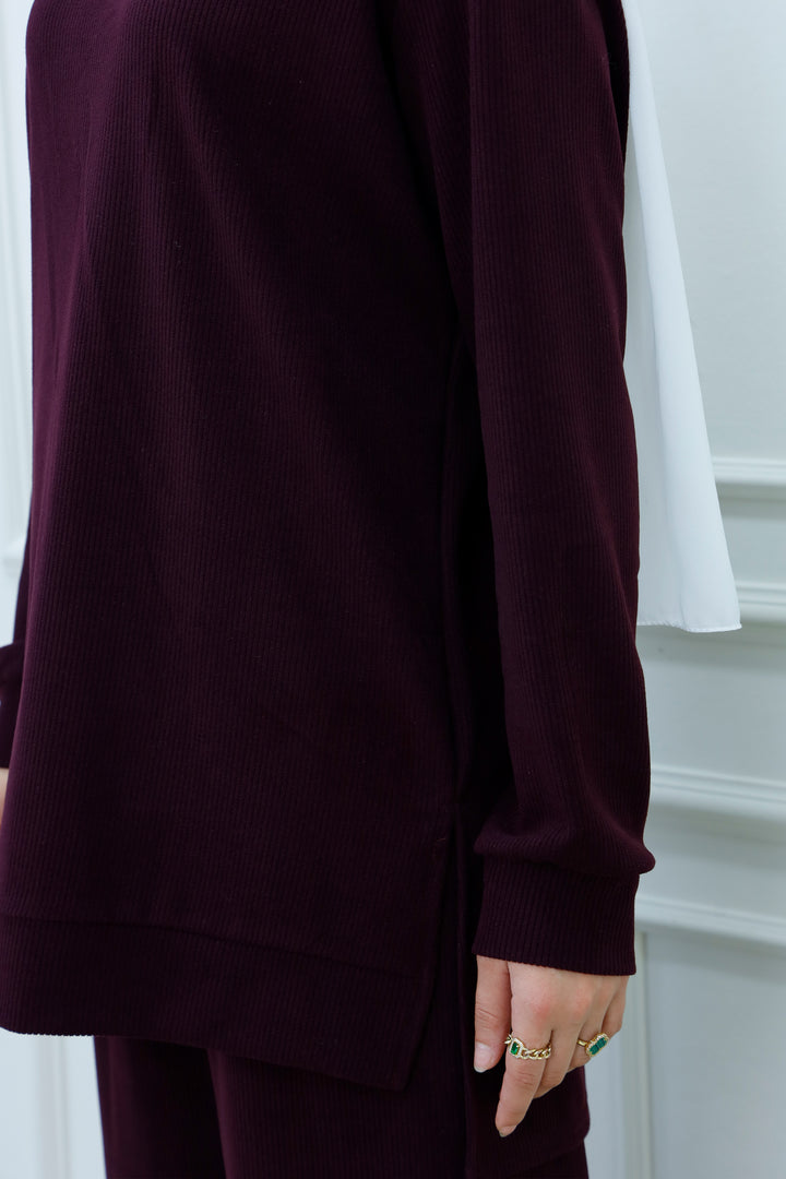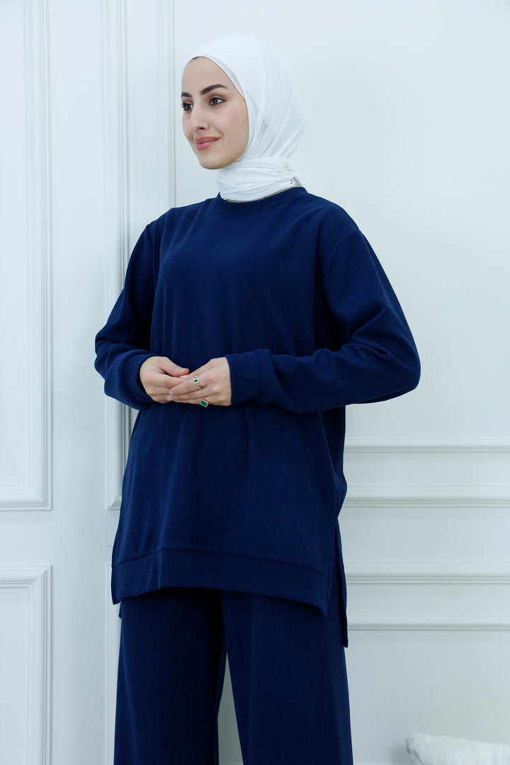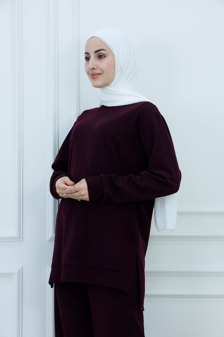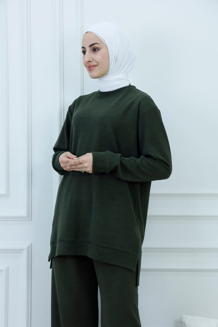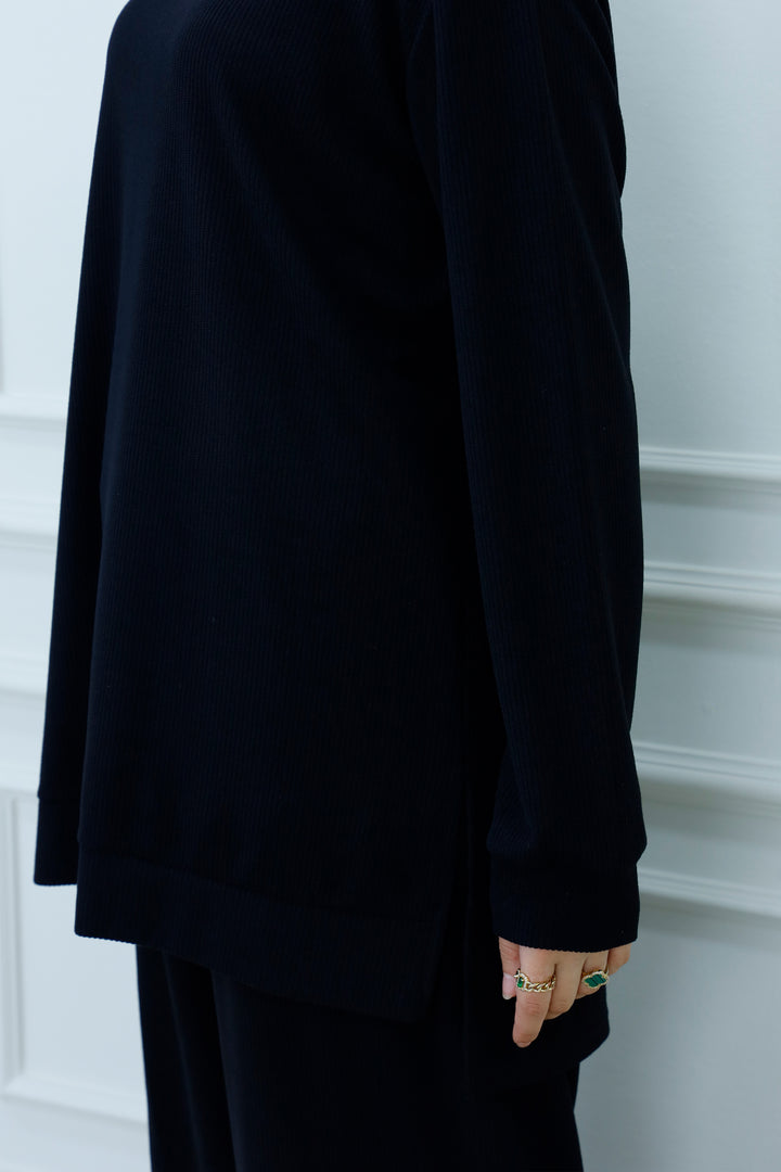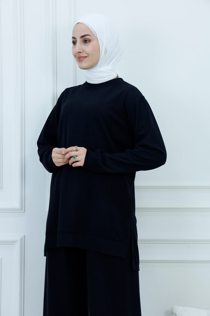 This ribbed tracksuit is designed for laid-back days and cozy layering. The long-sleeved top features a loose fit with side slits and ribbed texture, paired with wide-leg pants for a relaxed, sporty vibe. Perfect for lounging, errands, or travel, this set delivers comfort without compromising style.