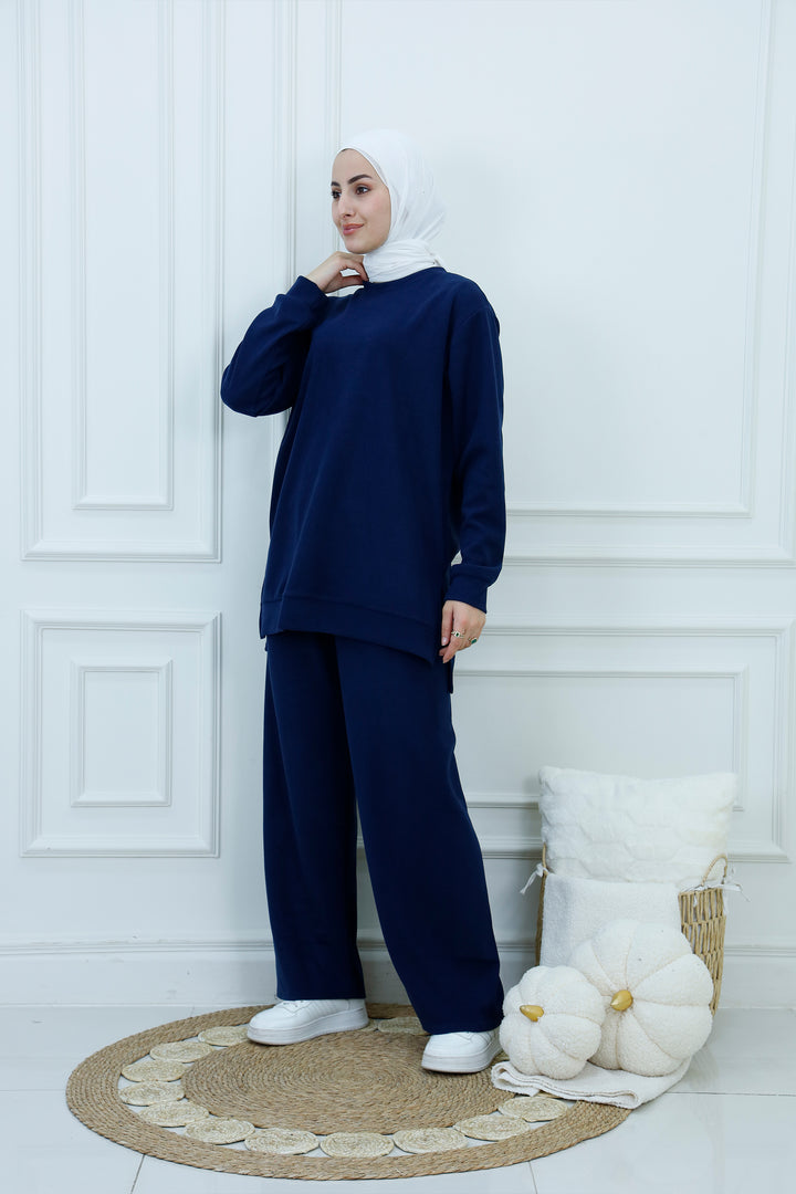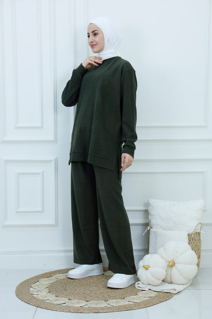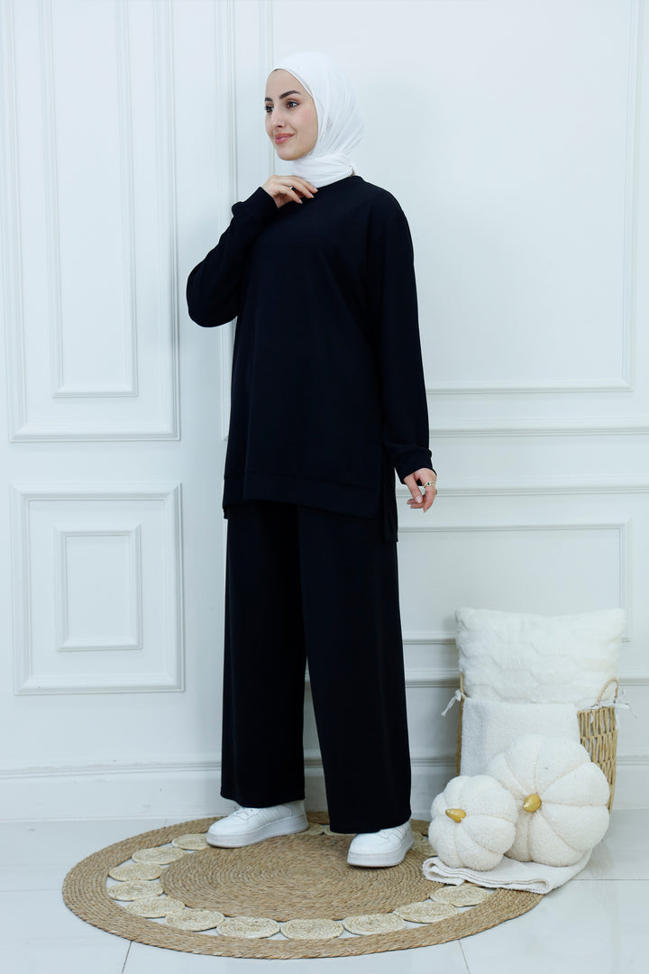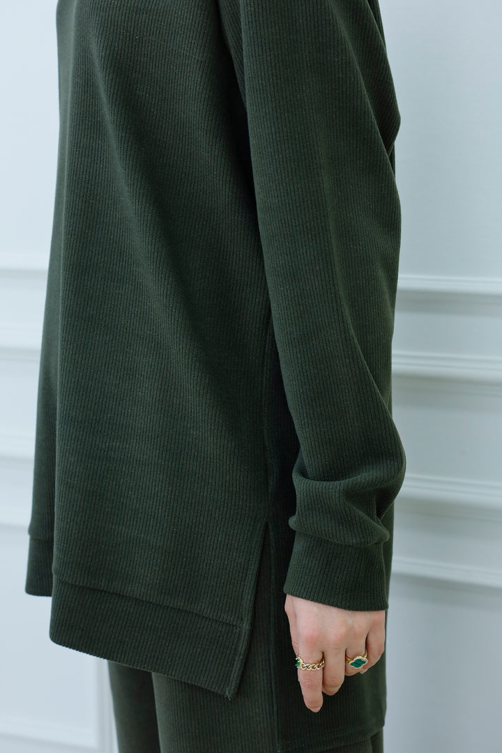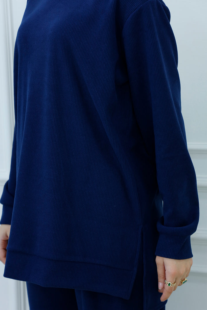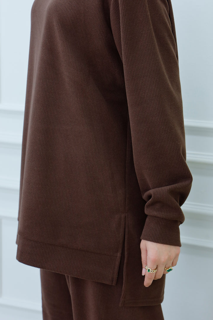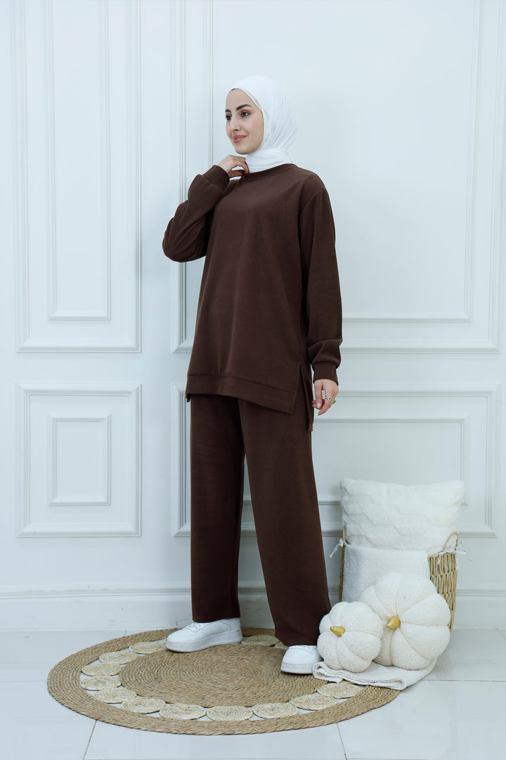 This ribbed tracksuit is designed for laid-back days and cozy layering. The long-sleeved top features a loose fit with side slits and ribbed texture, paired with wide-leg pants for a relaxed, sporty vibe. Perfect for lounging, errands, or travel, this set delivers comfort without compromising style.