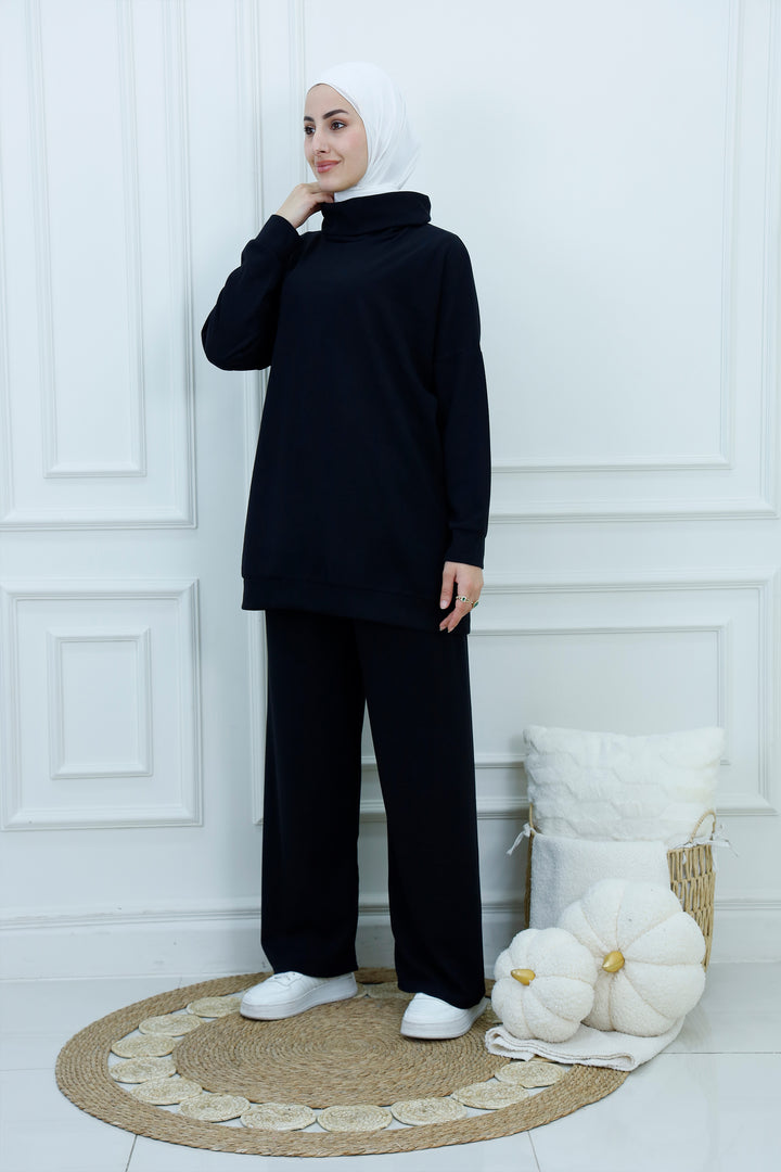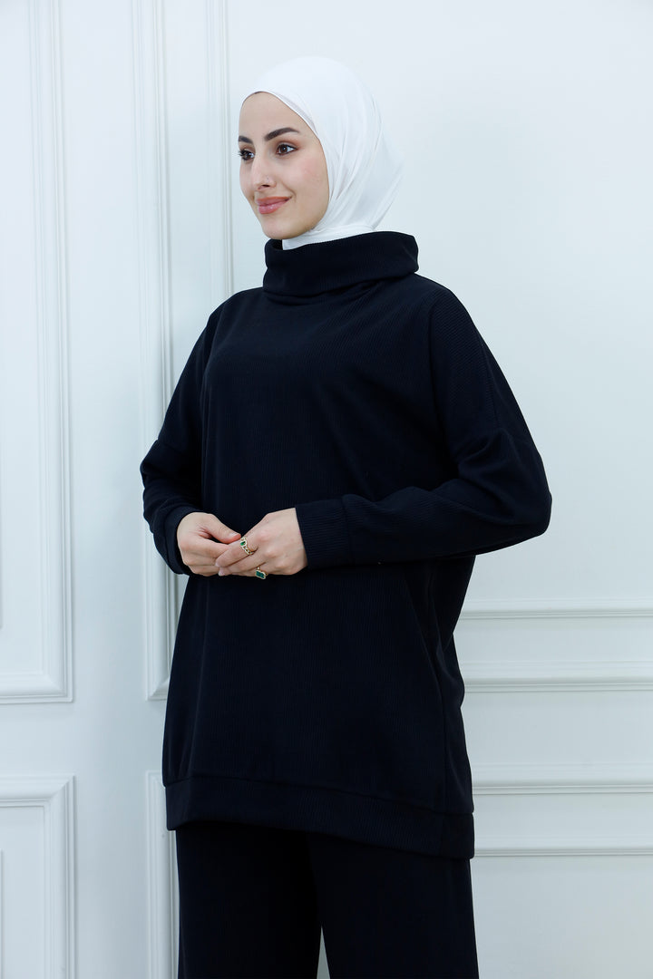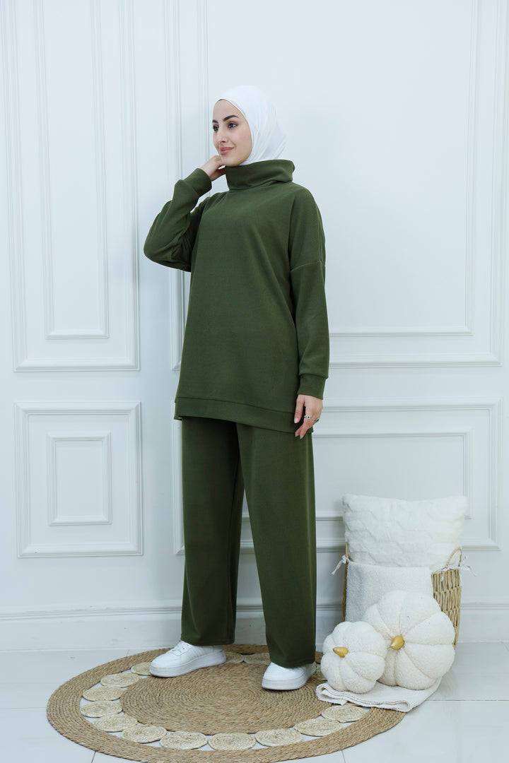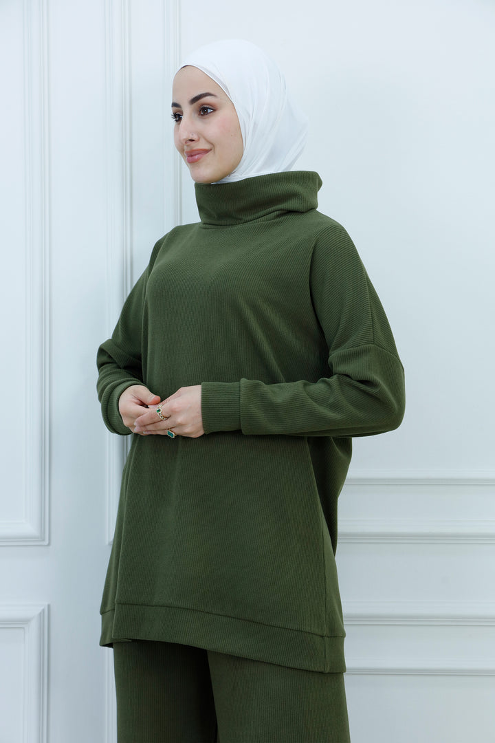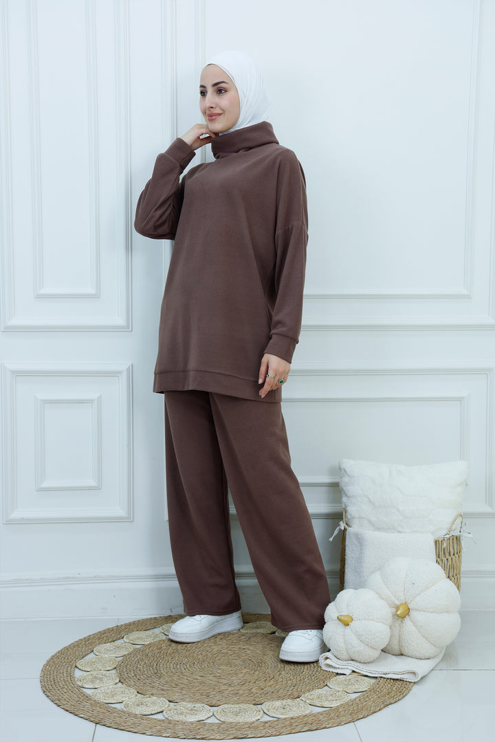 This ribbed turtleneck suit blends modest style with everyday ease. The long-sleeved top features a relaxed high neckline and vertical ribbed texture, paired with wide-leg pants for a coordinated, comfortable look. Ideal for casual wear or layering in cooler seasons, this suit offers a clean silhouette that’s easy to dress up or down.