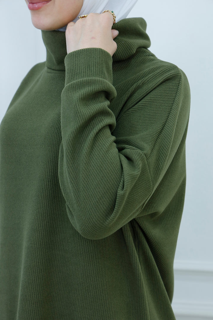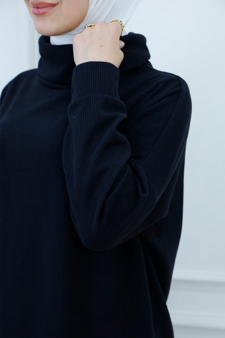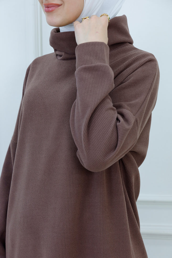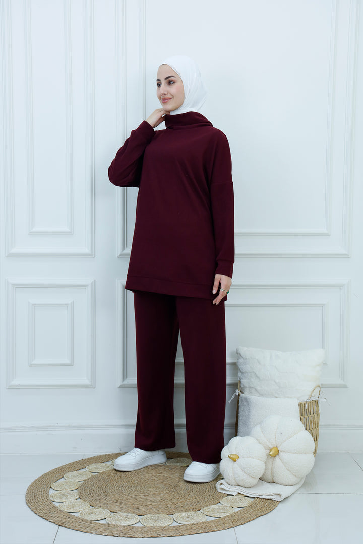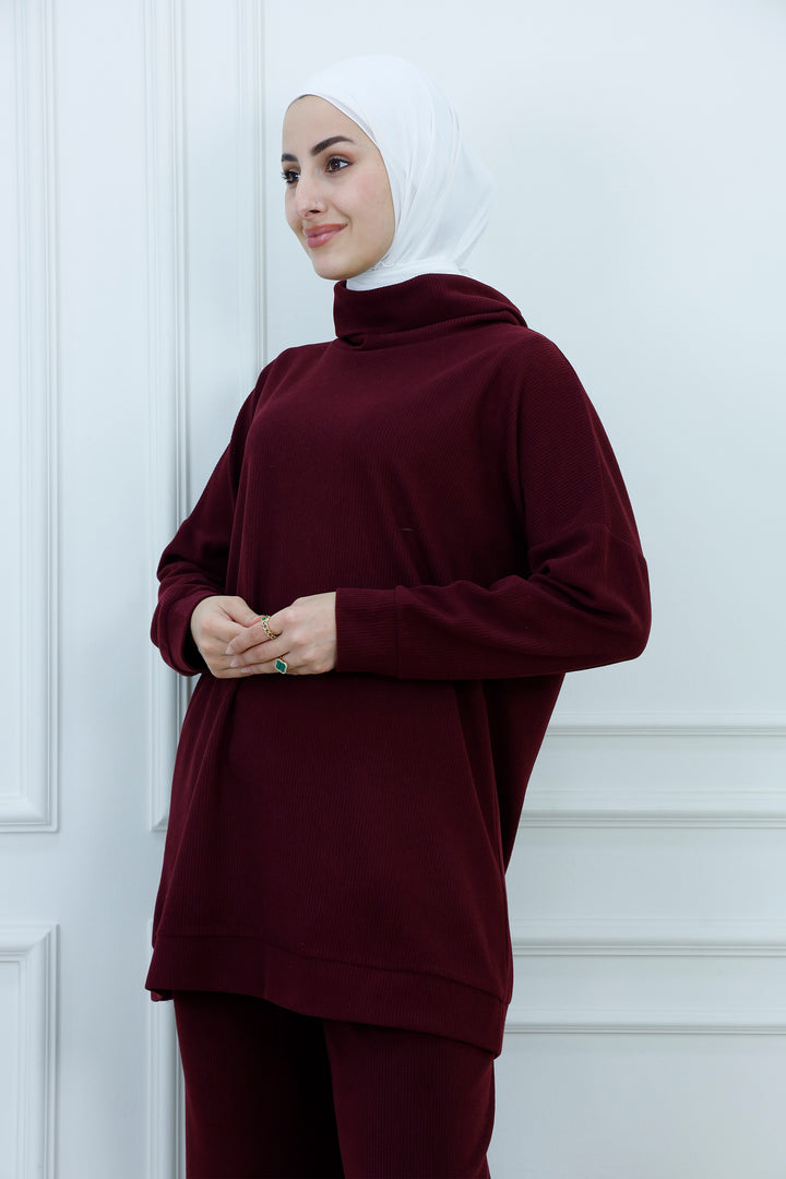 This ribbed turtleneck suit blends modest style with everyday ease. The long-sleeved top features a relaxed high neckline and vertical ribbed texture, paired with wide-leg pants for a coordinated, comfortable look. Ideal for casual wear or layering in cooler seasons, this suit offers a clean silhouette that’s easy to dress up or down.