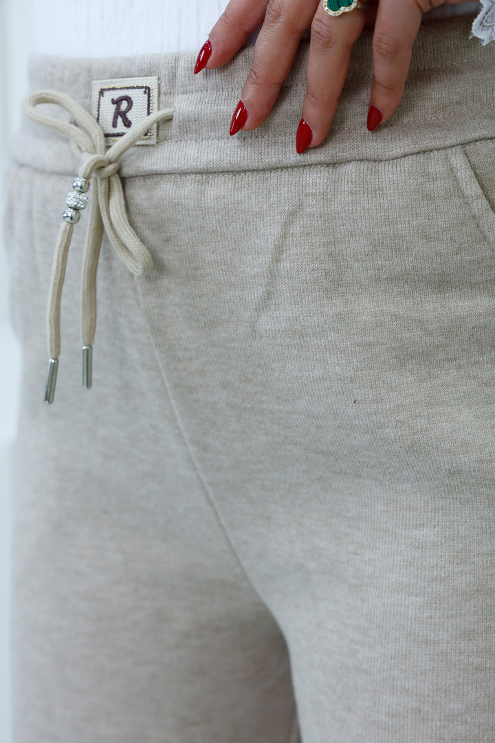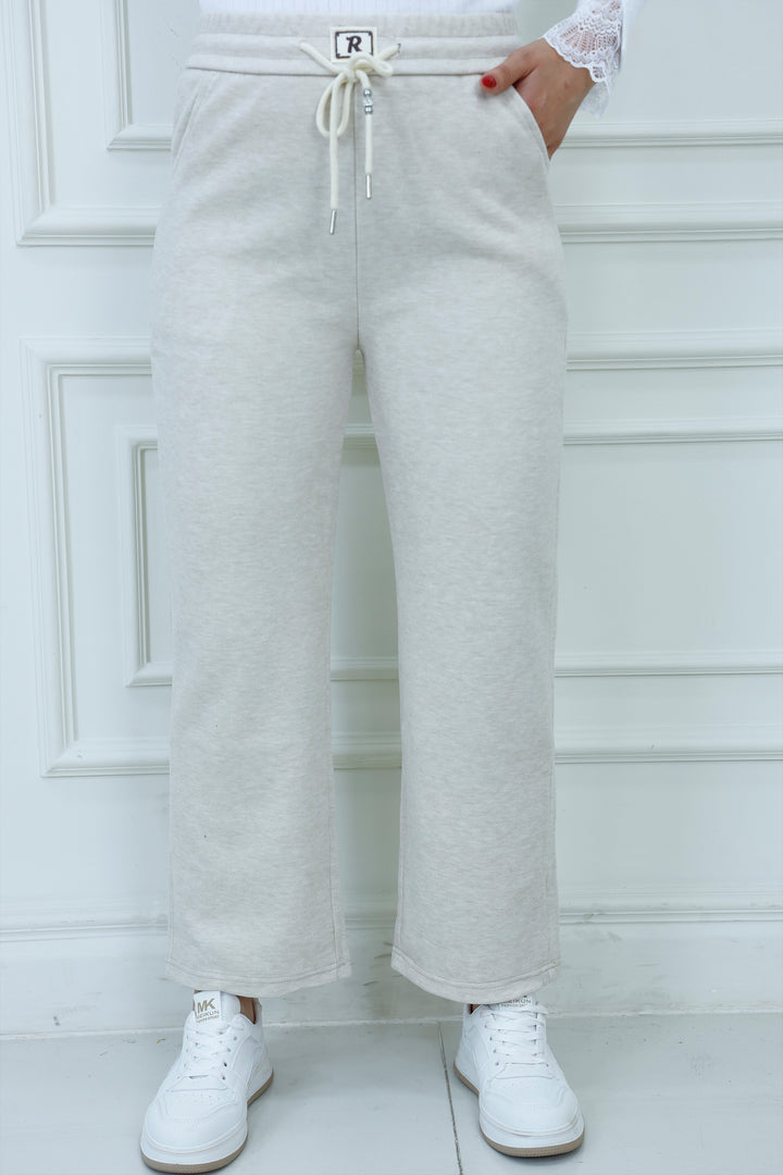 Refresh your casual wardrobe with our Signature Drawstring Sweatpants, designed in a soft neutral tone for effortless pairing. These pants feature a relaxed fit, elastic waistband with metal eyelets, and a decorative drawstring tipped with silver accents. A stitched “R” logo tag adds a subtle branded touch. Perfect for lounging, errands, or styling with modest tops and sneakers.