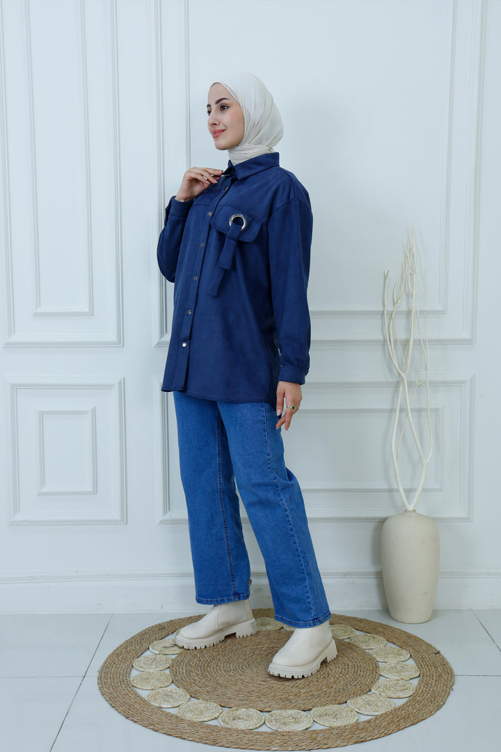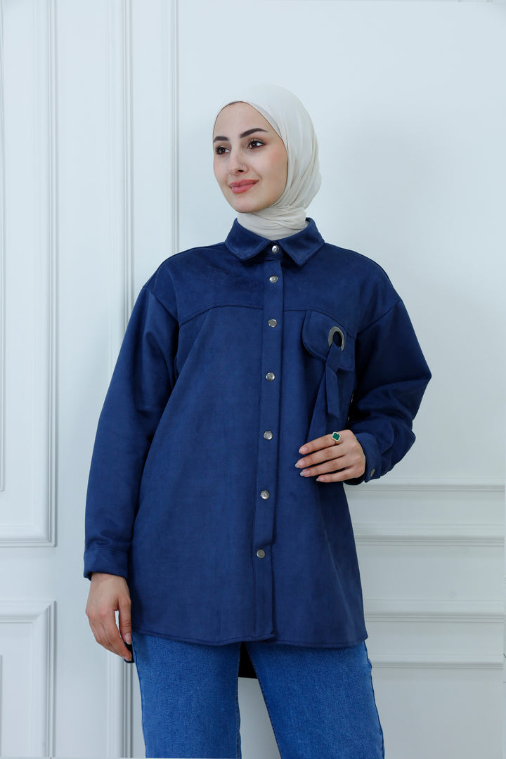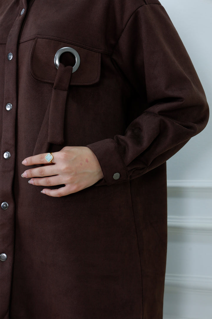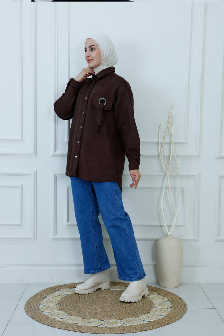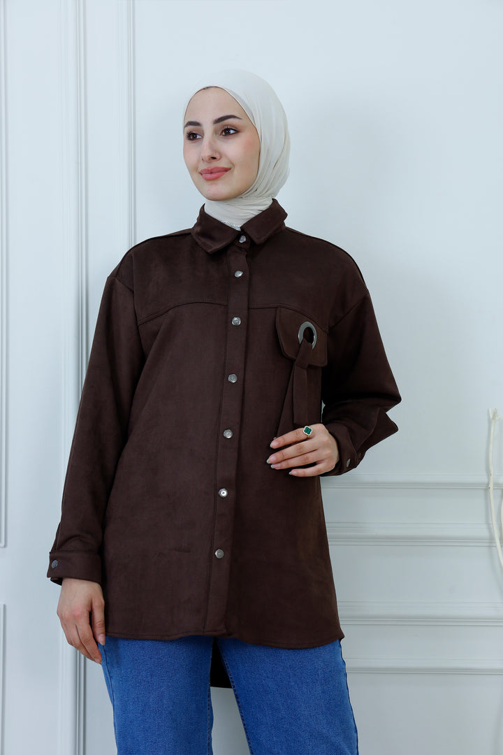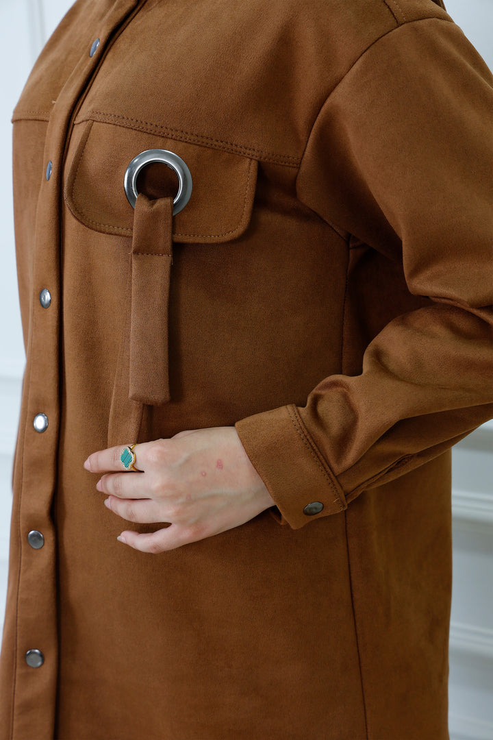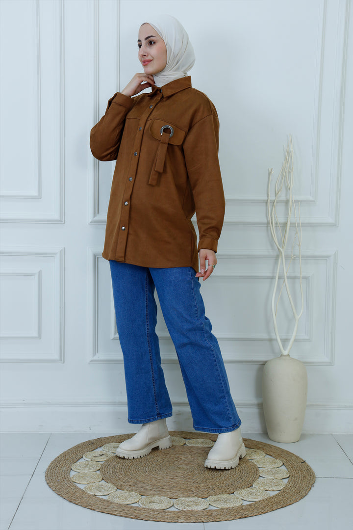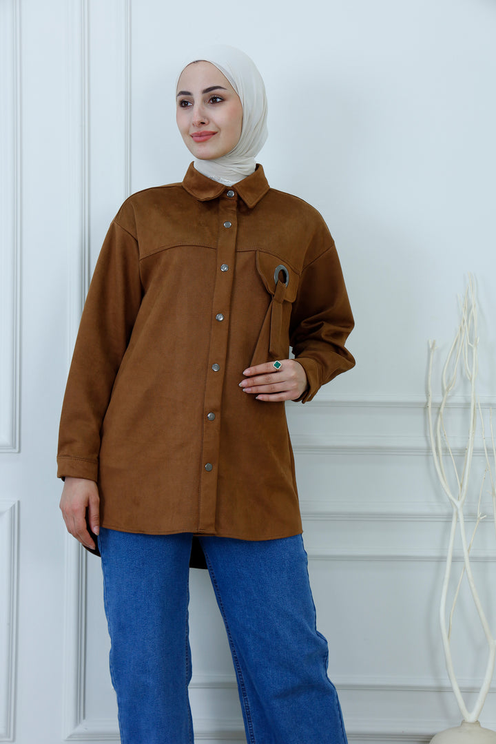 Layer up in effortless style with our Faux Suede Tunic Overshirt. This modern piece, often called a "shacket," perfectly combines the structure of a jacket with the comfort of a shirt. Crafted from a soft-touch, high-quality faux suede fabric in a rich camel brown, it's designed for both excellent coverage and sophisticated texture.