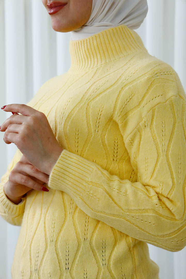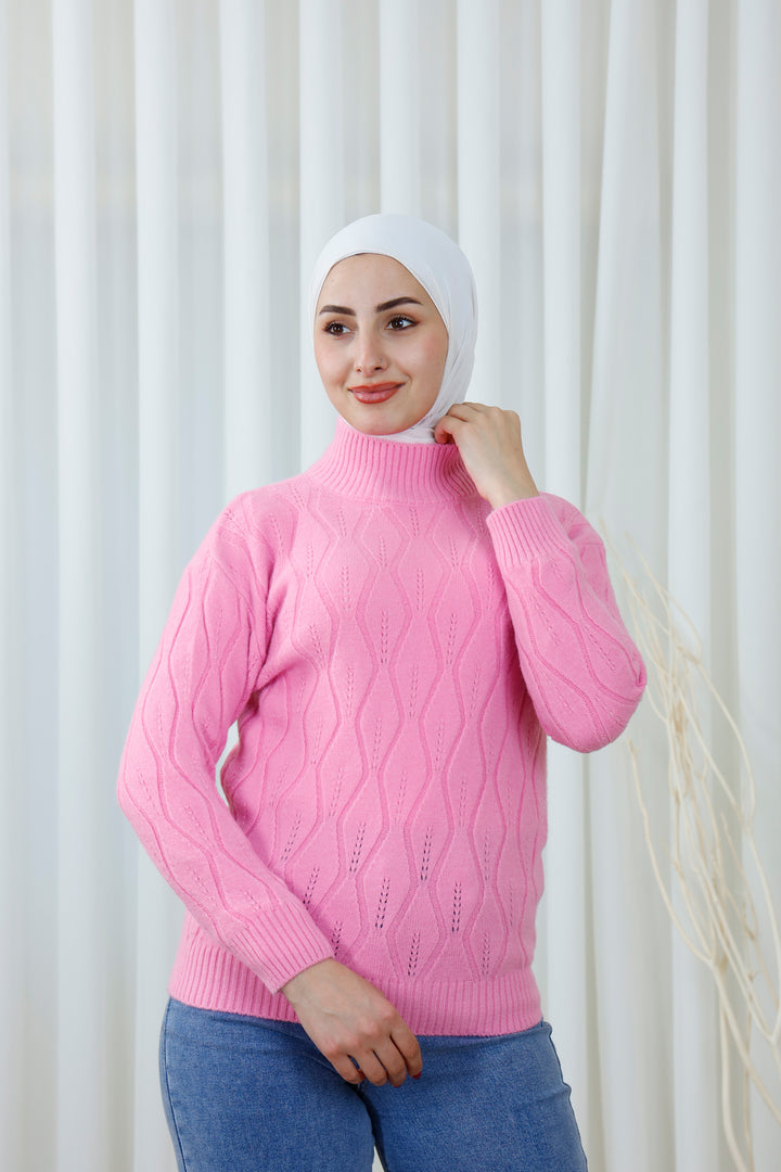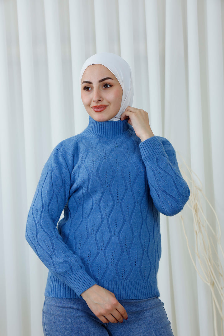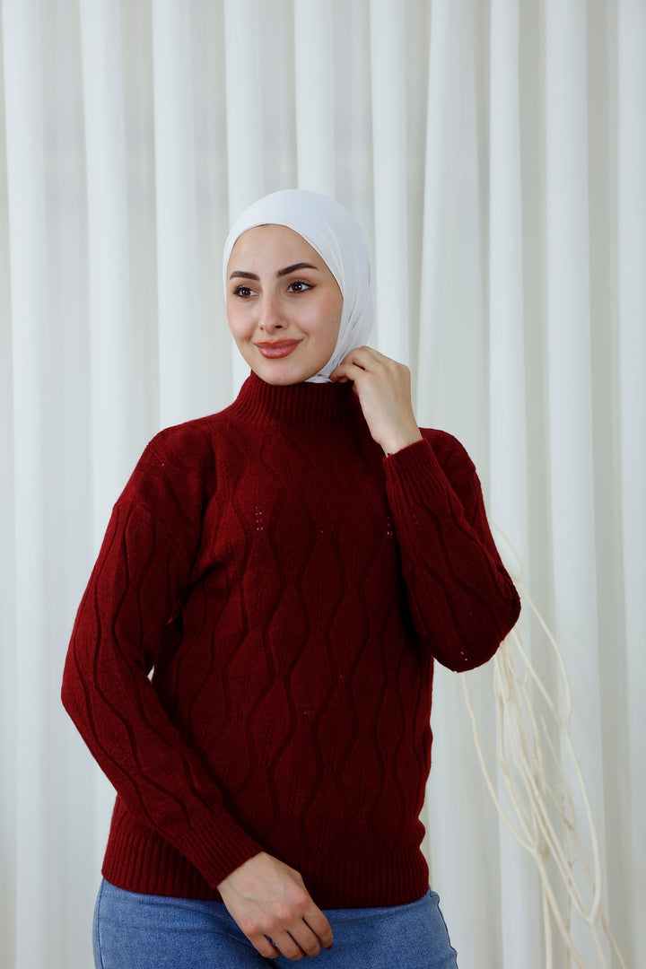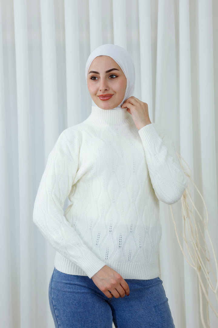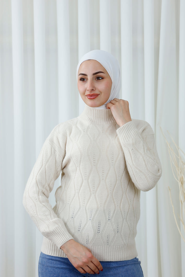 Bring subtle elegance to your wardrobe with this high-neck sweater featuring a beautifully textured vertical pattern and delicate decorative details. Designed with a relaxed silhouette and a cozy neckline, this piece blends modest fashion with timeless charm. The intricate design adds depth and visual interest, making it perfect for layering or wearing solo.