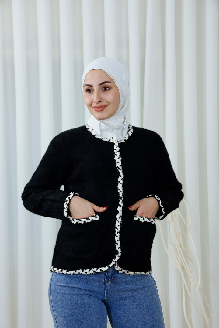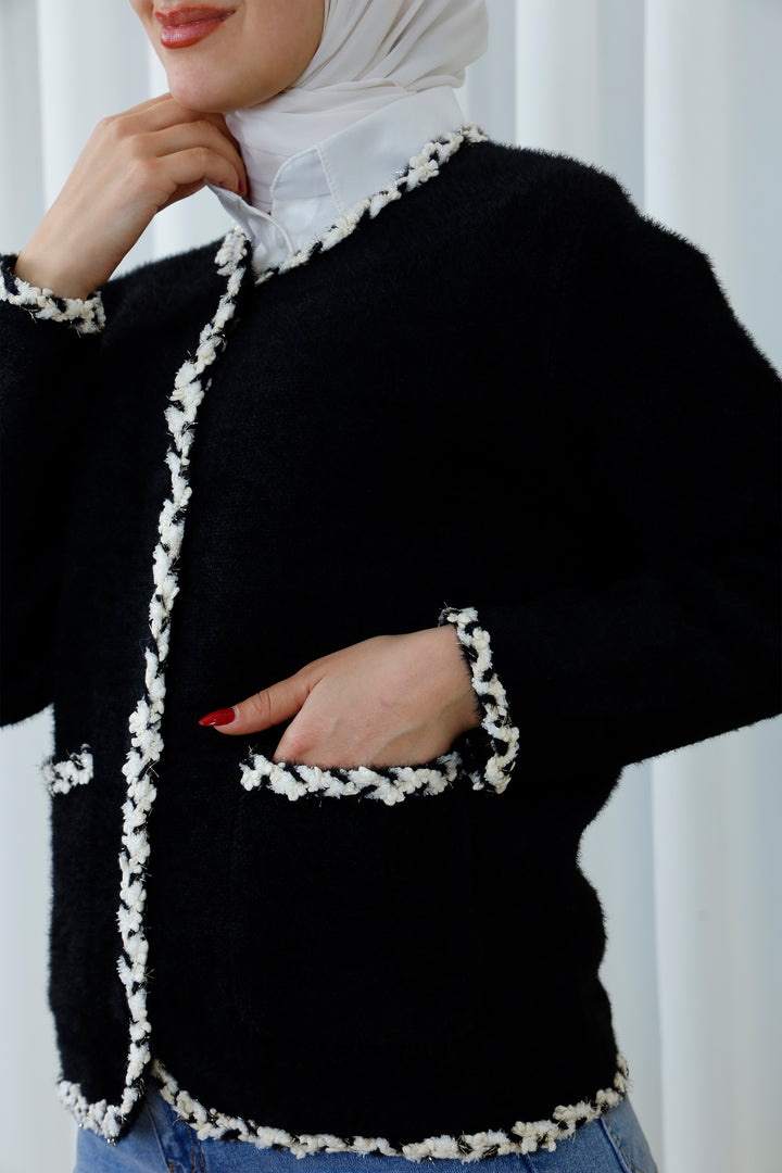 Refine your outerwear with this textured jacket featuring bold black-and-white braided trim along the edges, cuffs, and pockets. Designed with a structured silhouette and two front pockets, this piece blends classic tailoring with modern detail. The contrast trim adds visual interest, while the clean finish makes it ideal for modest fashion and polished layering.
