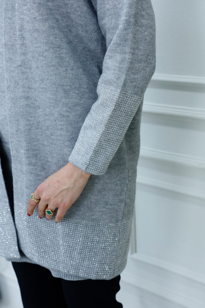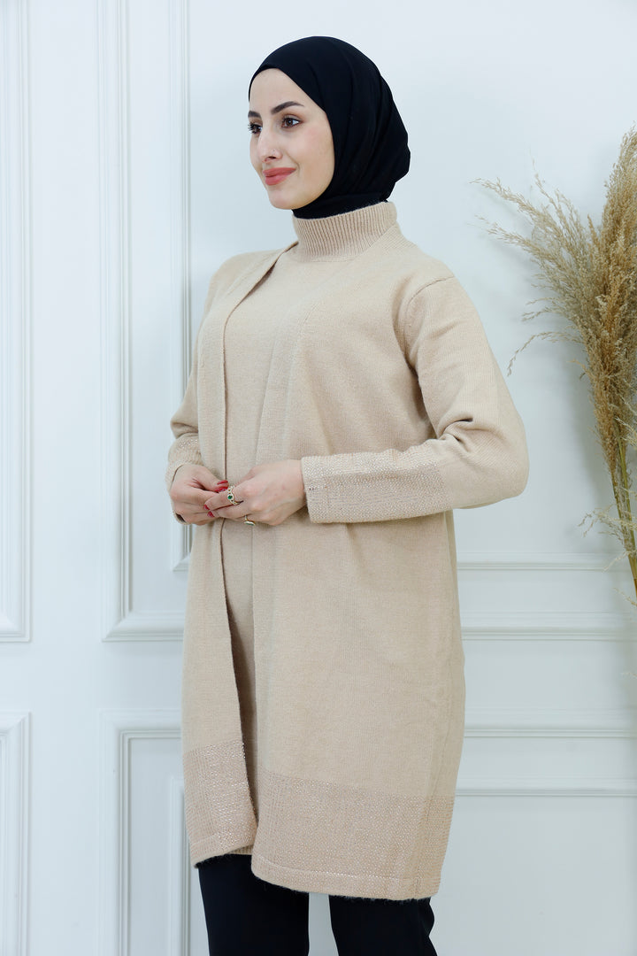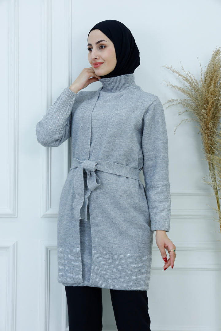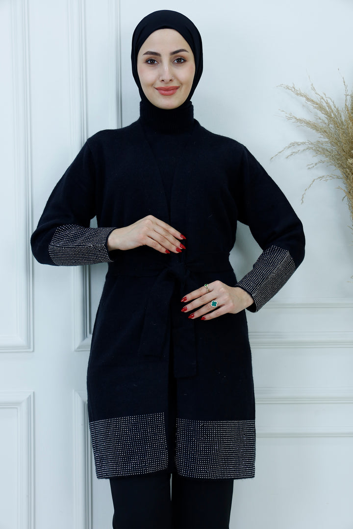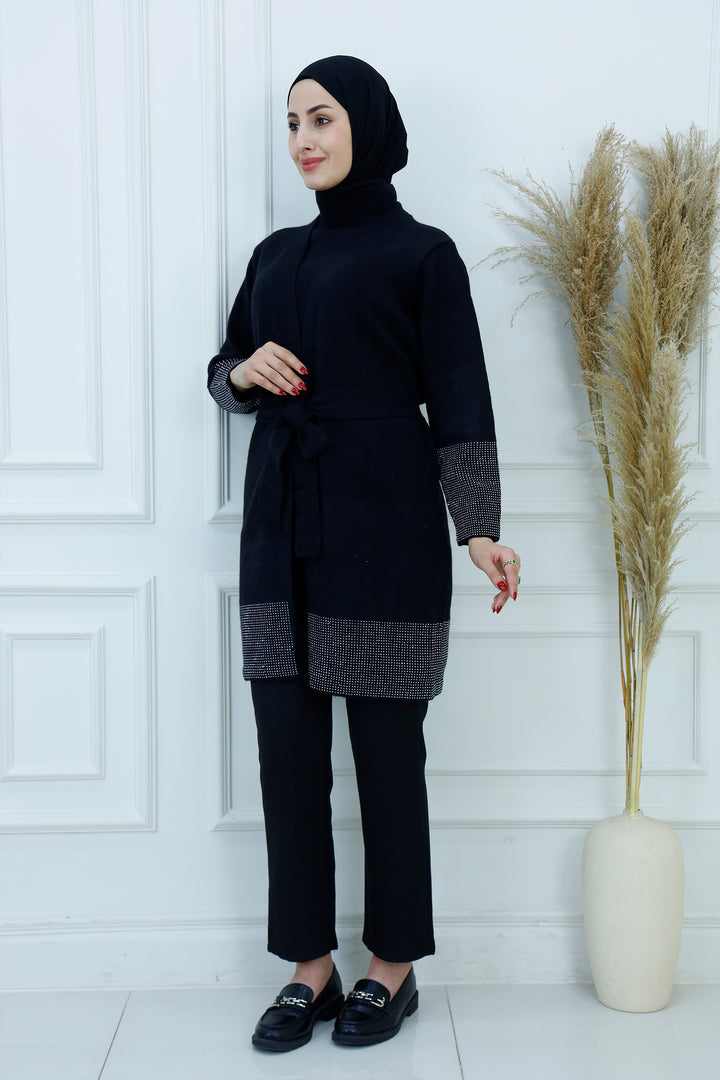Add a touch of sparkle to your wardrobe with this elegant twins set, featuring a high-neck knit top and a matching textured cardigan. Designed for modest comfort, the cardigan includes ribbed cuffs and hem, a belted waist, and strass embellishments along the sleeves and bottom edge for a refined finish. The soft knit fabric offers warmth and flexibility, making it ideal for layering in cooler seasons.