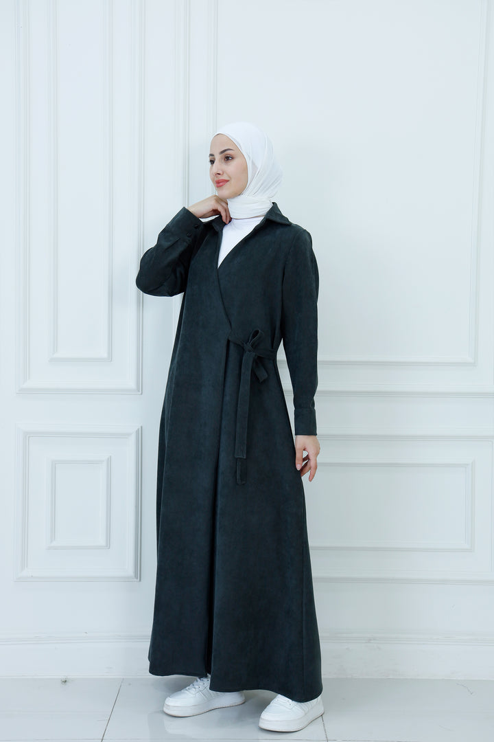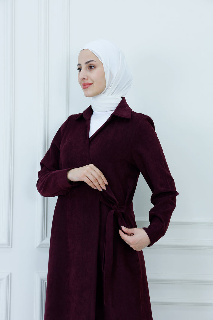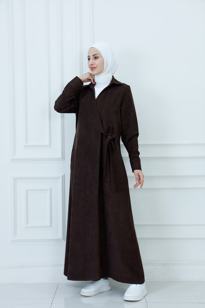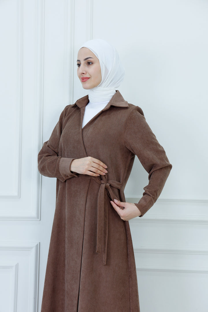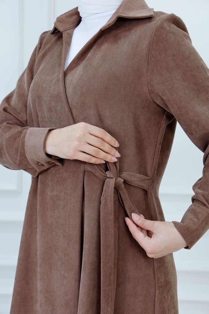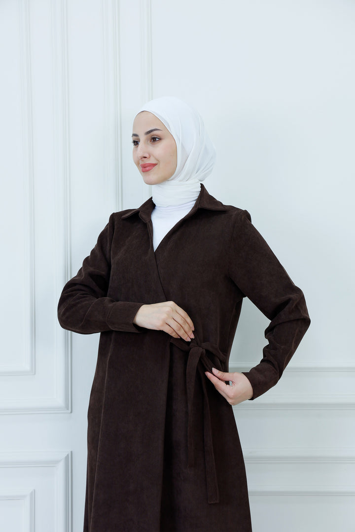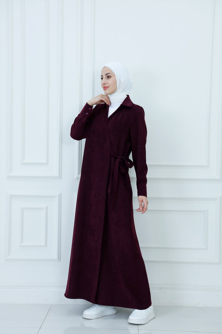 Step out in cozy elegance with The Collared Long Wrap Duster . This floor-length coat is crafted from a wonderfully soft, textured material that provides exceptional warmth and a rich feel. The classic wrap silhouette ensures a customizable, flattering fit, secured simply with the matching self-tie belt. Featuring a timeless pointed collar and buttoned cuffs, this versatile piece is perfect for layering over any outfit. Wear it as a long jacket or as a belted dress for a sophisticated, full-coverage look that transitions seamlessly from day to evening.