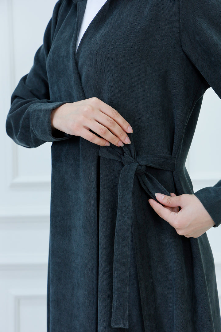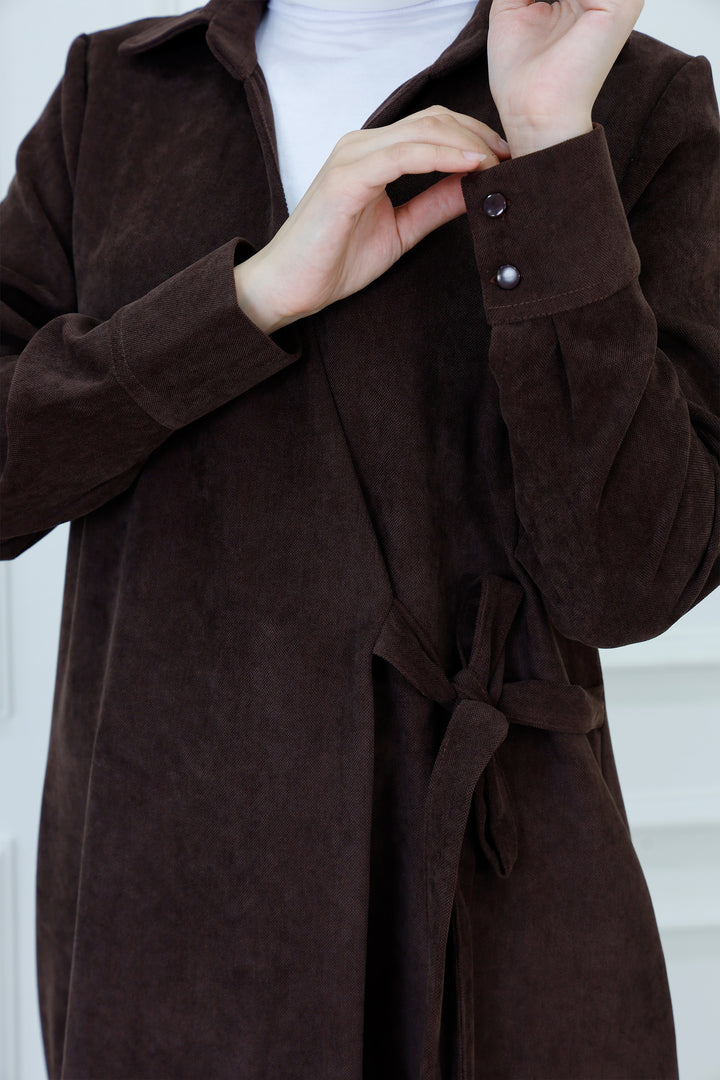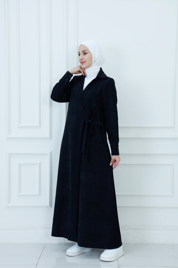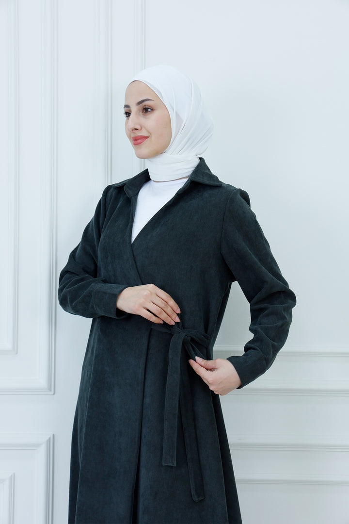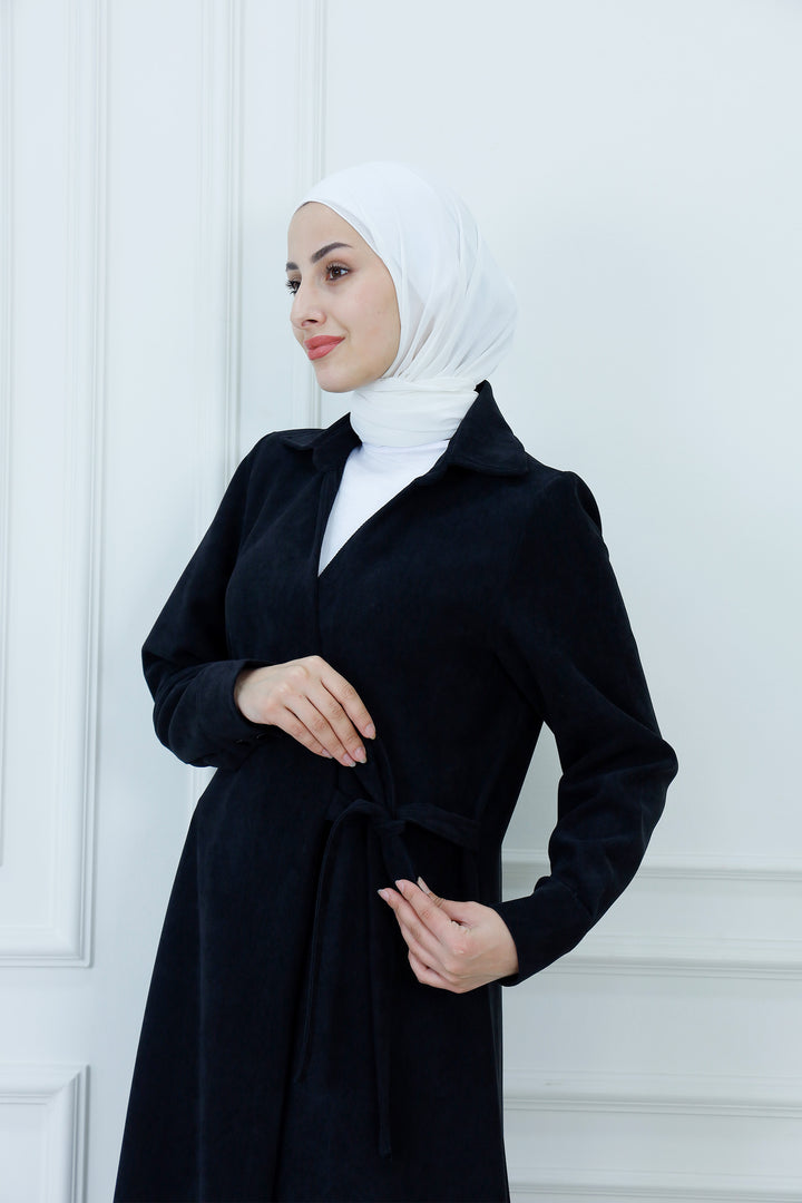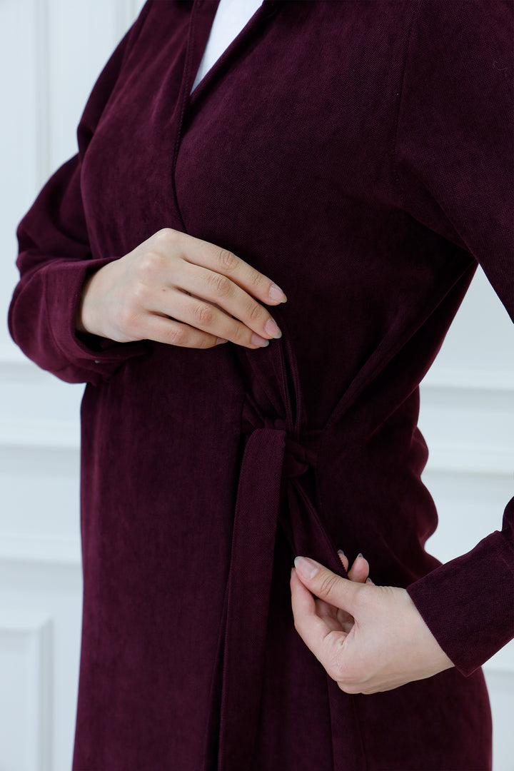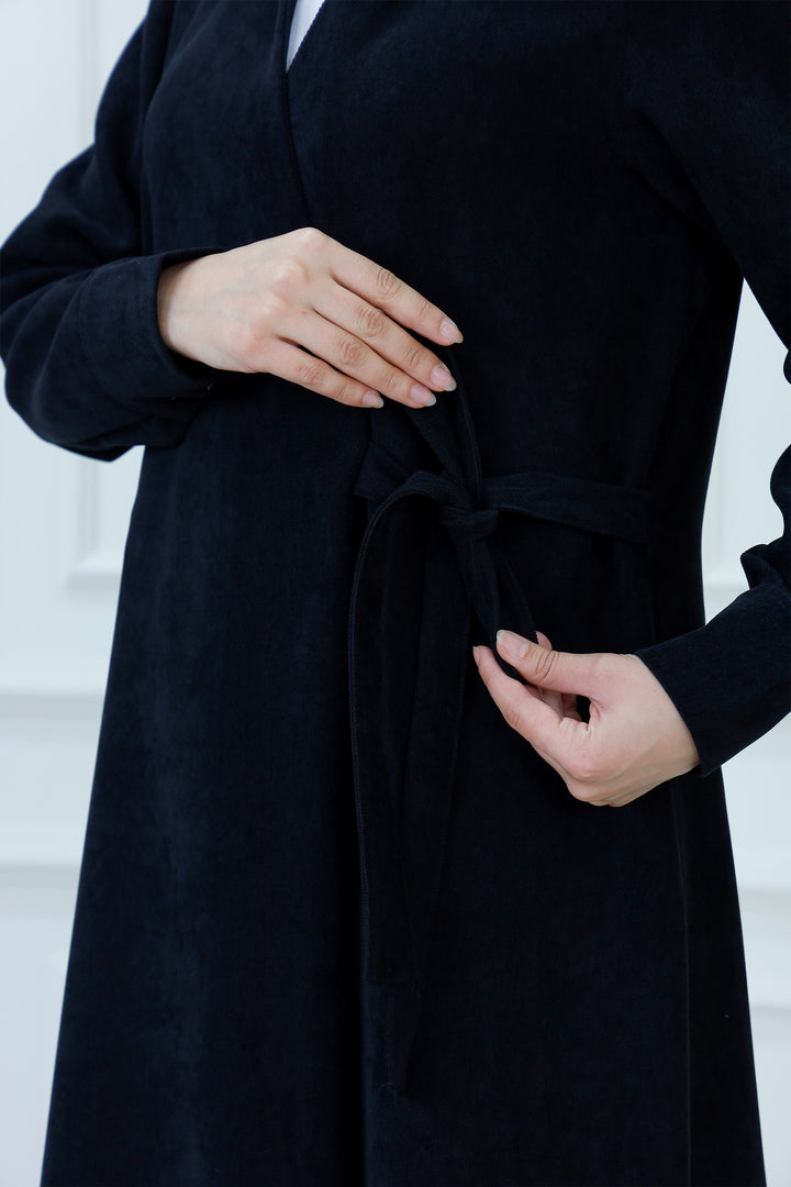 Step out in cozy elegance with The Collared Long Wrap Duster . This floor-length coat is crafted from a wonderfully soft, textured material that provides exceptional warmth and a rich feel. The classic wrap silhouette ensures a customizable, flattering fit, secured simply with the matching self-tie belt. Featuring a timeless pointed collar and buttoned cuffs, this versatile piece is perfect for layering over any outfit. Wear it as a long jacket or as a belted dress for a sophisticated, full-coverage look that transitions seamlessly from day to evening.