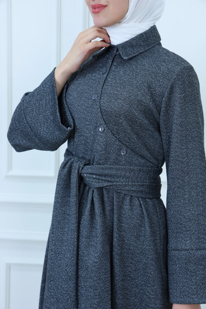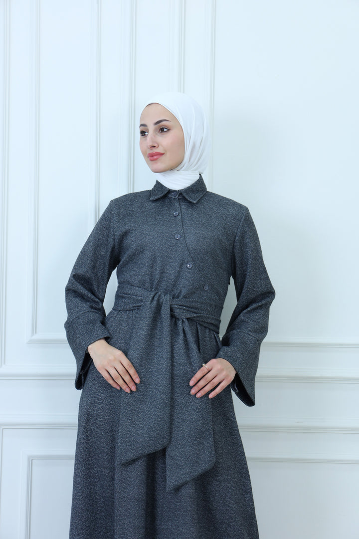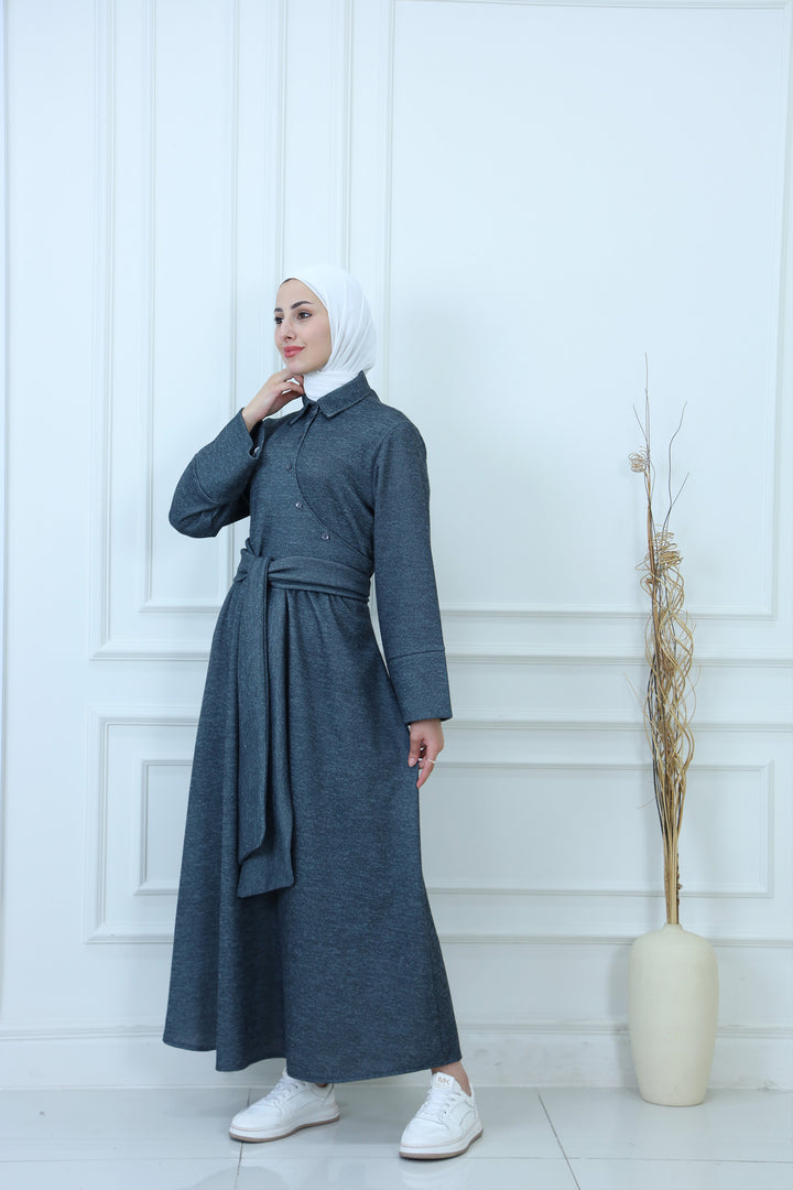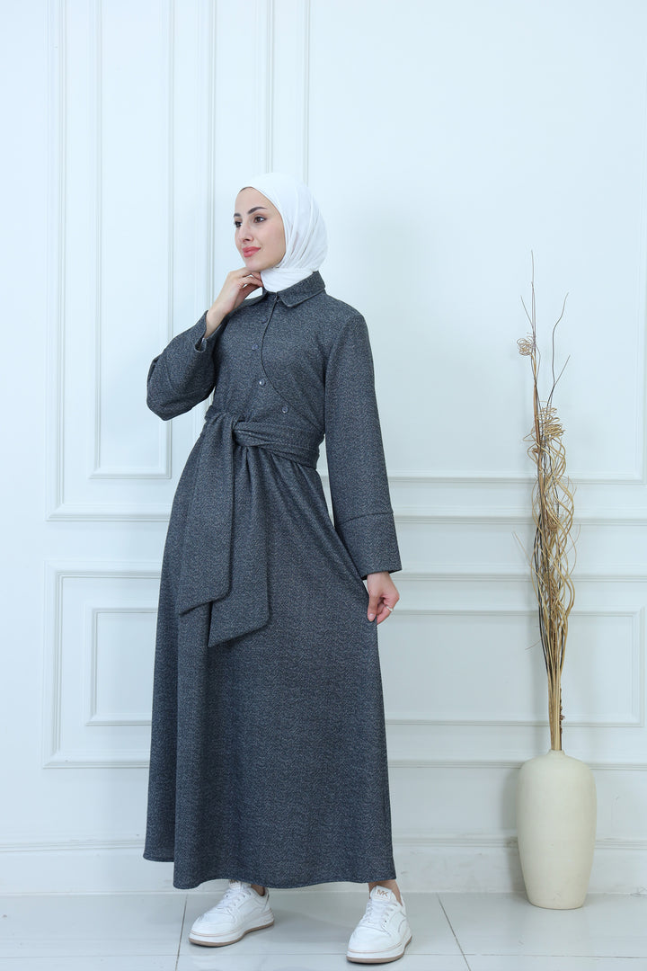 The dress features a convenient full zip-front closure leading up to a neat, high collar for added coverage. Made from a comfortable and structured fabric (likely a suedette or brushed knit), it provides a beautiful drape. Details like the large side pockets and elasticated cuffs add practicality and a casual charm.