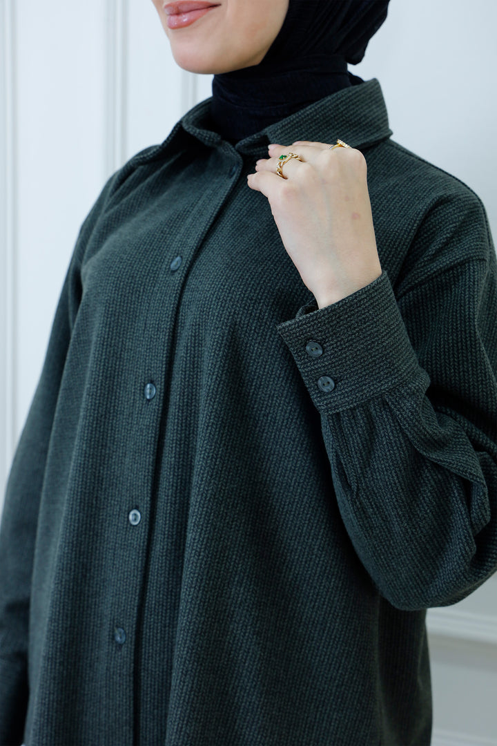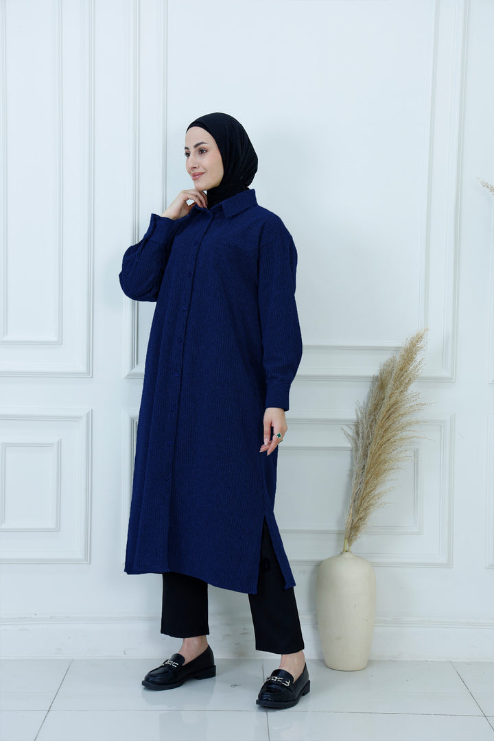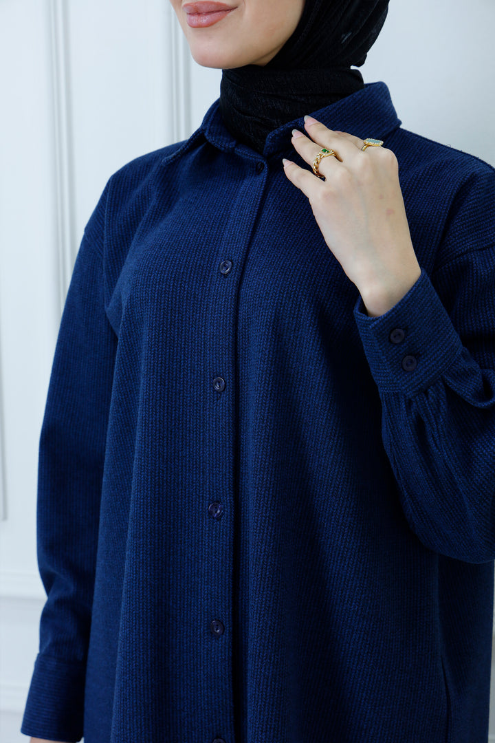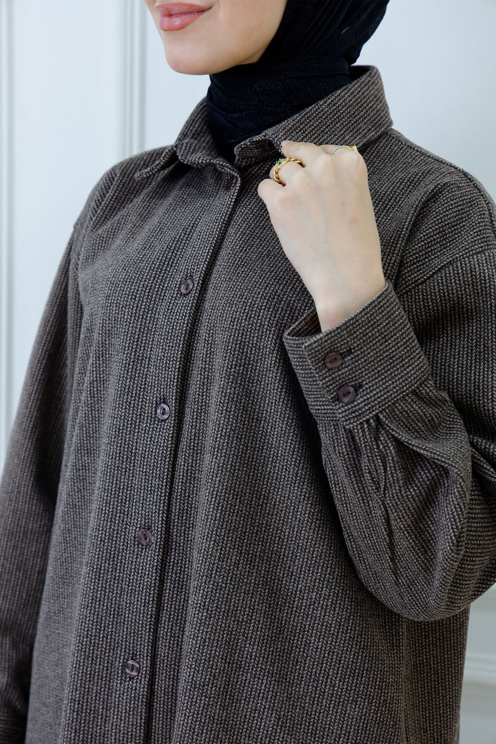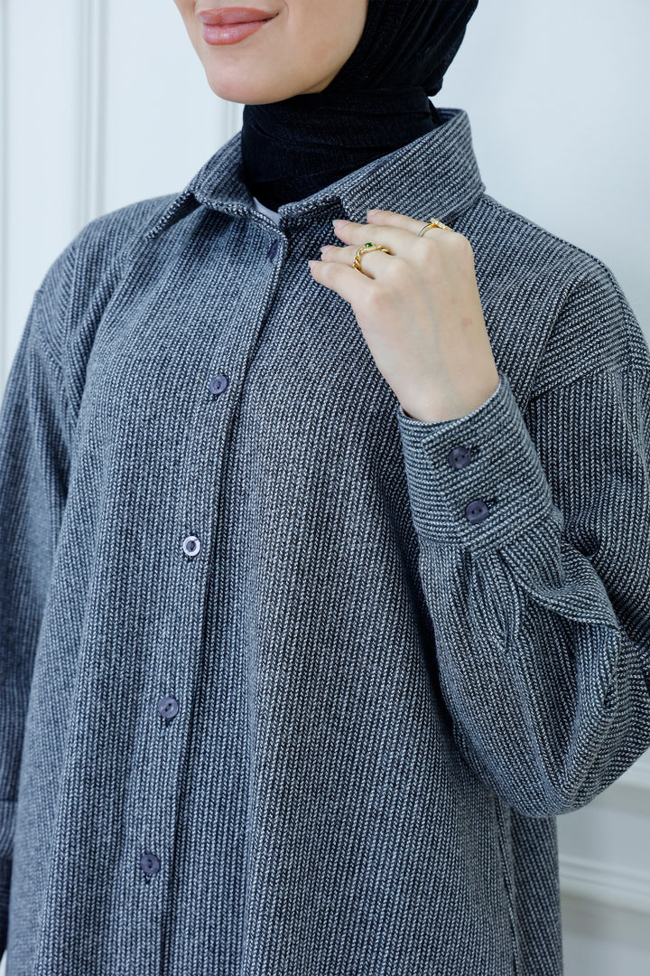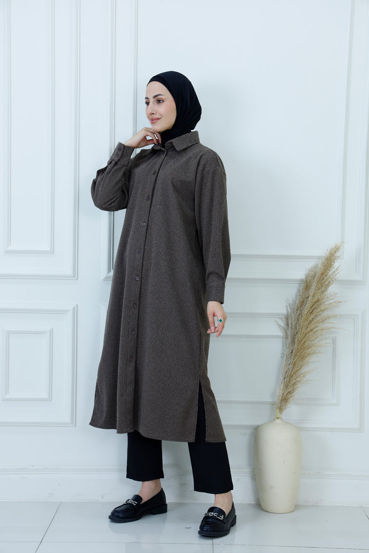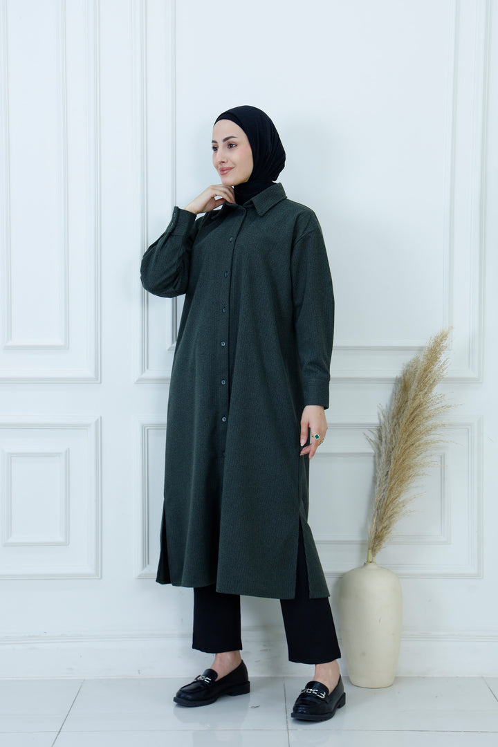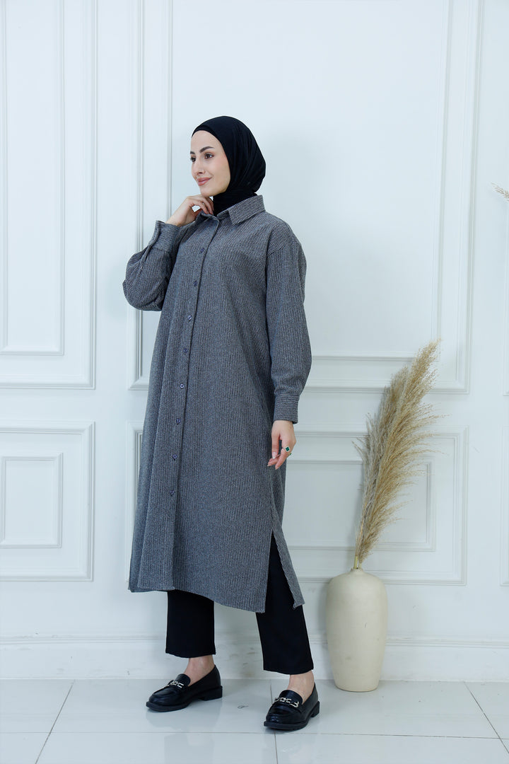 Elevate your daily rotation with the Heritage Pattern Longline Tunic. Crafted from a warm, structured fabric featuring a subtle micro-pattern (or houndstooth-like pattern), this tunic offers both polished style and superior comfort. It is designed with a classic collared neckline, a full button-front, and a generous, elongated length for effortless layering and coverage. Finished with stylish side slits for ease of movement and sophisticated buttoned cuffs.