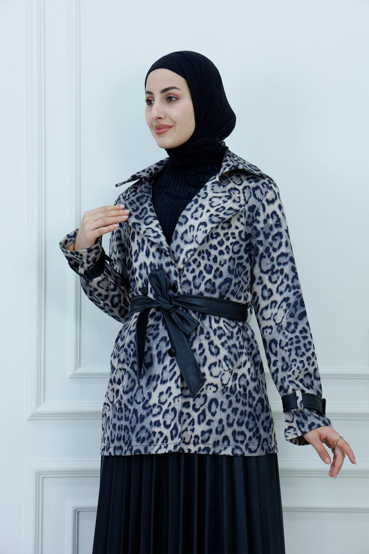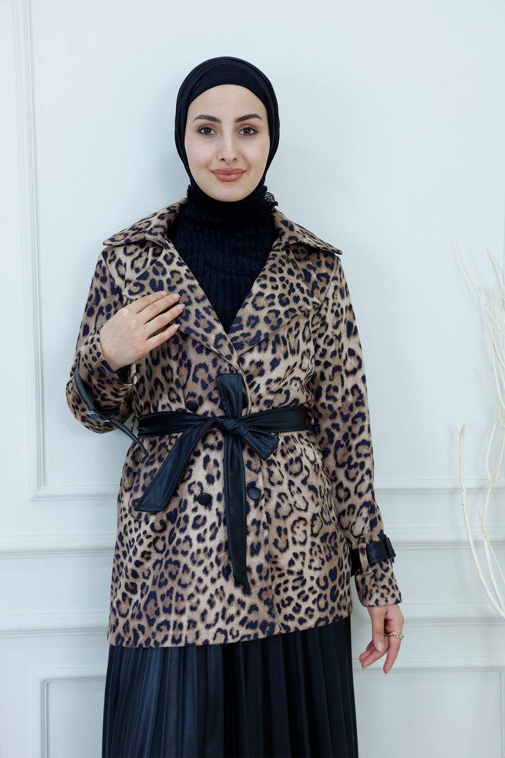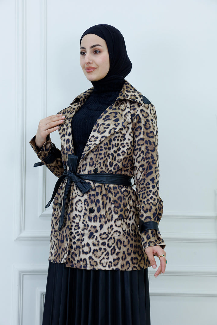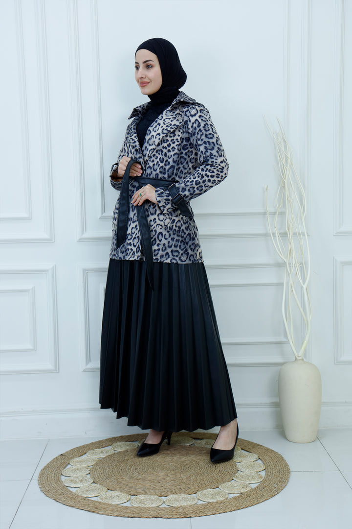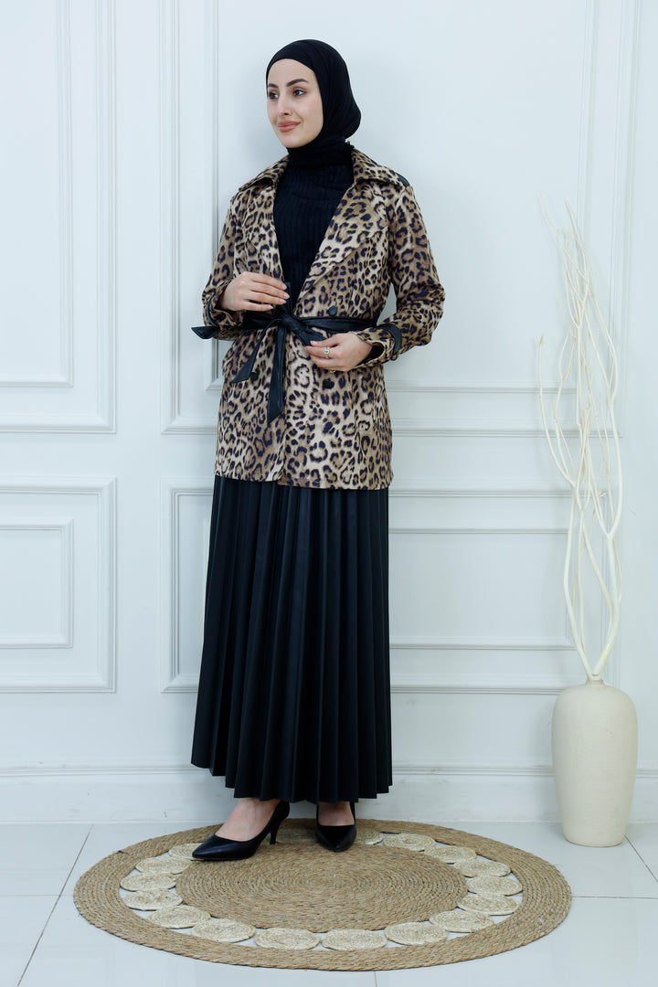 Achieve a polished and sophisticated look with this elegant two-piece skirt suit, which expertly blends a classic silhouette with luxurious textures. The suit pairs a tailored, shorter-length Tiger Print Blazer with a full, flowing Pleated Leather Skirt. This combination is ideal for creating an elevated, put-together ensemble suitable for special occasions or smart professional wear. Each piece is designed to coordinate beautifully as a set or to be styled separately for versatile dressing.