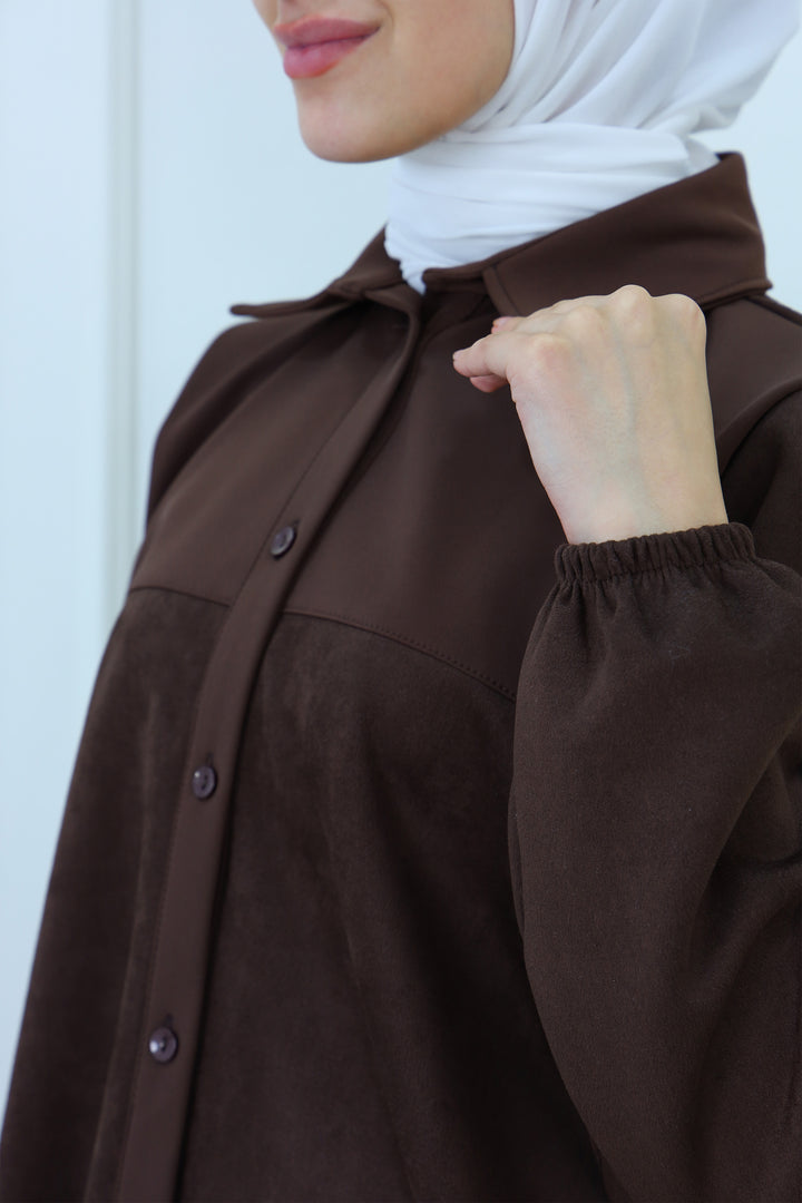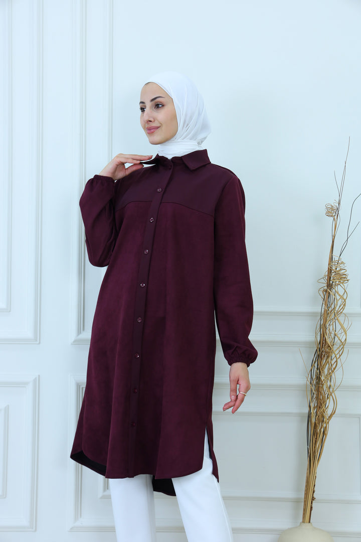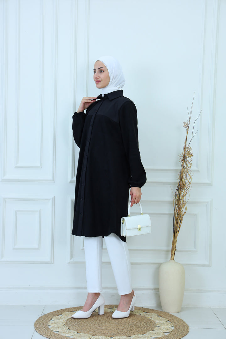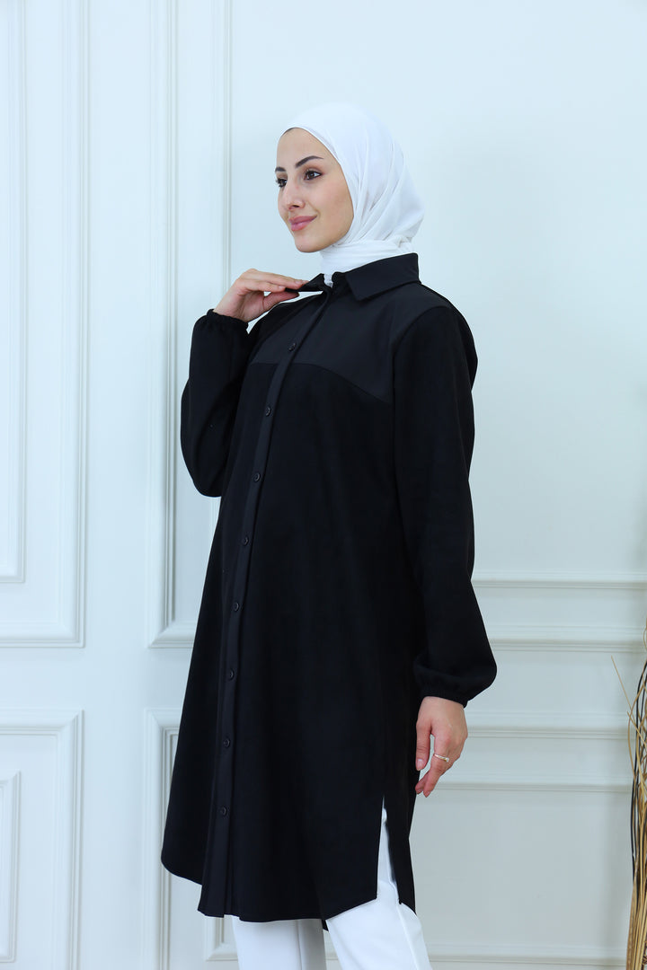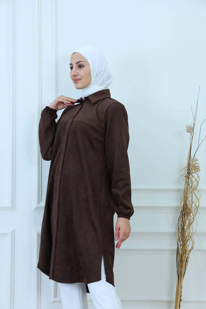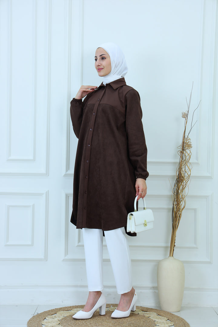 Elevate your everyday style with this chic two-tone long tunic, perfect for the Autumn/Winter season. Crafted from a soft suede-like fabric, this button-down shirt offers both warmth and sophisticated style, making it an essential piece for your modest fashion wardrobe.