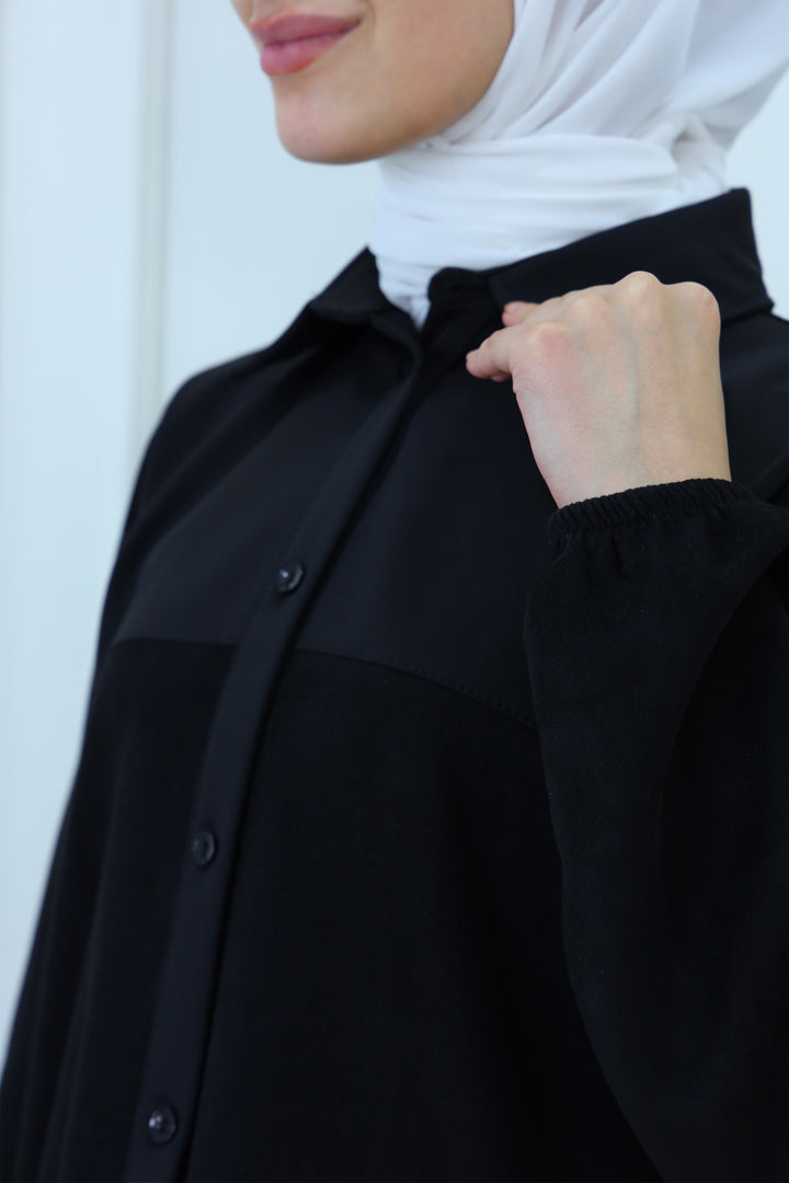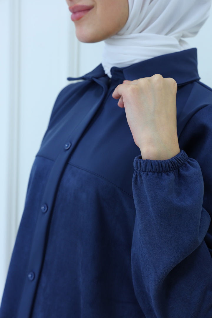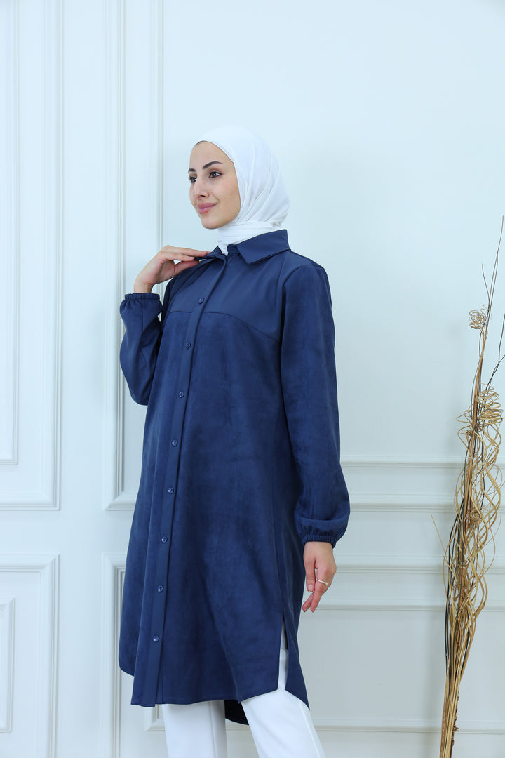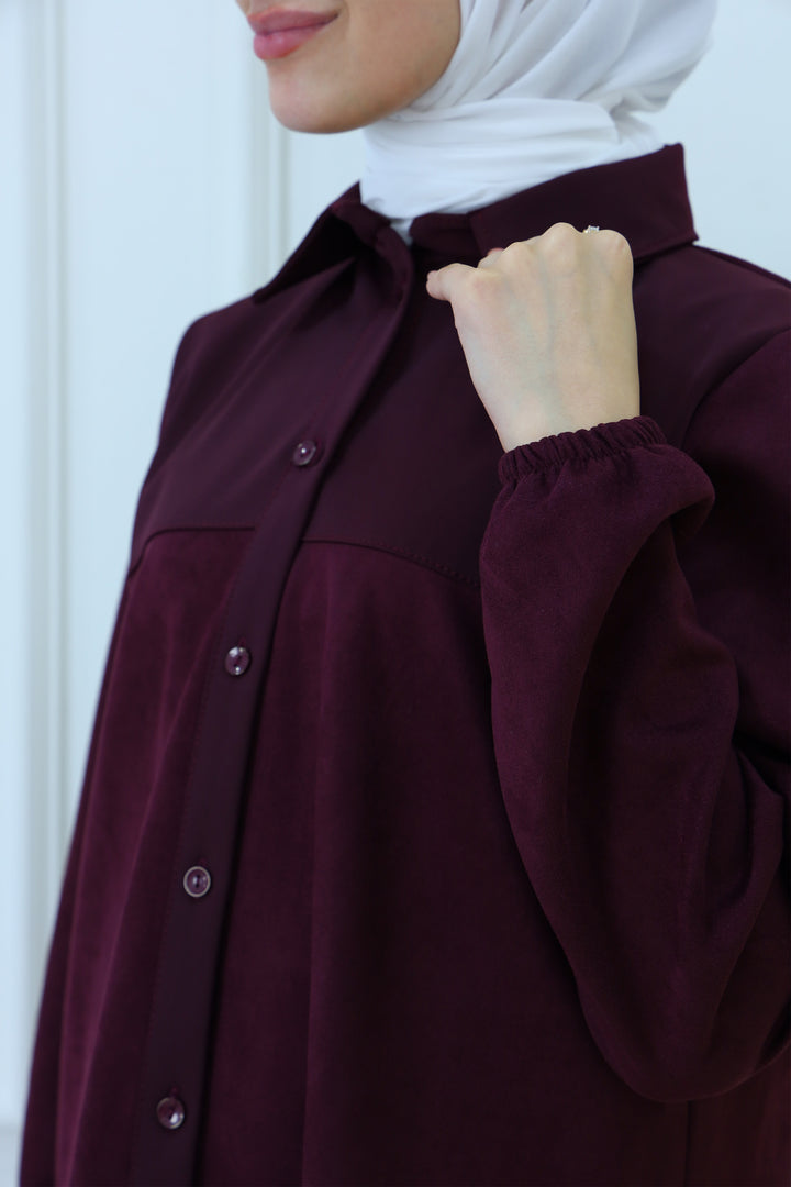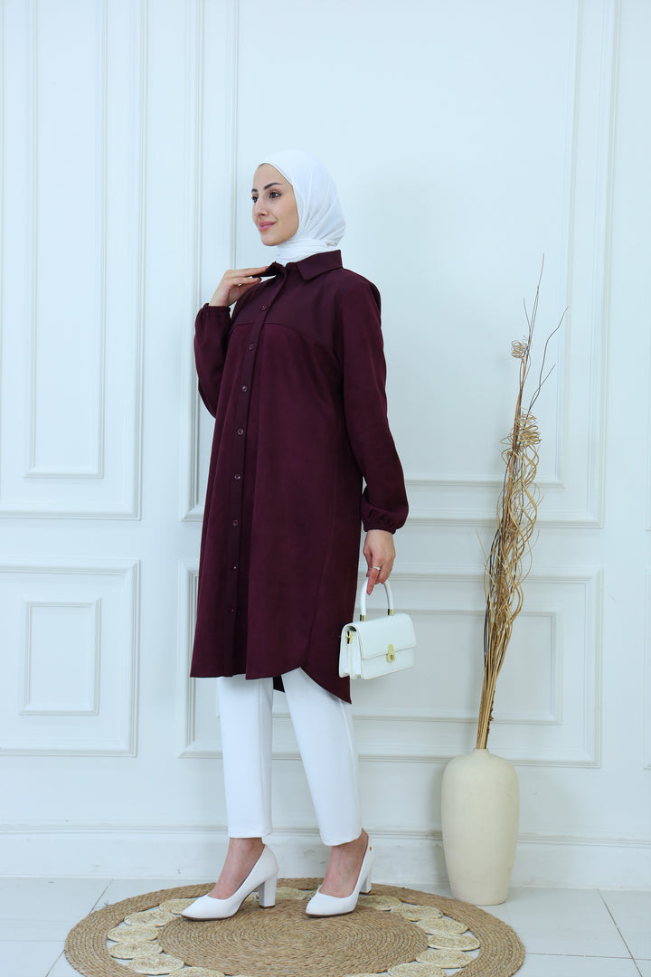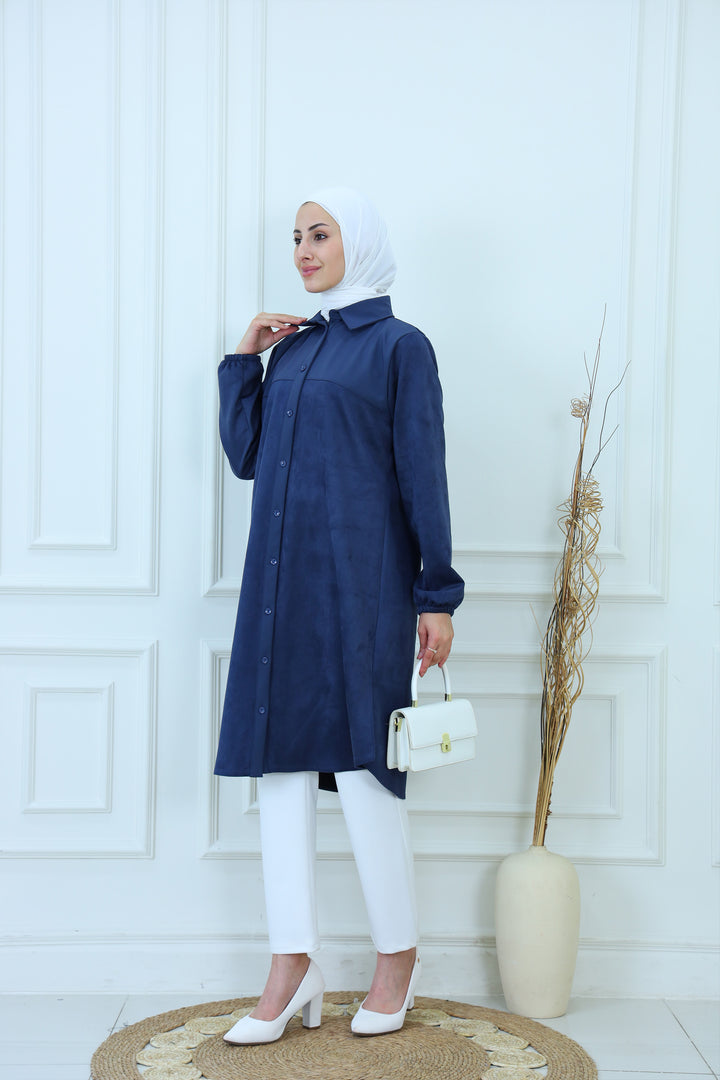 Elevate your everyday style with this chic two-tone long tunic, perfect for the Autumn/Winter season. Crafted from a soft suede-like fabric, this button-down shirt offers both warmth and sophisticated style, making it an essential piece for your modest fashion wardrobe.