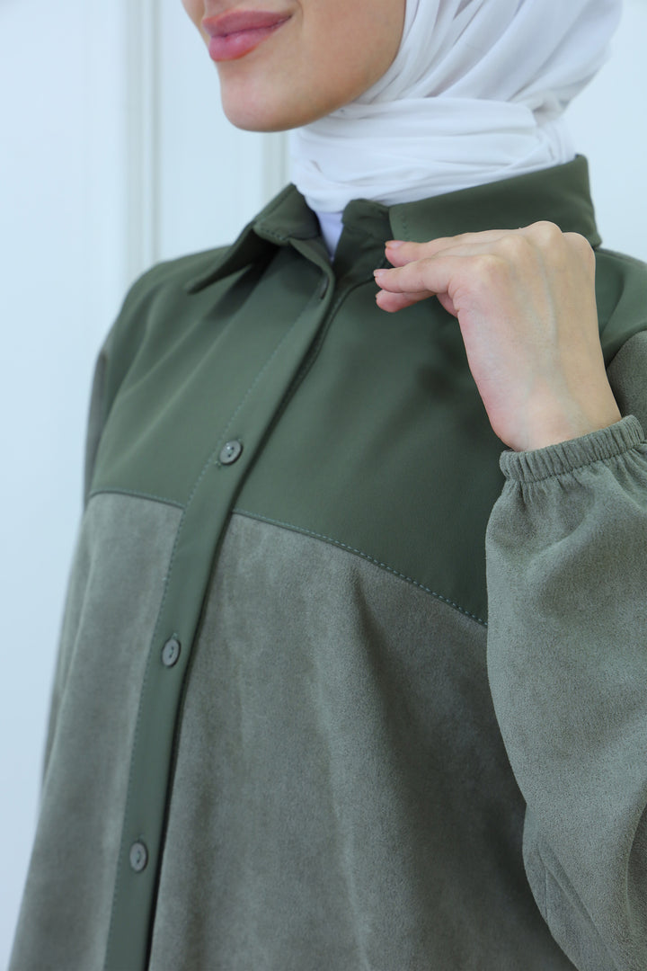 Two-Tone Suede-Look Long Tunic Shirt - Olive Green & Khaki | Modest & Elegant