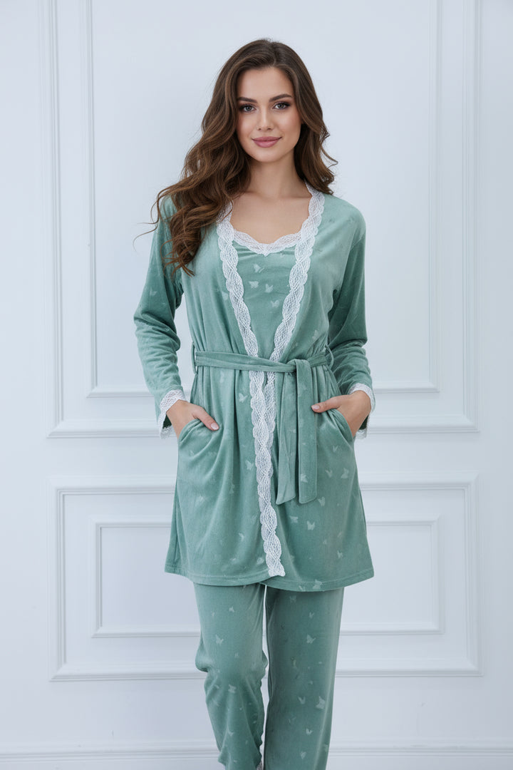 Crafted from soft, luxurious velvet fabric, this set includes a camisole top, long pants, and a matching robe — all beautifully detailed with delicate white lace trim for a feminine, graceful finish.