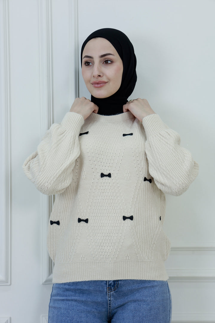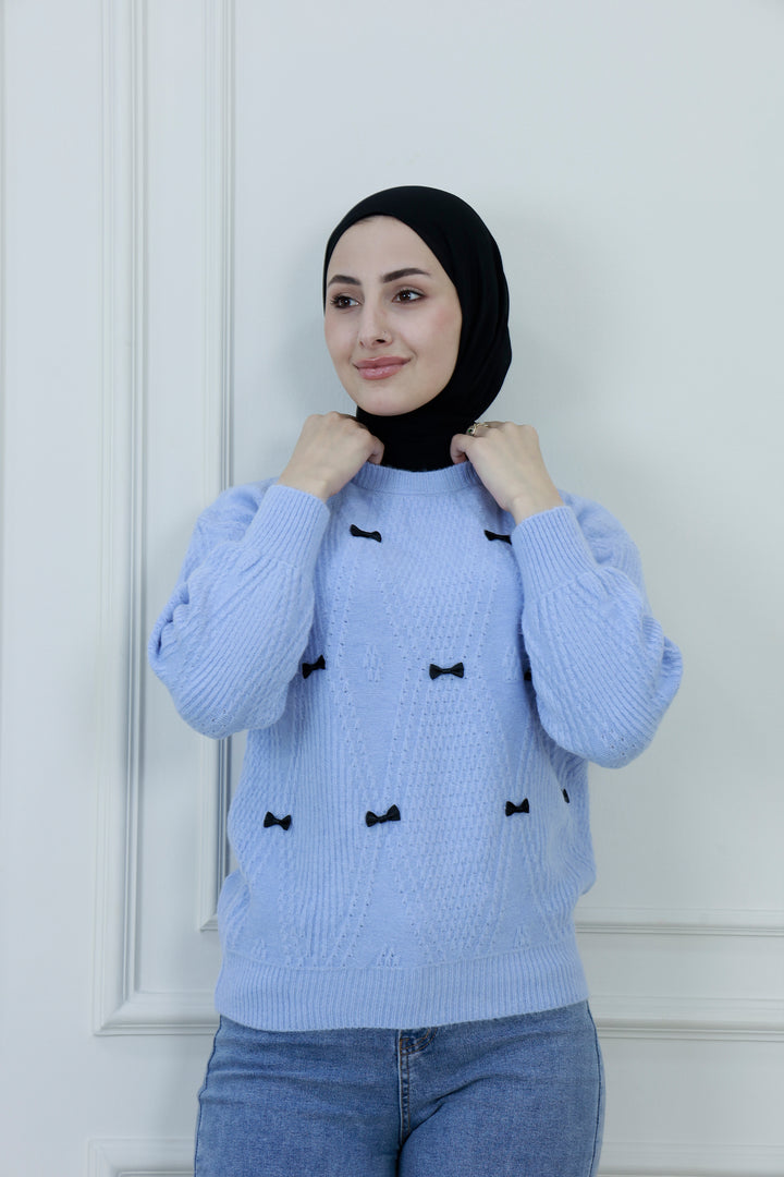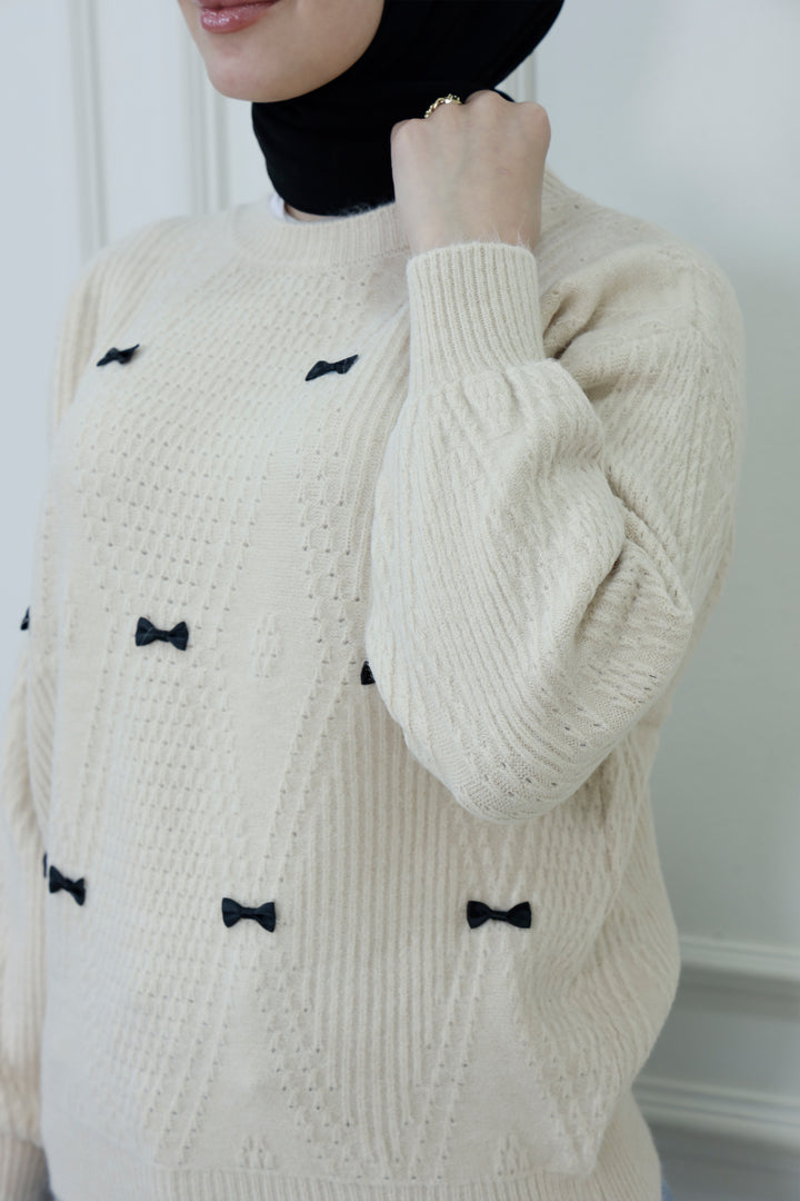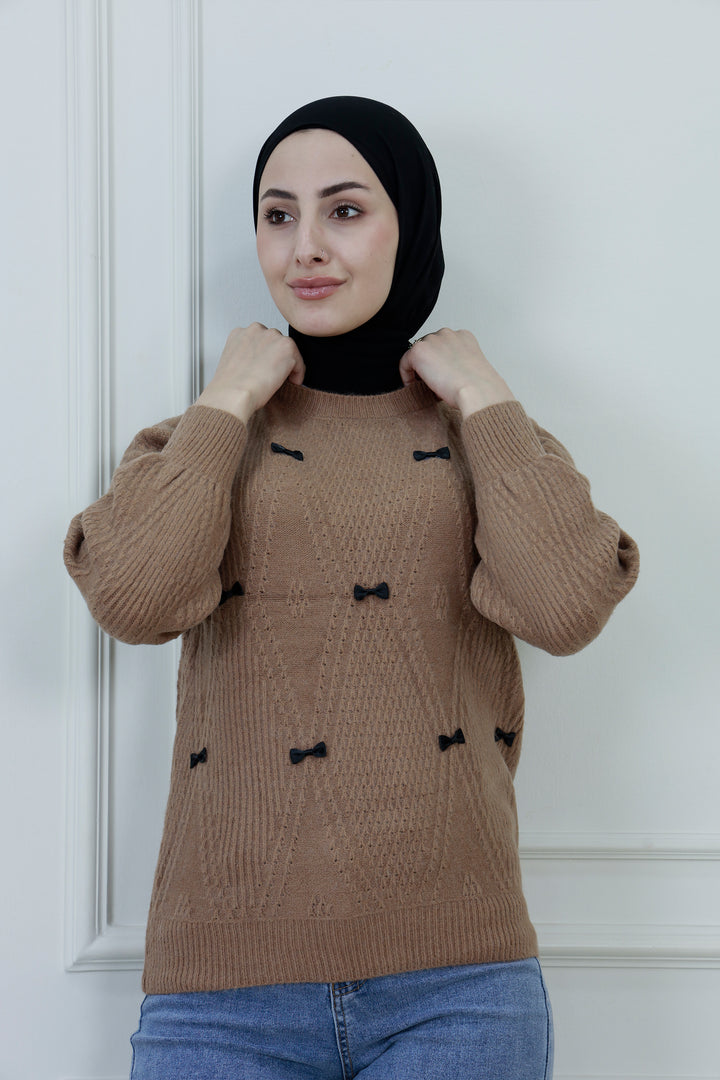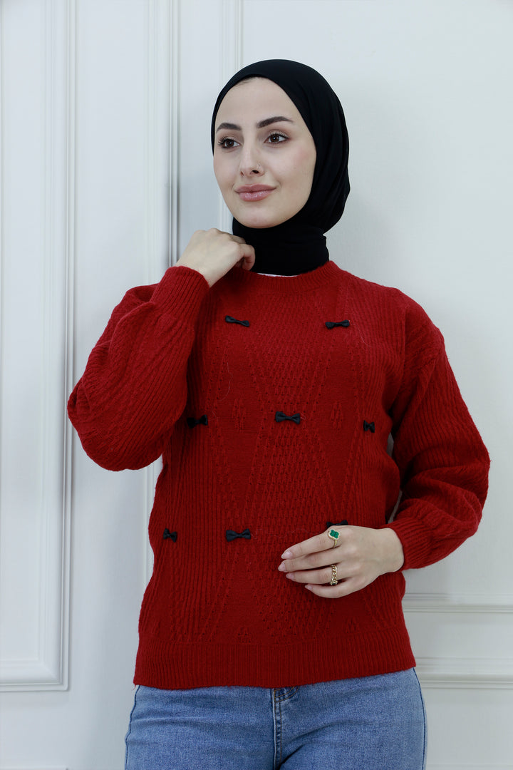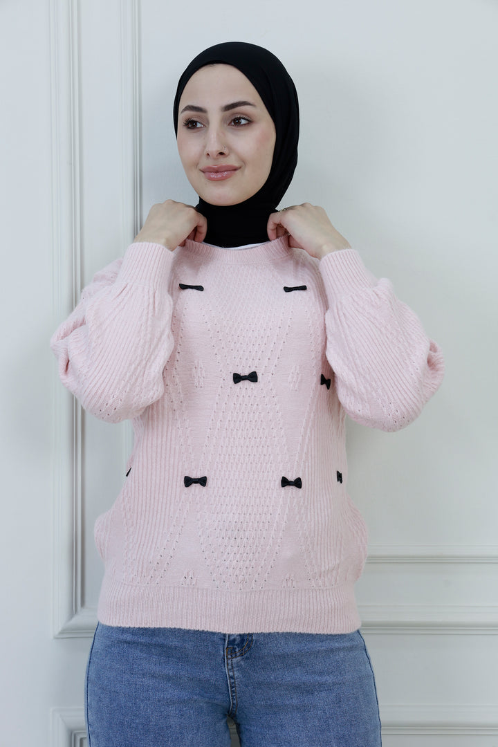 Add a touch of charm to your wardrobe with this bow-accent knit sweater, designed for cozy comfort and feminine flair. Featuring a soft pink base, textured diamond knit pattern, and delicate black bow details across the front, this sweater blends playful elegance with modest styling. The puffed sleeves and ribbed cuffs complete the look, making it perfect for casual outings or seasonal layering.