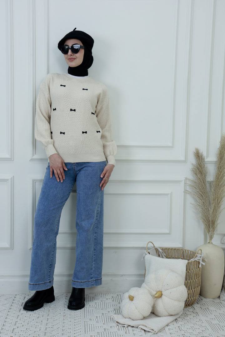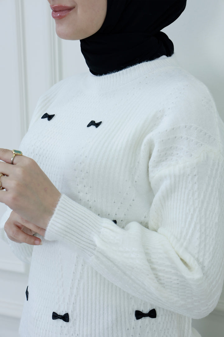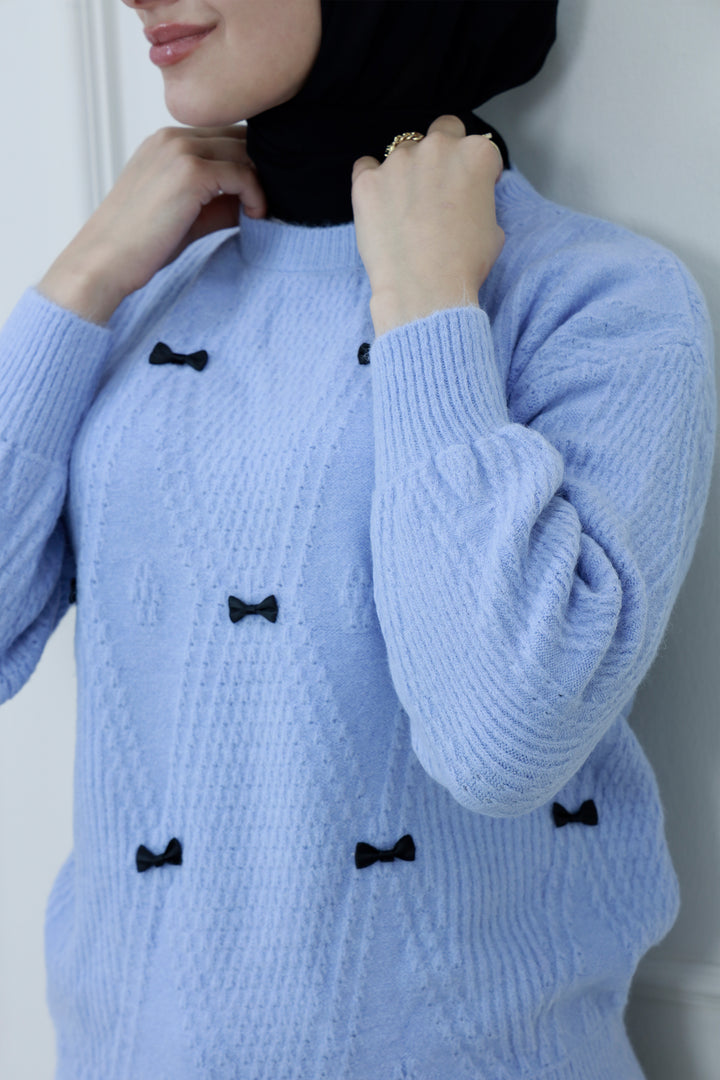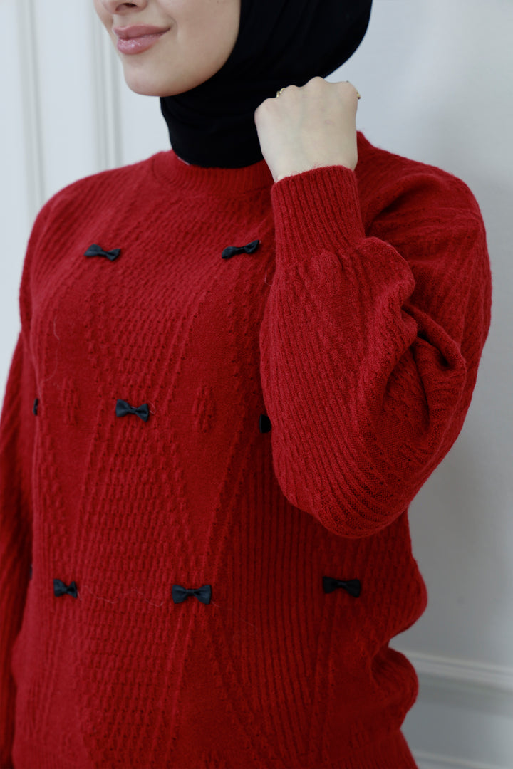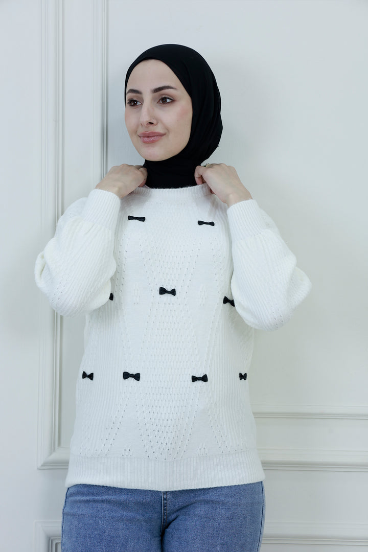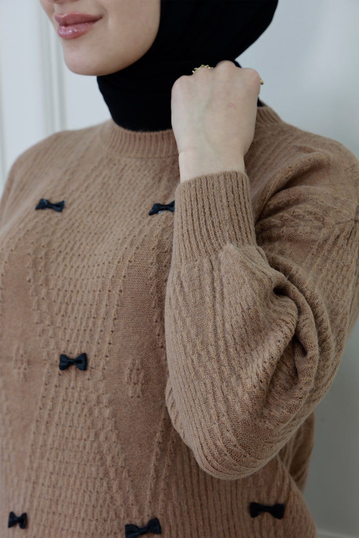 Add a touch of charm to your wardrobe with this bow-accent knit sweater, designed for cozy comfort and feminine flair. Featuring a soft pink base, textured diamond knit pattern, and delicate black bow details across the front, this sweater blends playful elegance with modest styling. The puffed sleeves and ribbed cuffs complete the look, making it perfect for casual outings or seasonal layering.