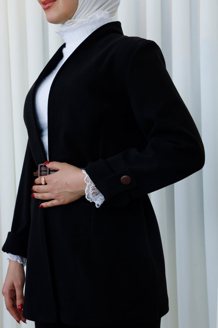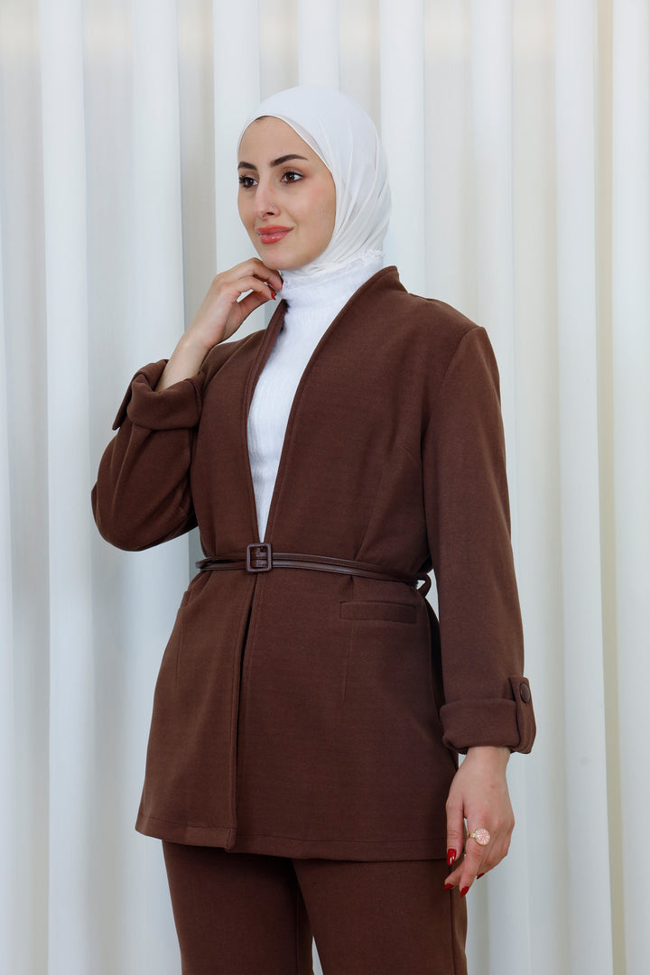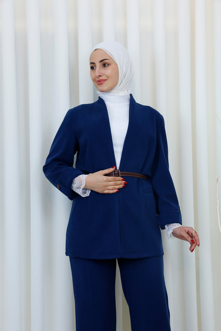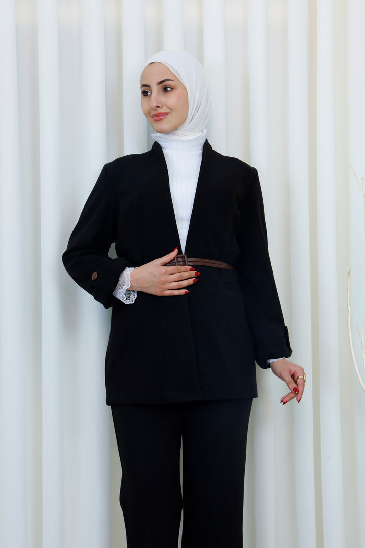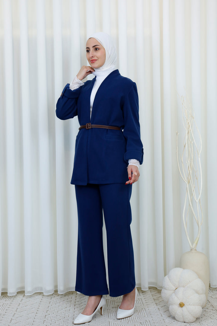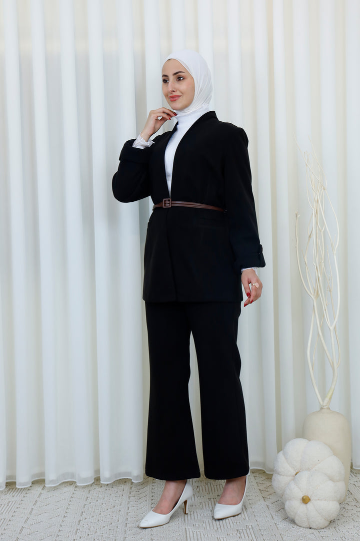 Step into confidence with this women’s modest formal suit set, crafted for comfort, class, and effortless style. The blazer features a clean open-front design with a slim belt that enhances the silhouette while maintaining modest coverage. The sleeves include a chic cuff detail with a buttoned finish for a tailored, high-end touch.