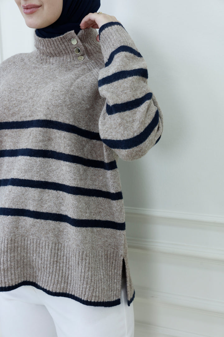 This striped knit sweater blends comfort with clean, modern style. Featuring horizontal navy stripes on a beige base, a high collar with decorative buttons, and side slits at the hem, it’s designed for modest fashion and everyday wear. The soft knit and relaxed fit make it ideal for layering in cooler seasons.