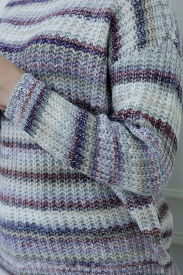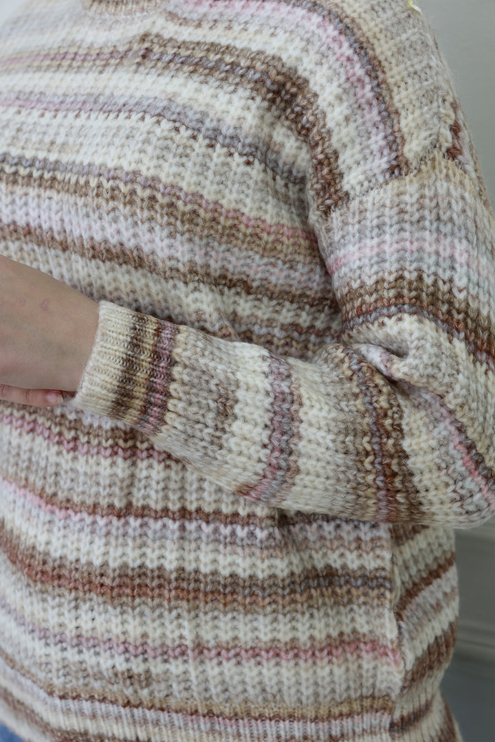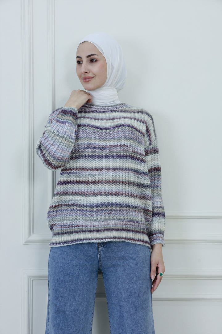 This striped knit sweater offers cozy comfort with a soft, earthy palette. Featuring horizontal stripes in beige, brown, cream, and subtle pink tones, it’s designed with a relaxed silhouette and ribbed cuffs for easy wear. Perfect for modest fashion and seasonal layering, this sweater adds warmth and style to any casual outfit.