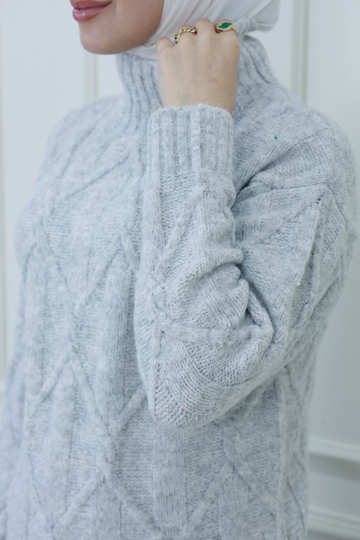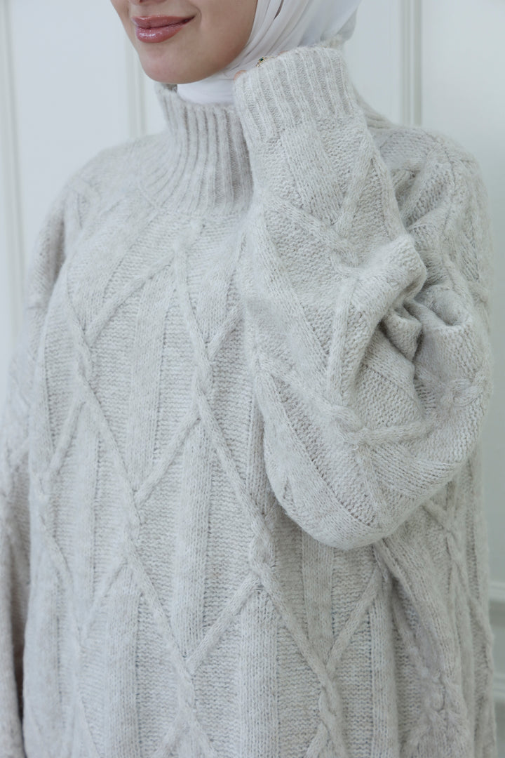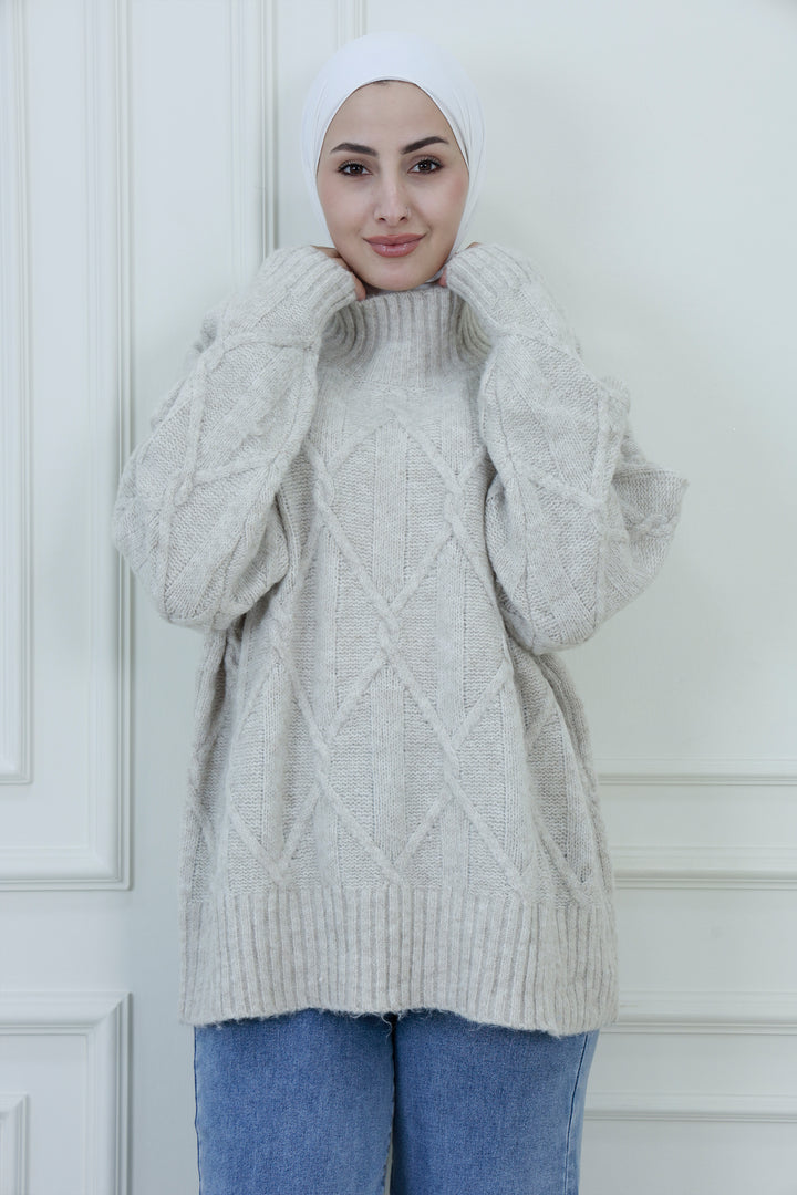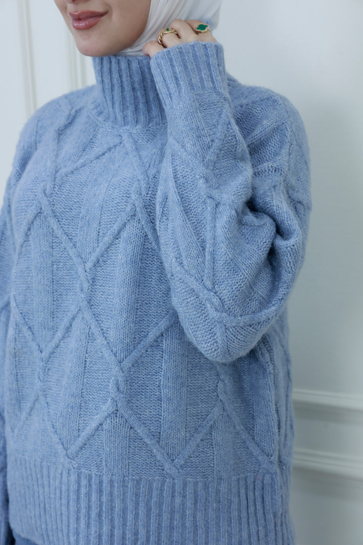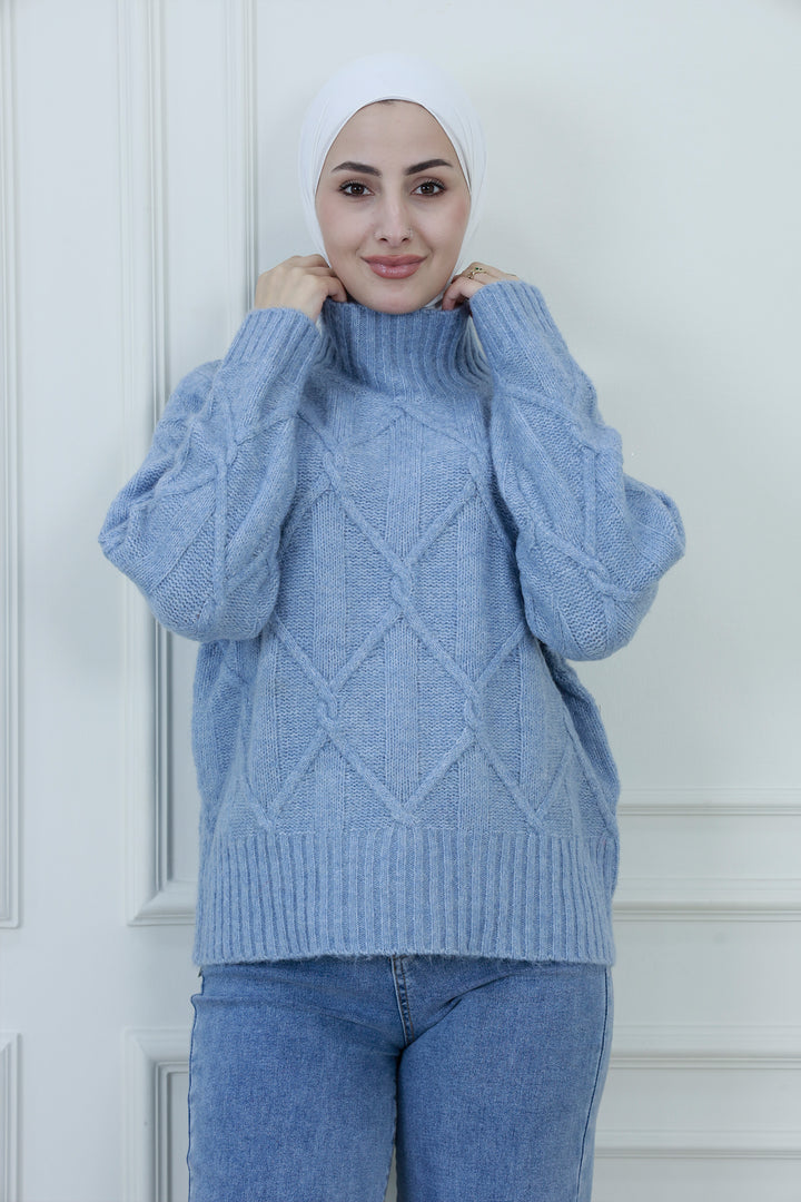 Bold and cozy, this textured knit sweater is designed to stand out while keeping you warm. Featuring a raised diamond pattern and a thick turtleneck collar, it offers full coverage and a snug fit ideal for colder seasons. The ribbed cuffs and hem add structure, while the vibrant color brings energy to modest fashion.