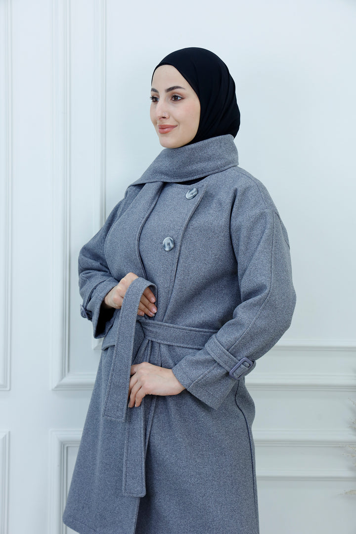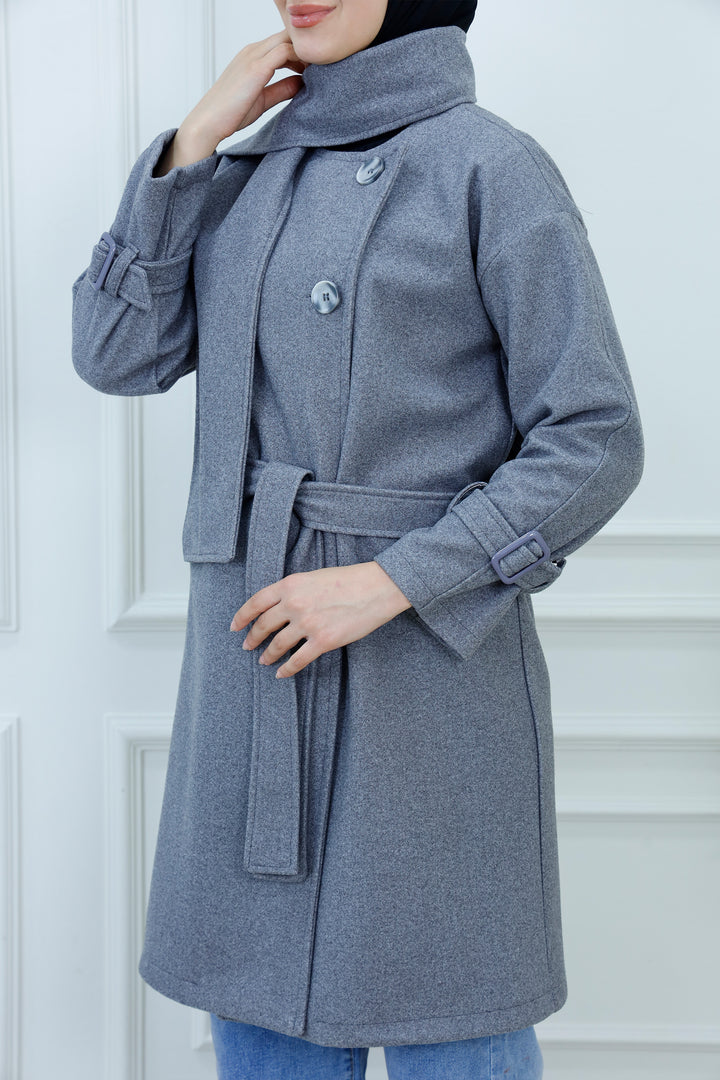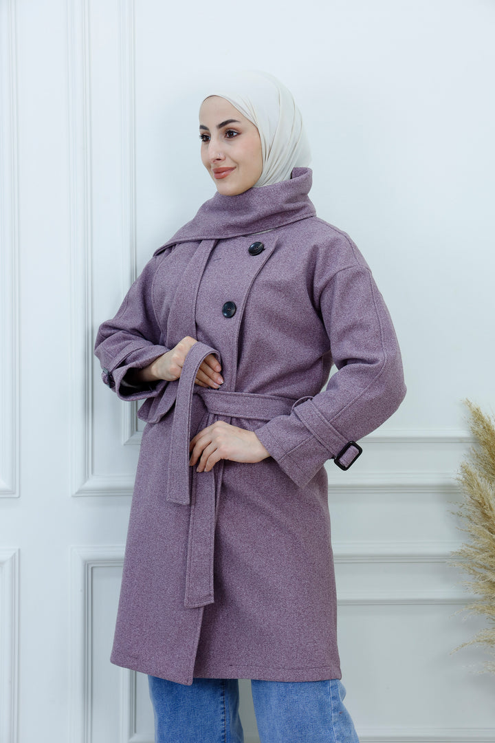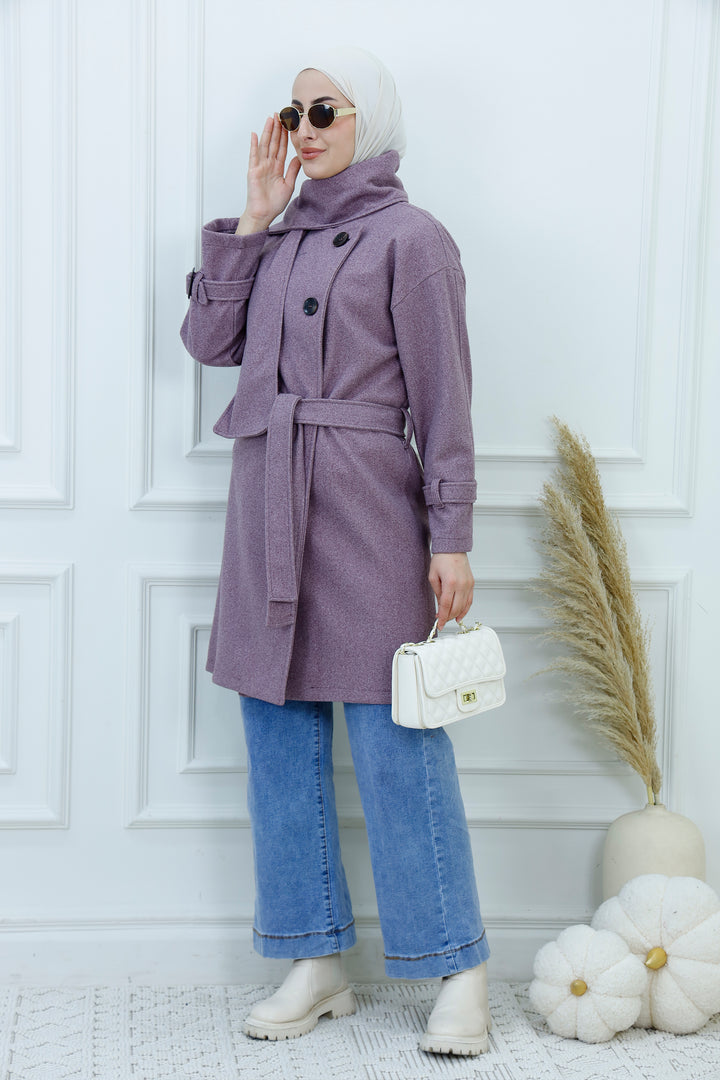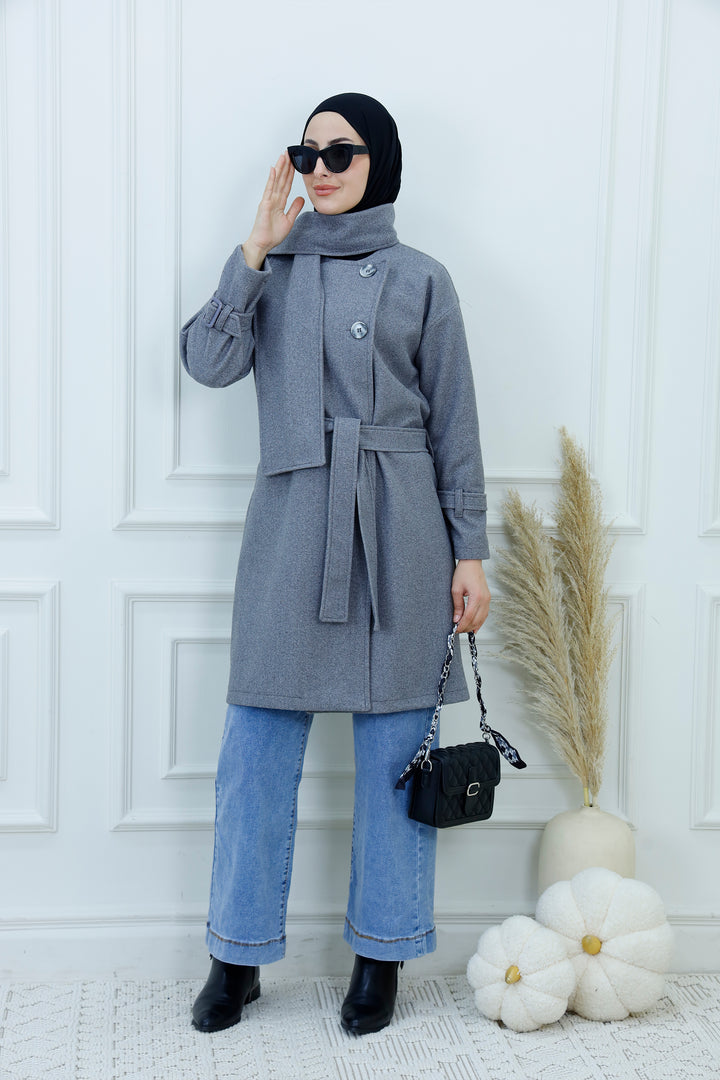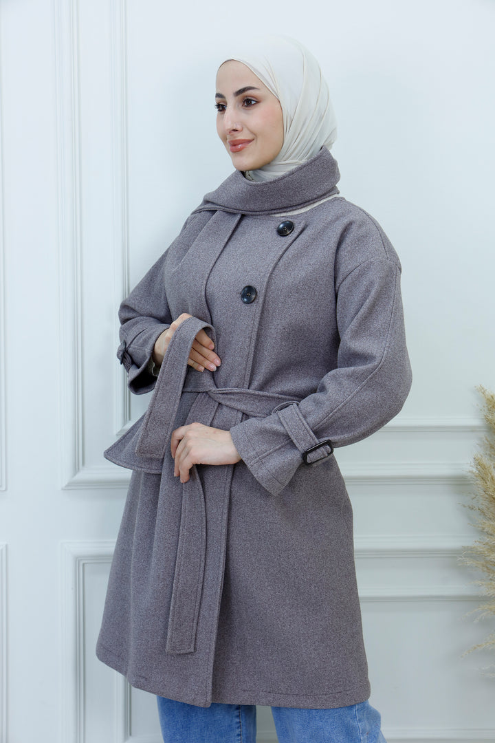 This women's belted jacket with scarf is a chic and practical choice for cooler days. Featuring a structured silhouette, high collar, and decorative buttons, it’s designed for warmth and style. The matching scarf adds a cozy layer and completes the look with elegance. Perfect for casual outings, work, or weekend wear, this jacket pairs effortlessly with jeans, boots, and neutral accessories.