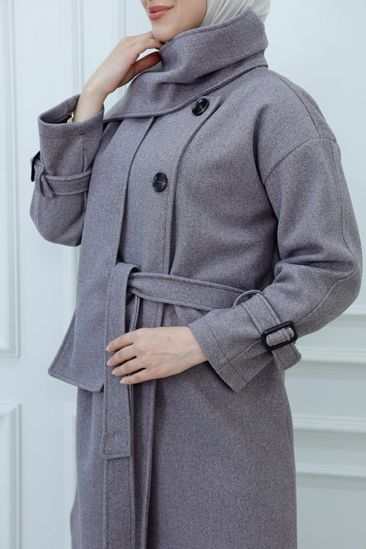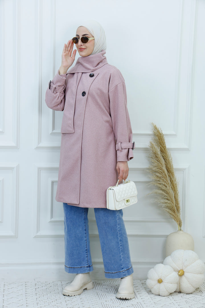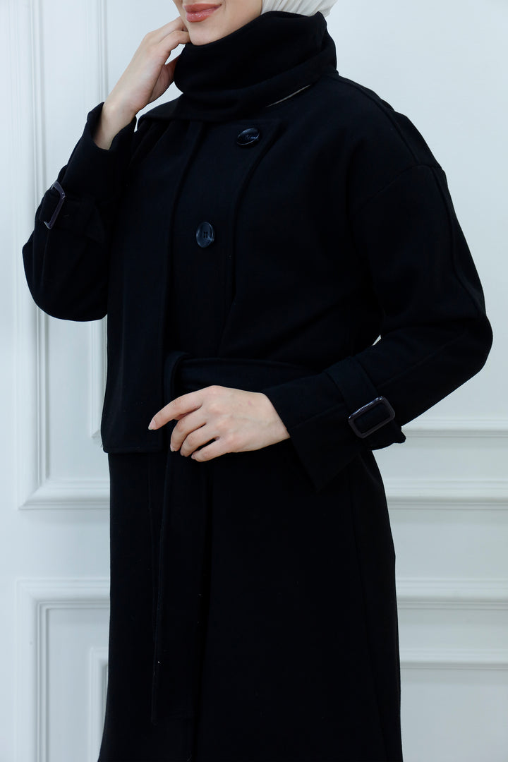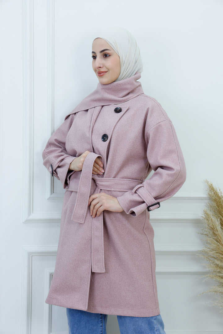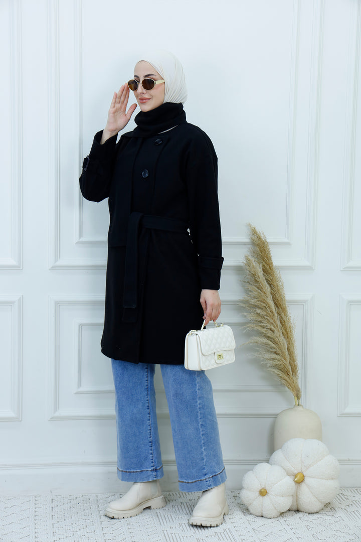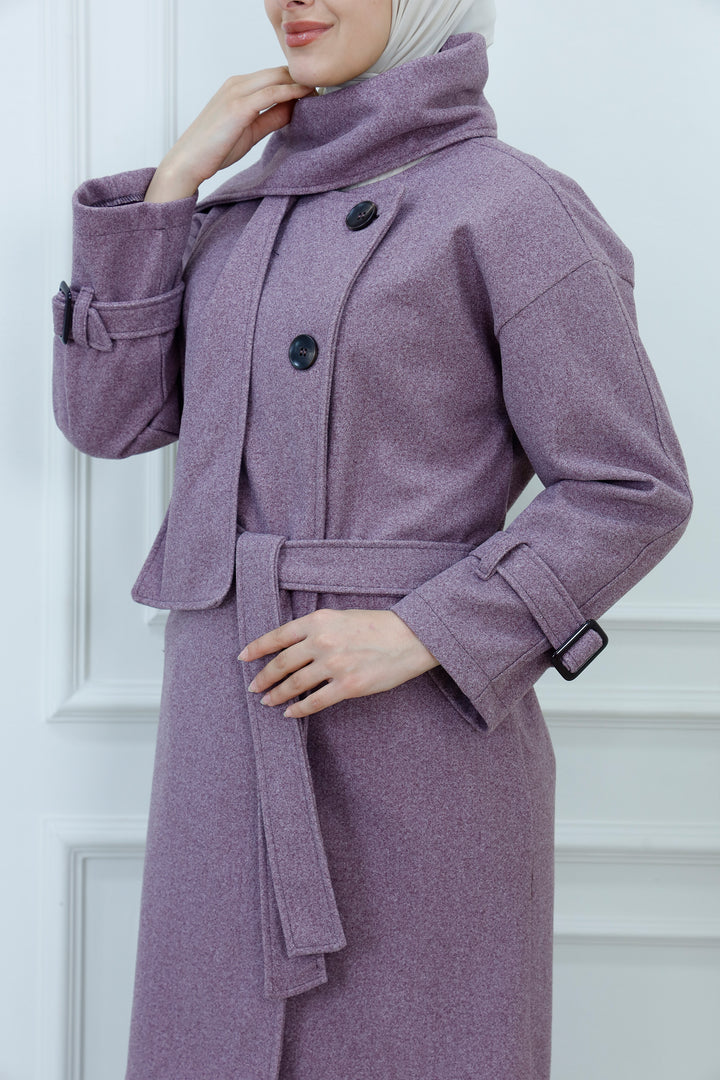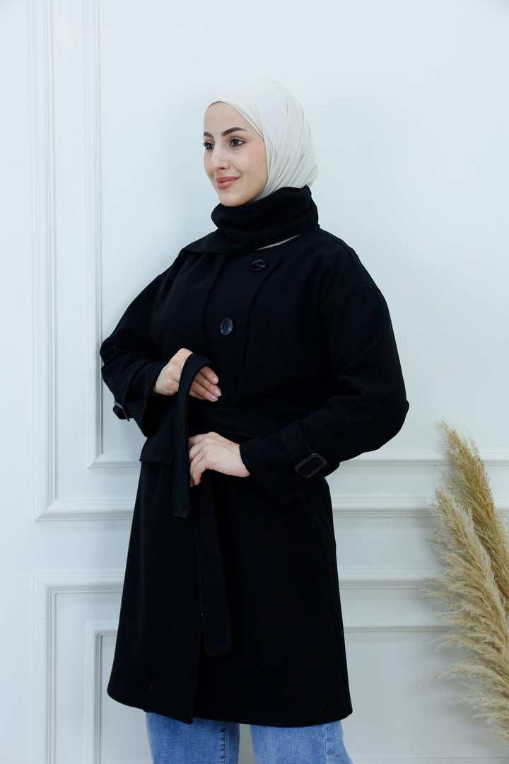 This women's belted jacket with scarf is a chic and practical choice for cooler days. Featuring a structured silhouette, high collar, and decorative buttons, it’s designed for warmth and style. The matching scarf adds a cozy layer and completes the look with elegance. Perfect for casual outings, work, or weekend wear, this jacket pairs effortlessly with jeans, boots, and neutral accessories.