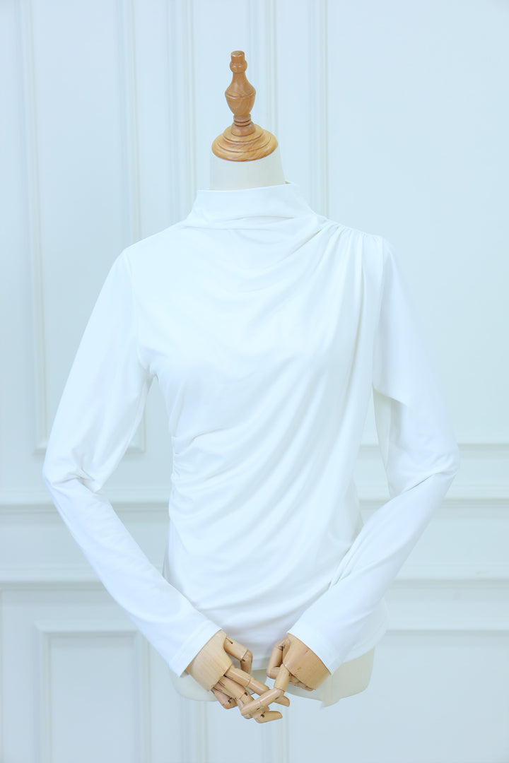 Details: Elevate your wardrobe with this elegant white long sleeve draped blouse for women. Featuring a high neckline, soft draped detailing, and a modern slim-fit silhouette, this versatile top is perfect for work, casual outings, or evening wear. Pair it with skirts, trousers, or jeans for a chic and timeless look. Ideal for minimalist fashion lovers and everyday elegance.